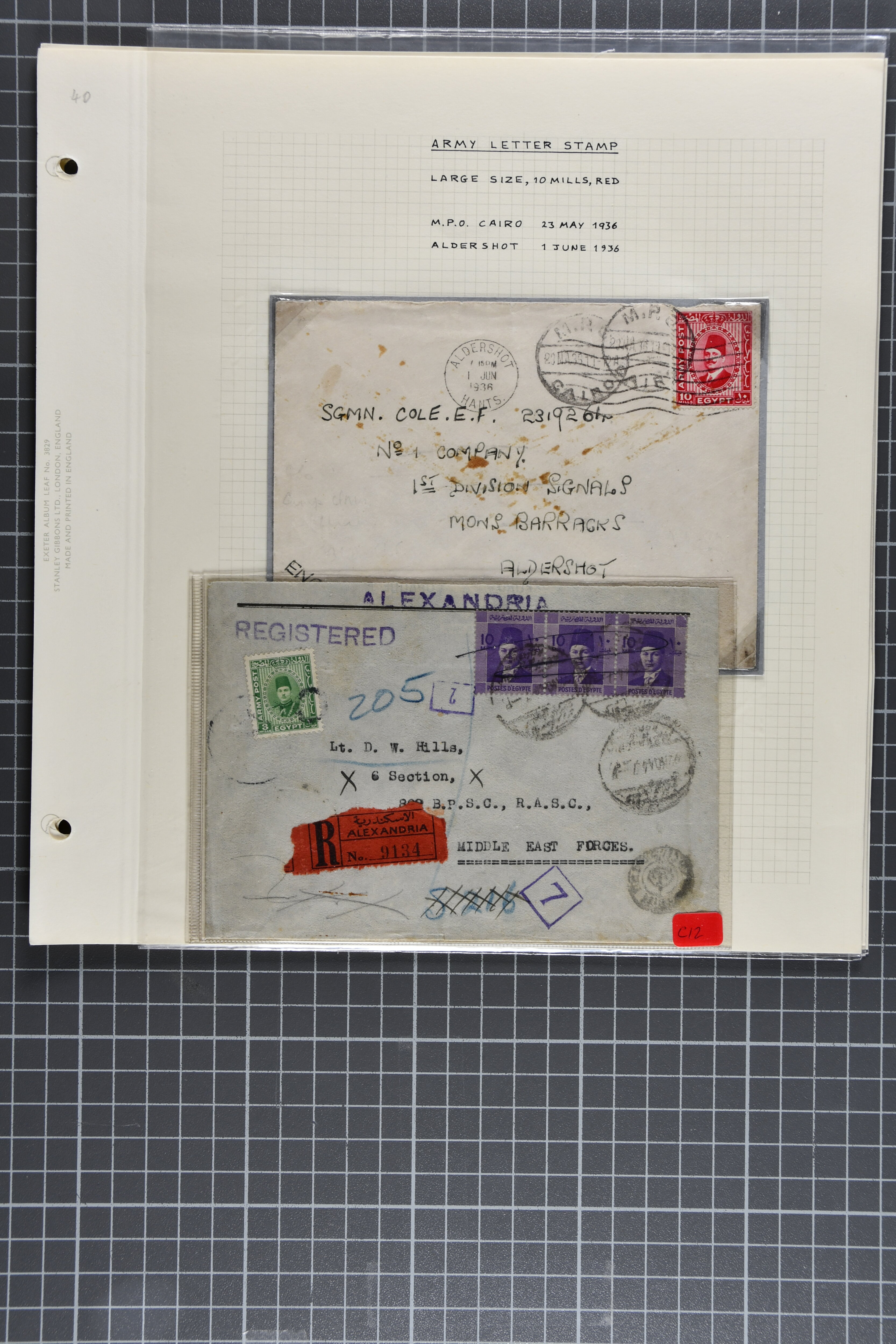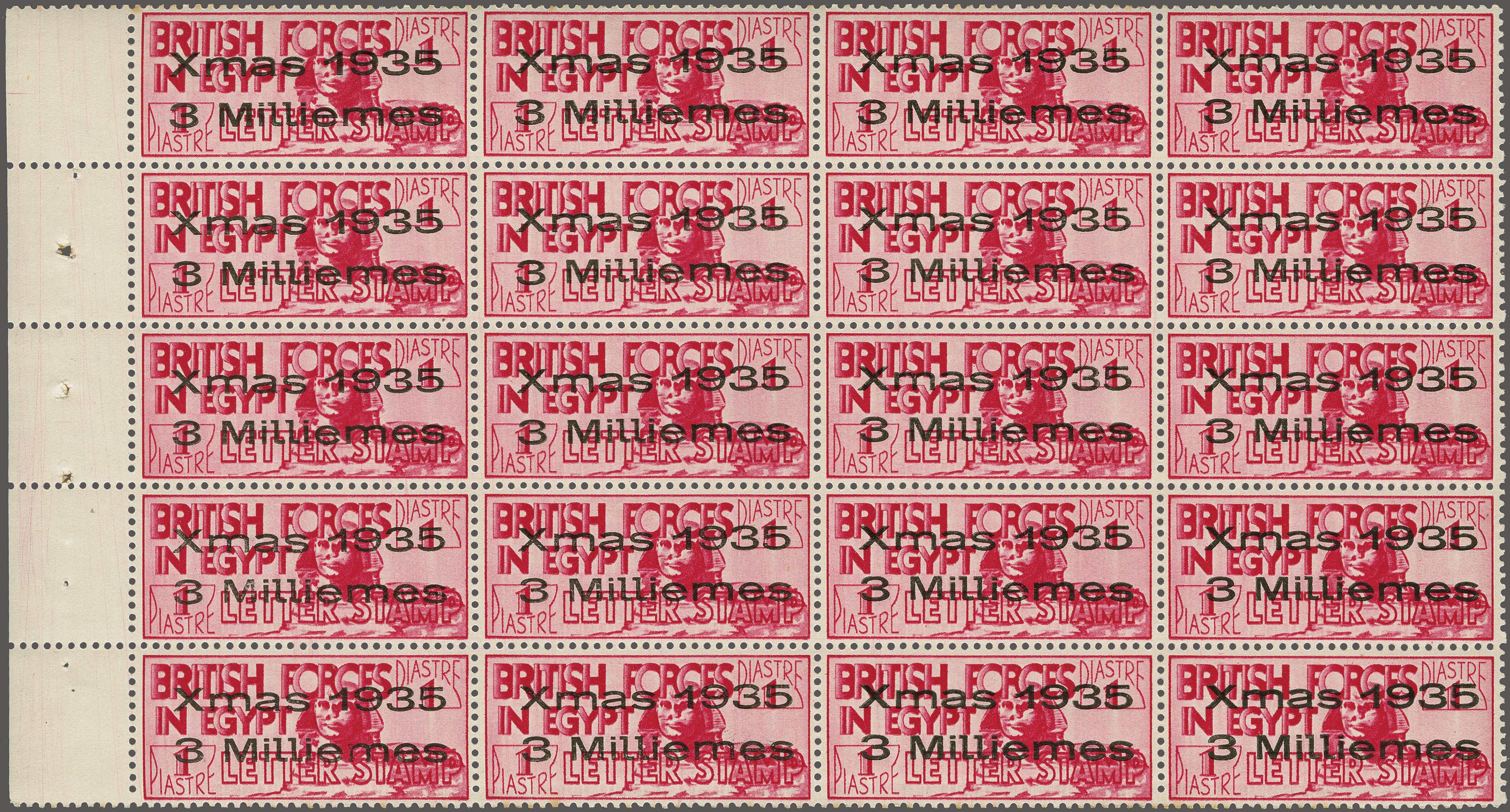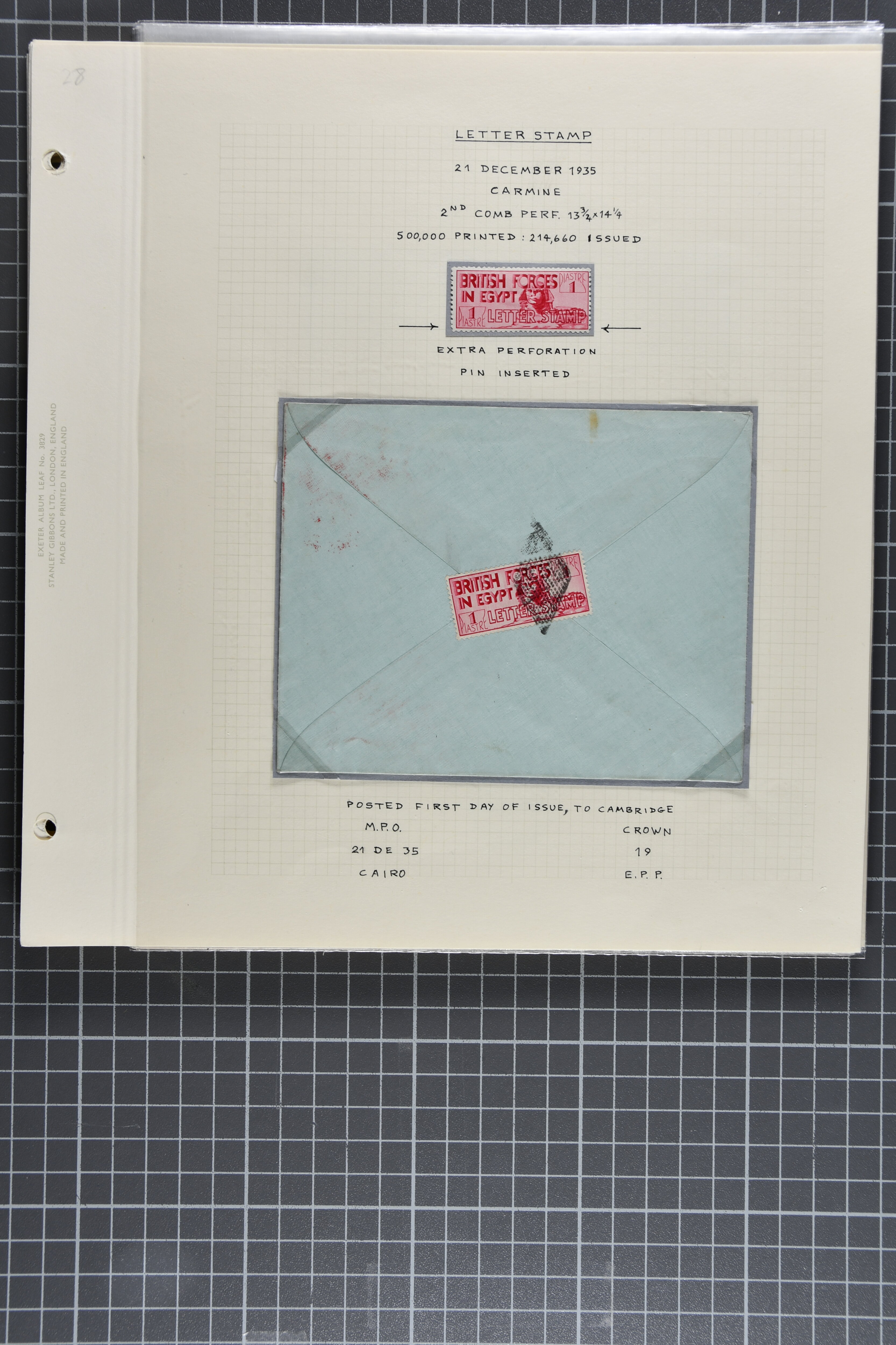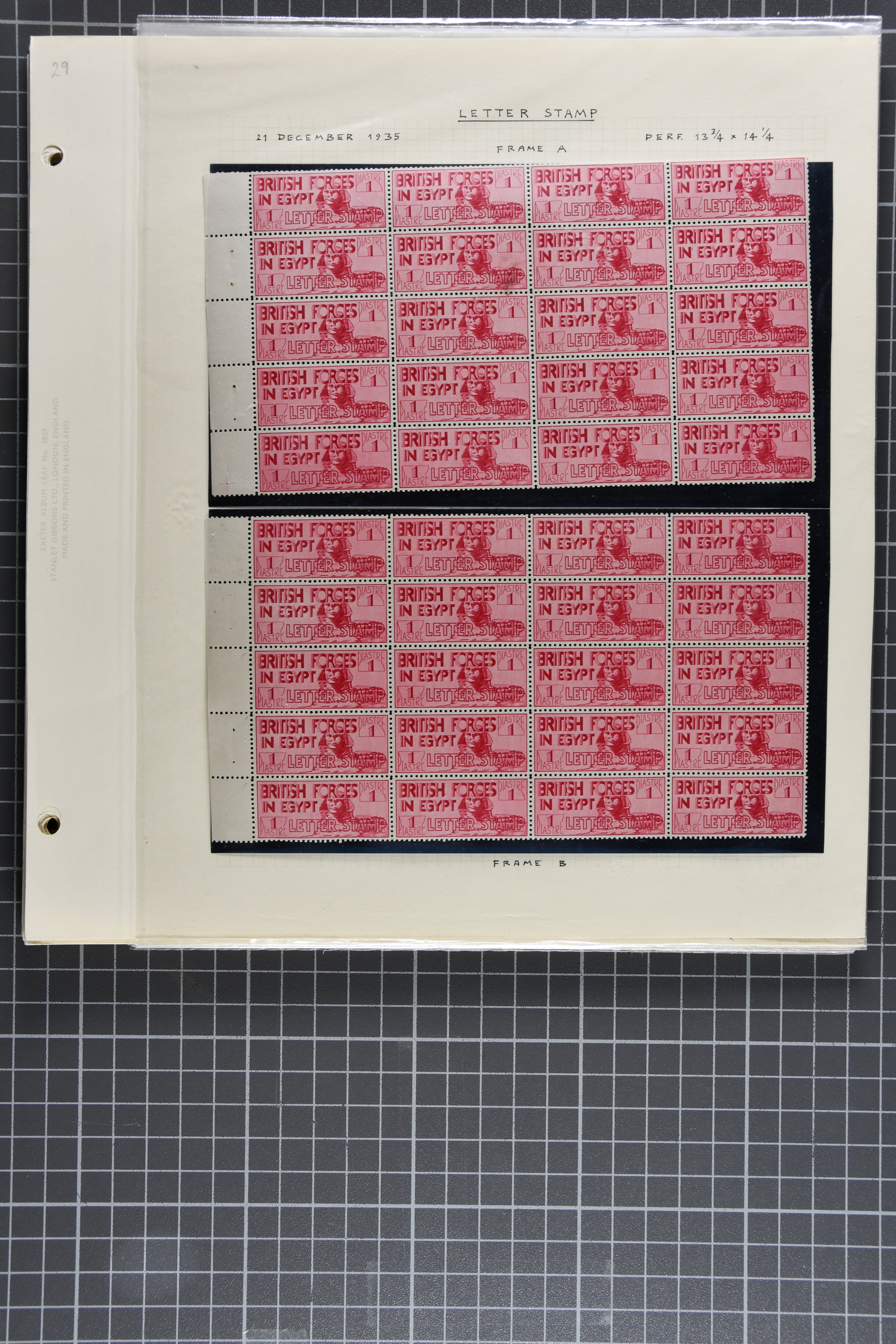 1094 cover/bof imageBritish Forces 1932/36: The collection on leaves with 1932 Postal Seal 1 pi. on cover, Letter Seal covers (3), 1934 1 pi. green unused and on cover, 1935 1 pi. carmine, perf. 13½ x 14, unused in two complete marginal panes of twenty (Gi = £ 720+) and usages on covers (4), 1935 Silver Jubilee 1 pi. ultramarine on cover addressed to Stanley Gibbons (Gi = £ 300); 1936 3 m. Control block of six and usages on FDC and two cards, 10 m. carmine unused and a used block of four and an FDC and another cover; 1939 small format 3 m. green on registered cover with three Egypt 10 m. violet and re-addressed with 3 m. green between FPO's (Nov 23-Nov 27) - this value rare on letter, 10 m. carmine covers (2). An interesting lot (41 items). (Image 1) (Image 2) (Image 3) (Image 4) (Image 5) (Image 6) (Image 7) (Image 8) (Image 9) (Image 10) (Image 11) (Image 12) (Image 13) (Image 14) (Image 15) (Image 16) (Image 17) (Image 18) (Image 19) (Image 20)