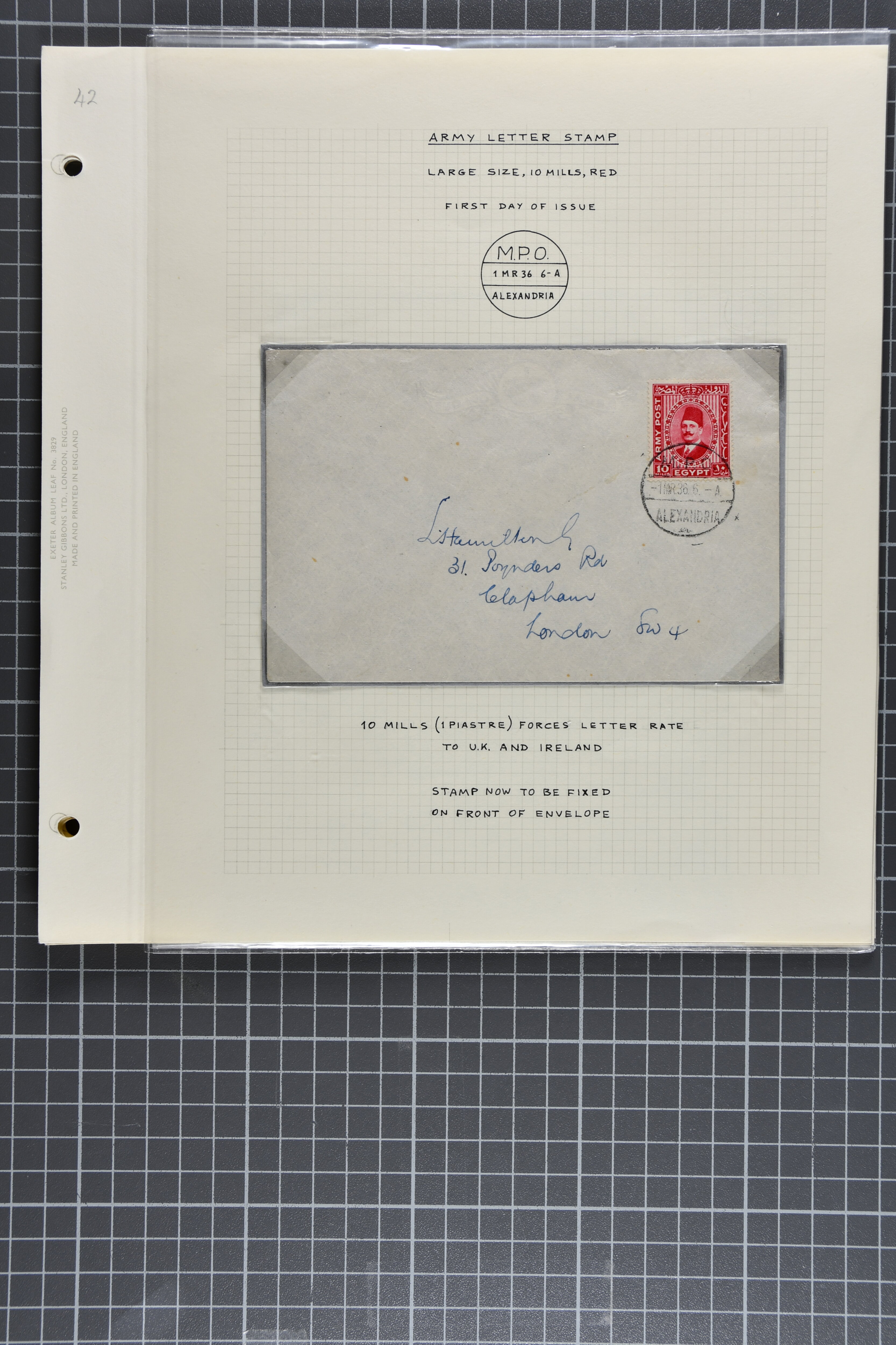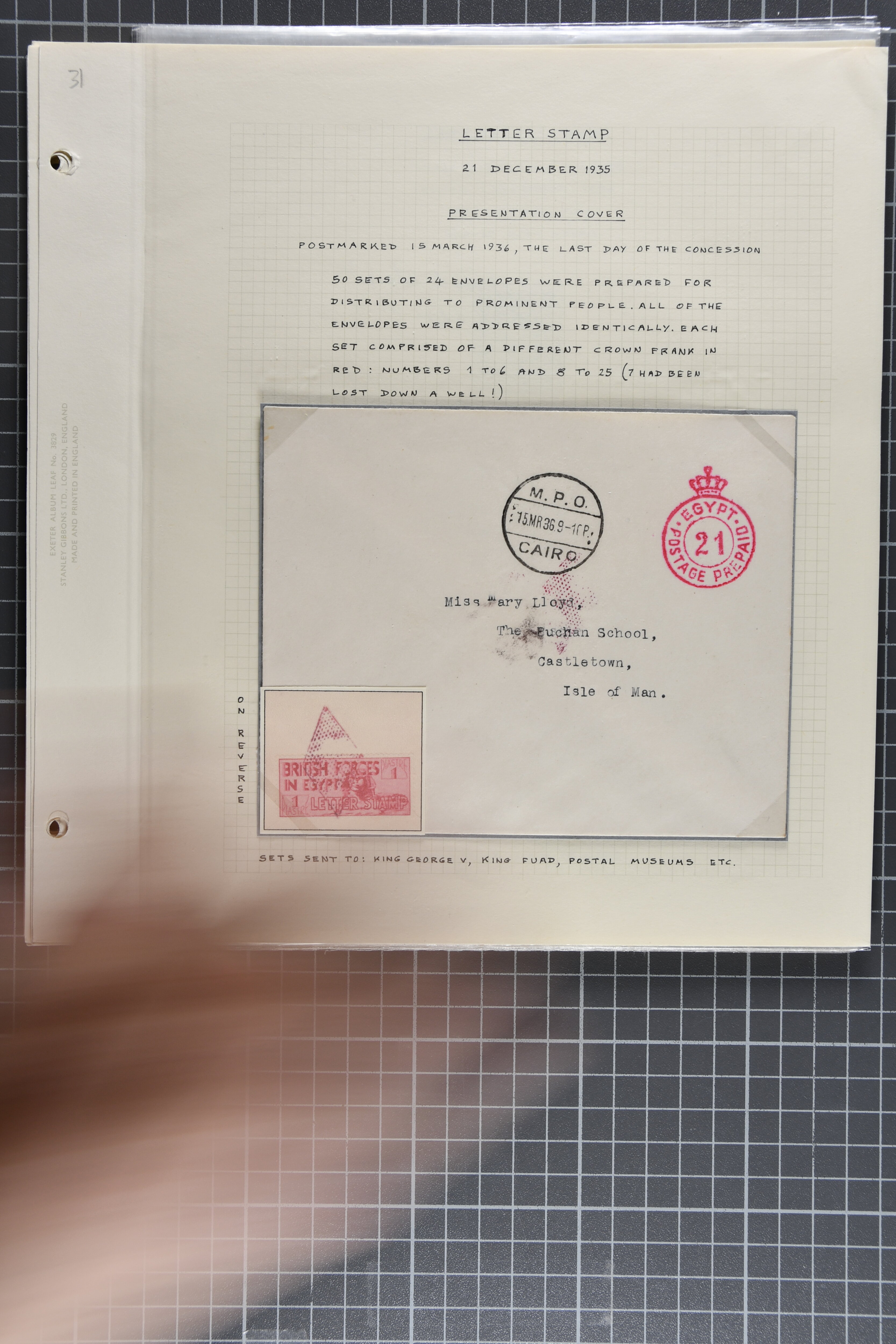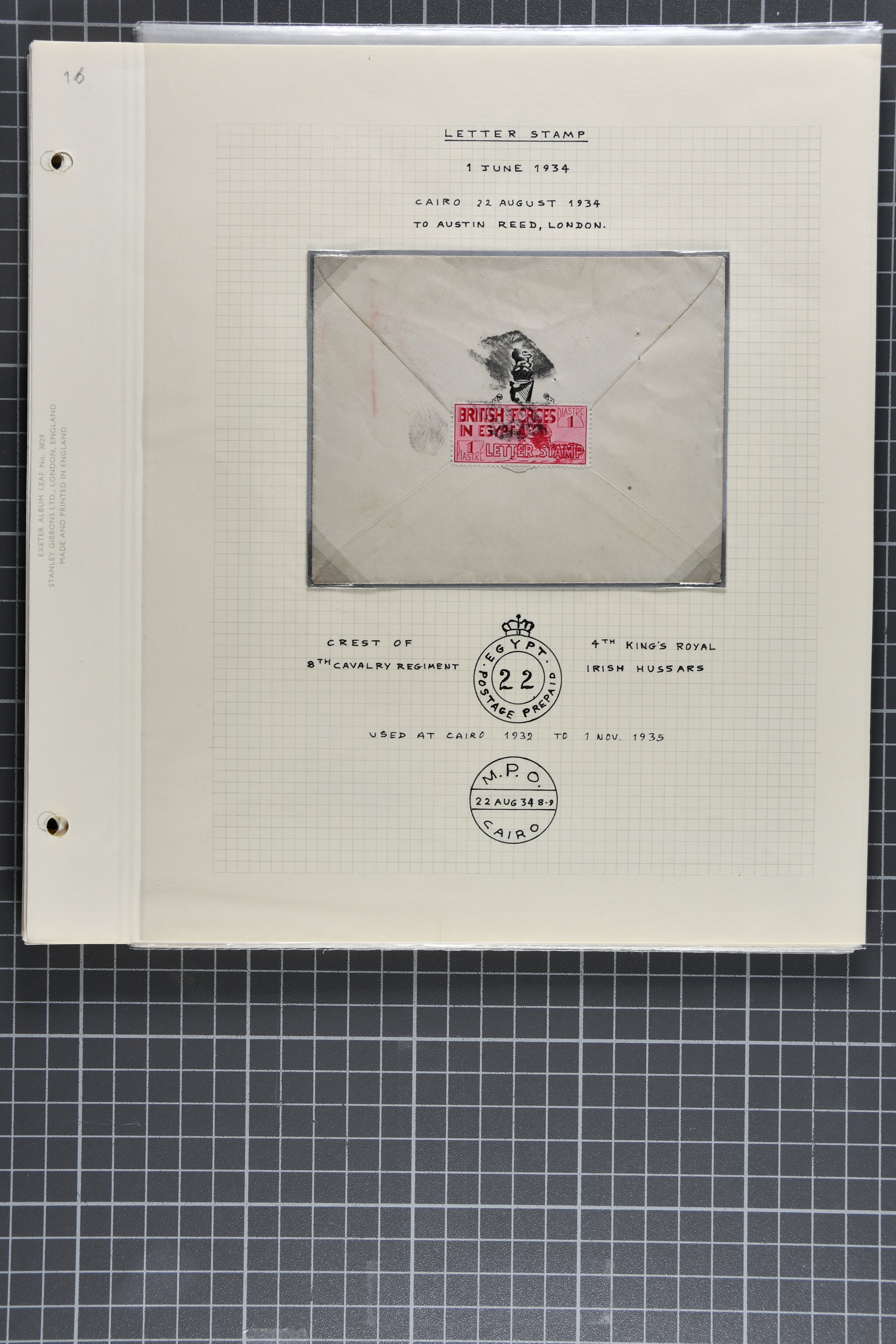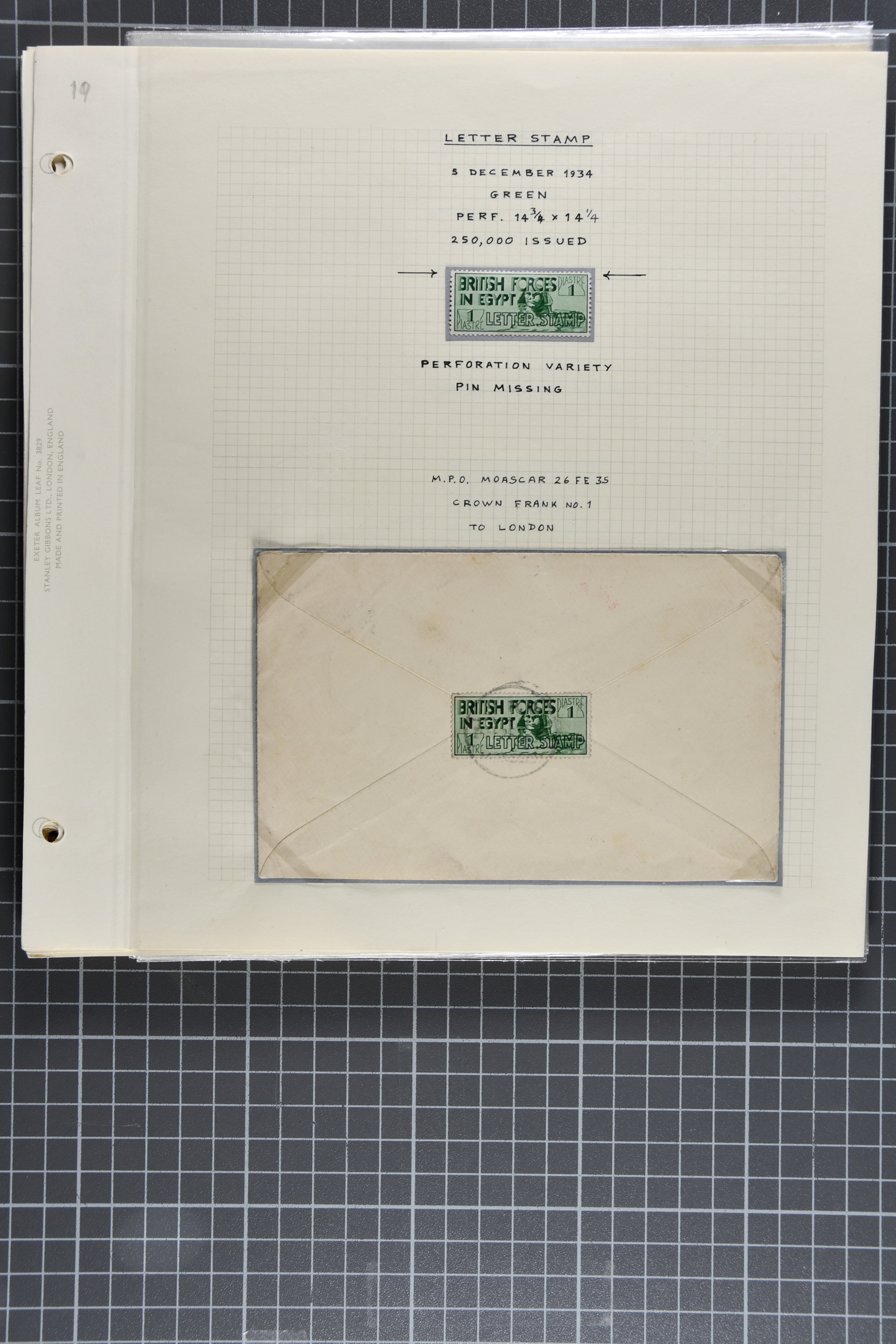 1094 cover/bof imageBritish Forces 1932/36: The collection on leaves with 1932 Postal Seal 1 pi. on cover, Letter Seal covers (3), 1934 1 pi. green unused and on cover, 1935 1 pi. carmine, perf. 13½ x 14, unused in two complete marginal panes of twenty (Gi = £ 720+) and usages on covers (4), 1935 Silver Jubilee 1 pi. ultramarine on cover addressed to Stanley Gibbons (Gi = £ 300); 1936 3 m. Control block of six and usages on FDC and two cards, 10 m. carmine unused and a used block of four and an FDC and another cover; 1939 small format 3 m. green on registered cover with three Egypt 10 m. violet and re-addressed with 3 m. green between FPO's (Nov 23-Nov 27) - this value rare on letter, 10 m. carmine covers (2). An interesting lot (41 items). (Image 1) (Image 2) (Image 3) (Image 4) (Image 5) (Image 6) (Image 7) (Image 8) (Image 9) (Image 10) (Image 11) (Image 12) (Image 13) (Image 14) (Image 15) (Image 16) (Image 17) (Image 18) (Image 19) (Image 20)