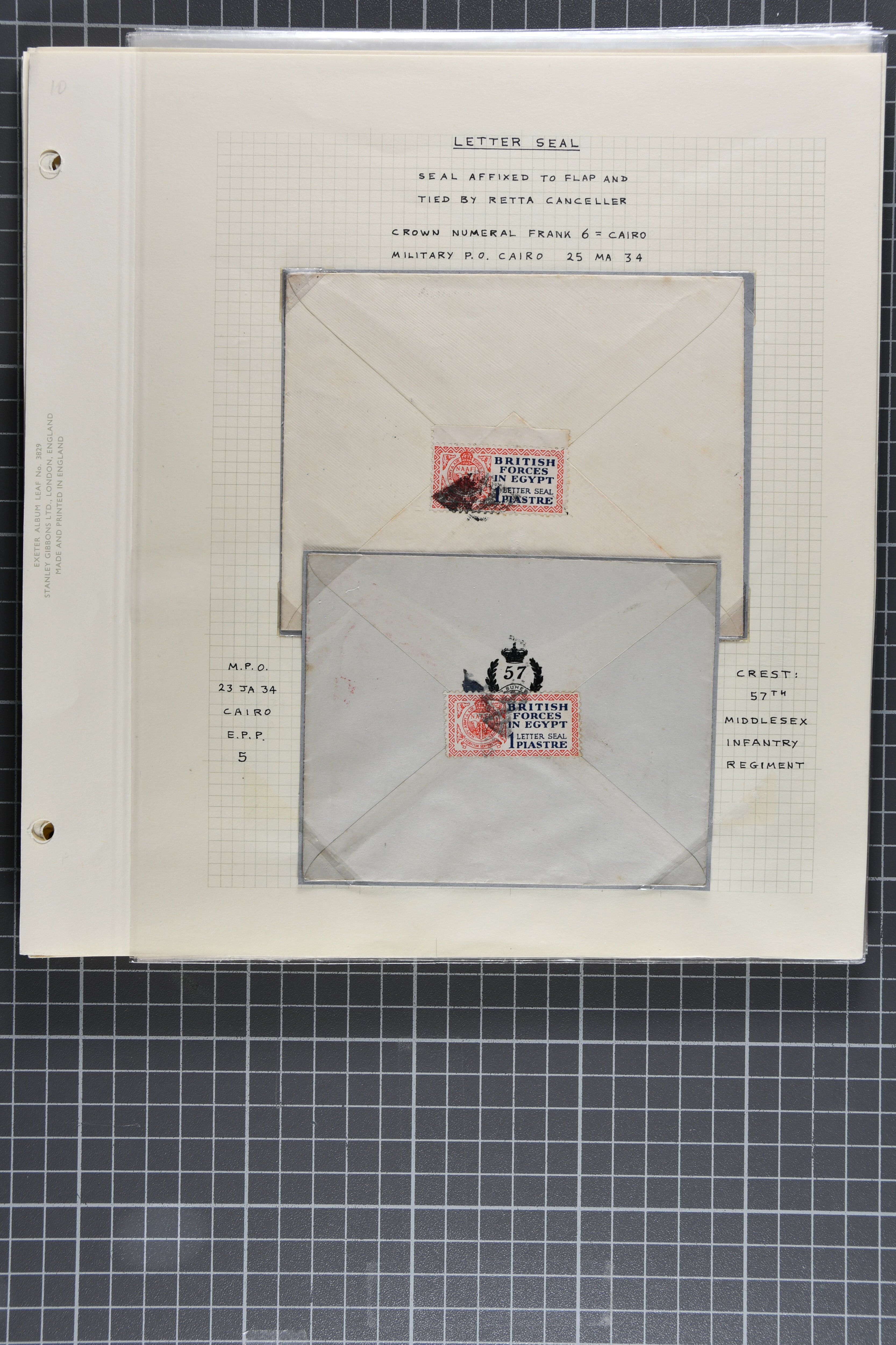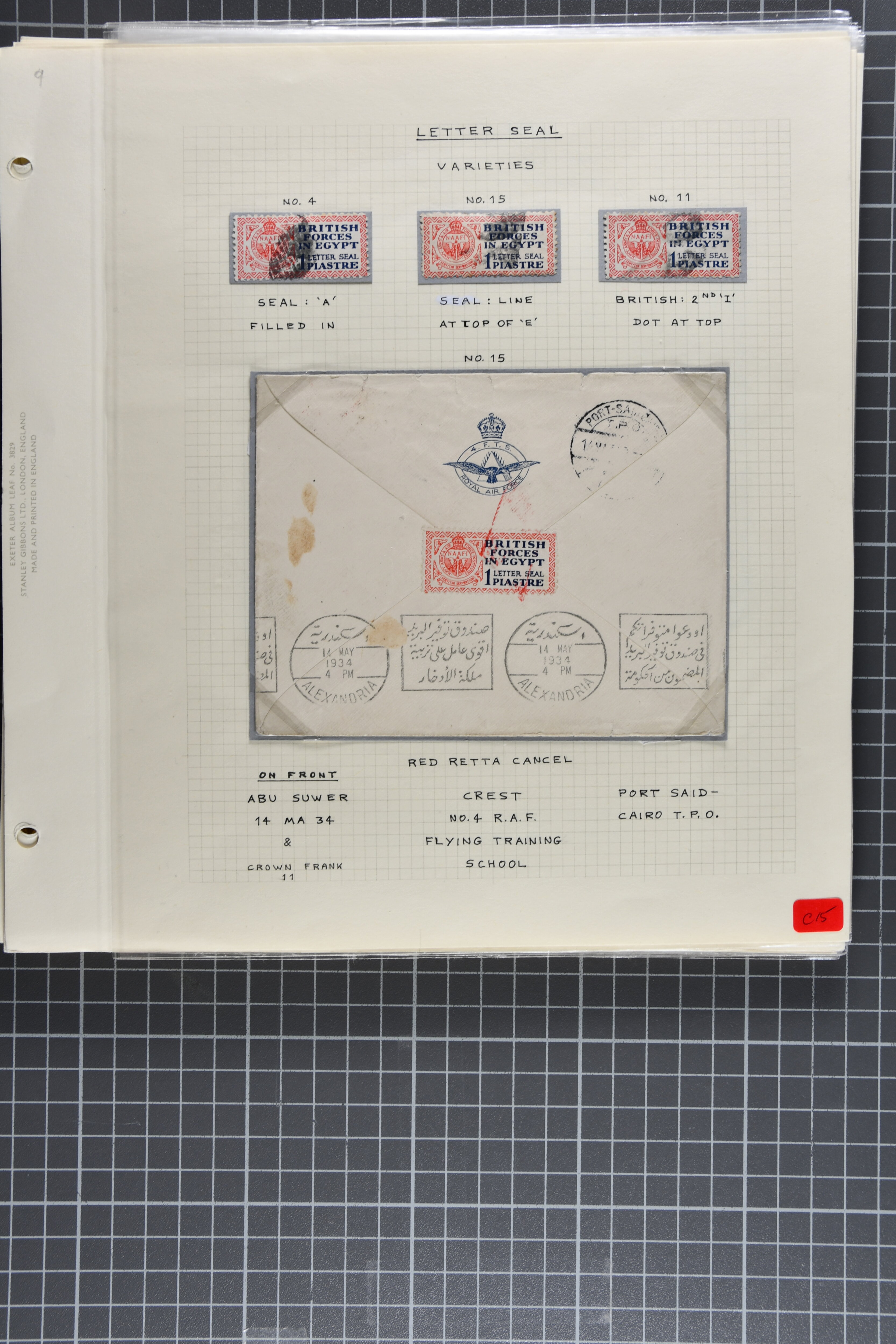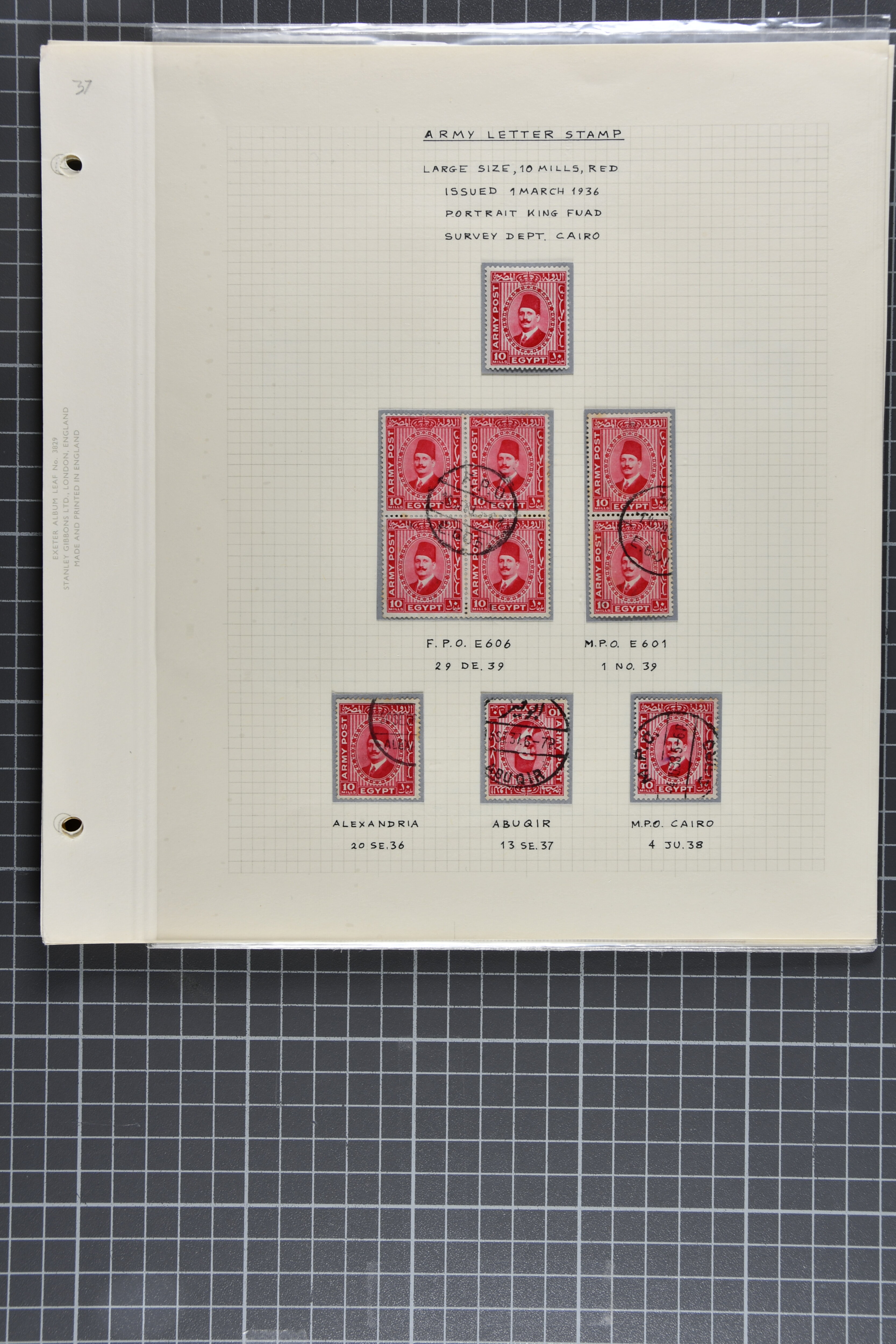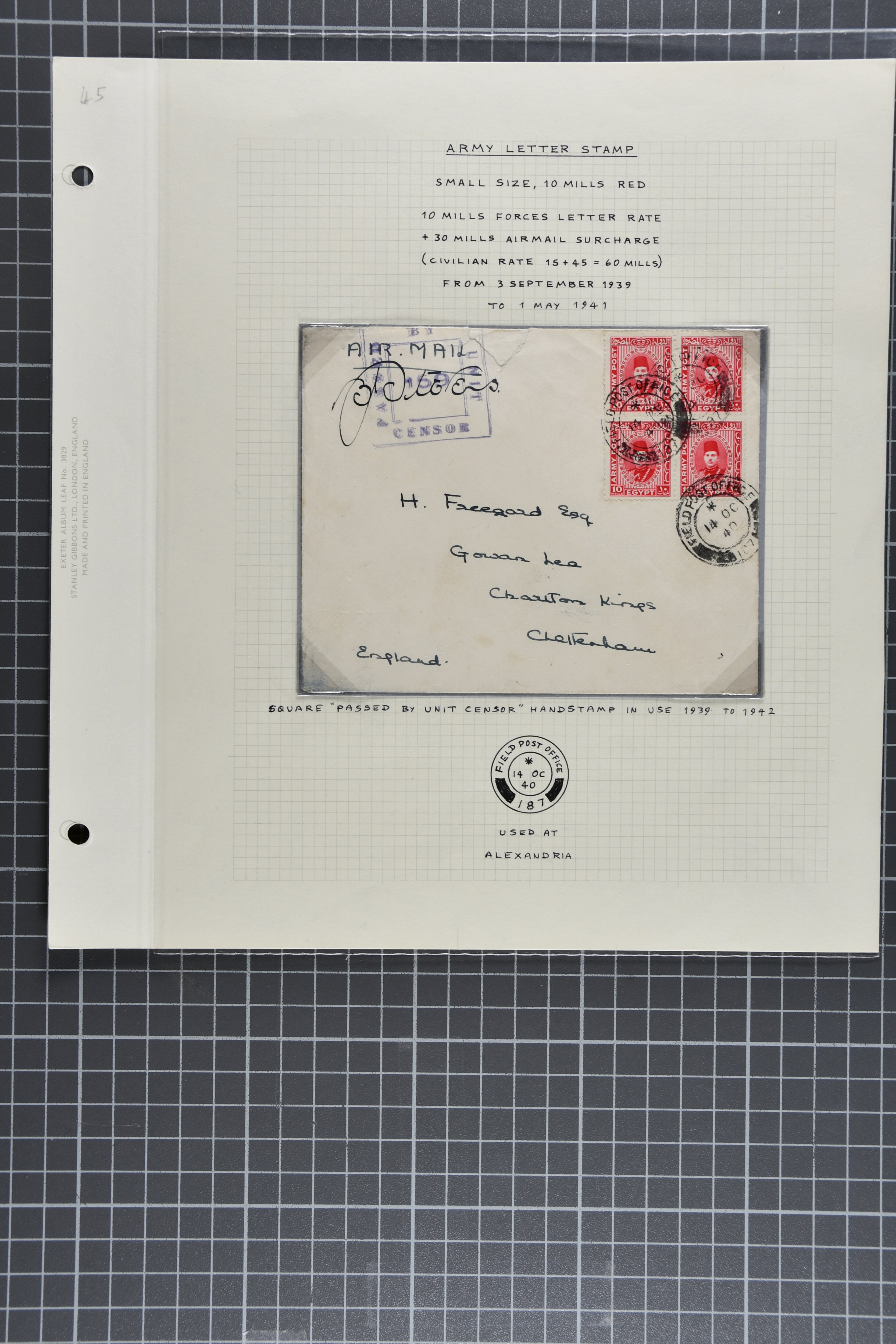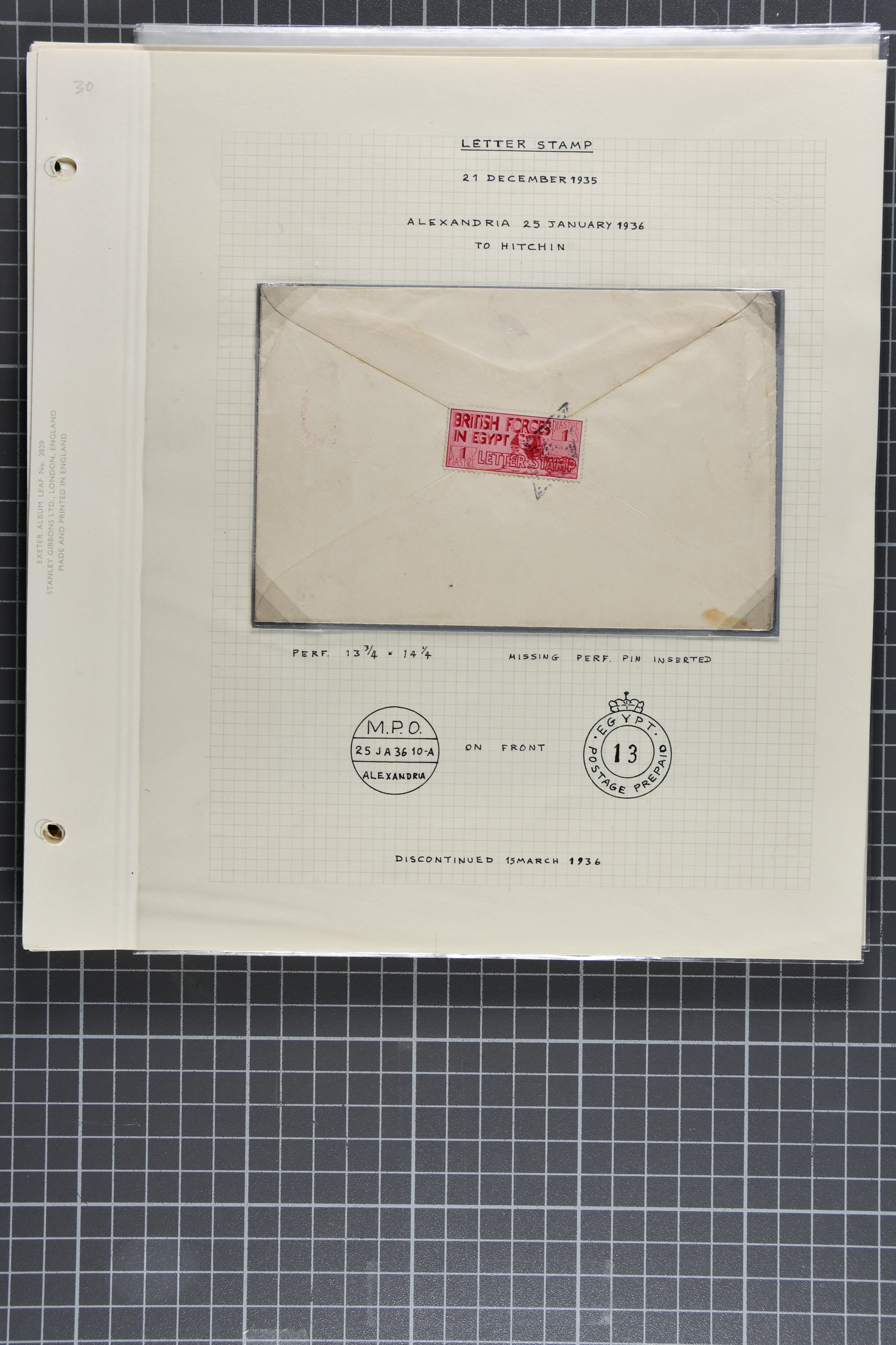 1094 cover/bof imageBritish Forces 1932/36: The collection on leaves with 1932 Postal Seal 1 pi. on cover, Letter Seal covers (3), 1934 1 pi. green unused and on cover, 1935 1 pi. carmine, perf. 13½ x 14, unused in two complete marginal panes of twenty (Gi = £ 720+) and usages on covers (4), 1935 Silver Jubilee 1 pi. ultramarine on cover addressed to Stanley Gibbons (Gi = £ 300); 1936 3 m. Control block of six and usages on FDC and two cards, 10 m. carmine unused and a used block of four and an FDC and another cover; 1939 small format 3 m. green on registered cover with three Egypt 10 m. violet and re-addressed with 3 m. green between FPO's (Nov 23-Nov 27) - this value rare on letter, 10 m. carmine covers (2). An interesting lot (41 items). (Image 1) (Image 2) (Image 3) (Image 4) (Image 5) (Image 6) (Image 7) (Image 8) (Image 9) (Image 10) (Image 11) (Image 12) (Image 13) (Image 14) (Image 15) (Image 16) (Image 17) (Image 18) (Image 19) (Image 20)