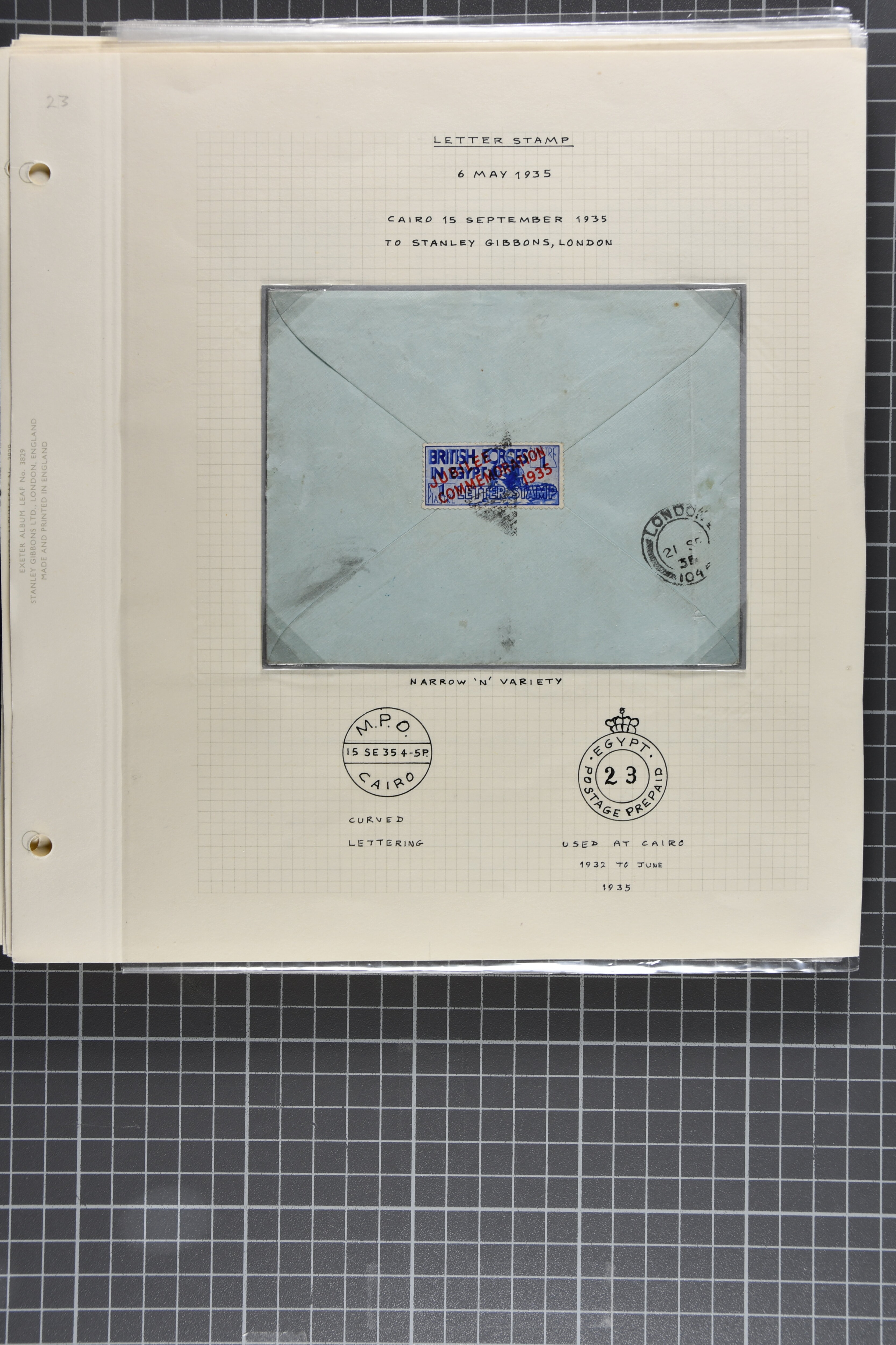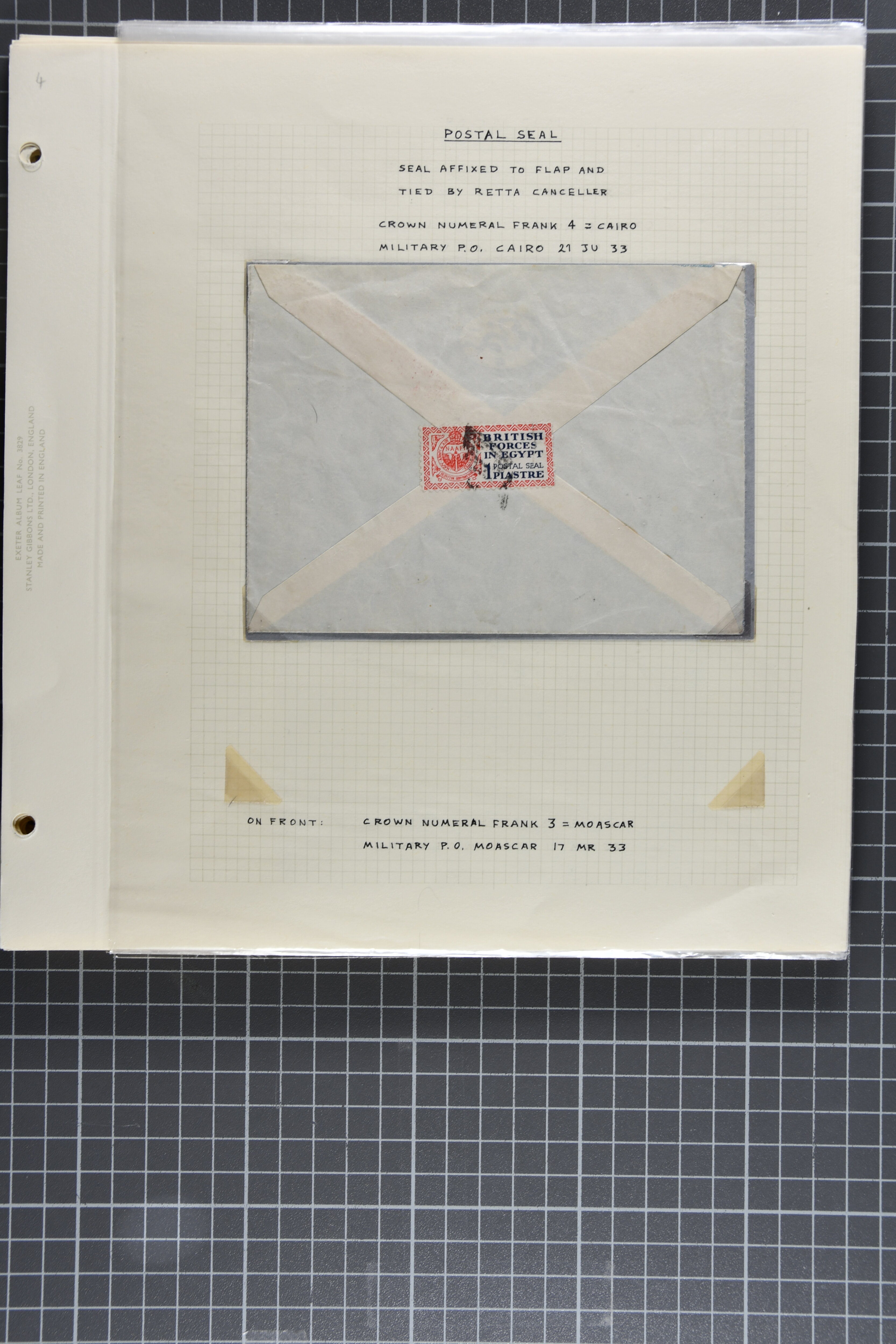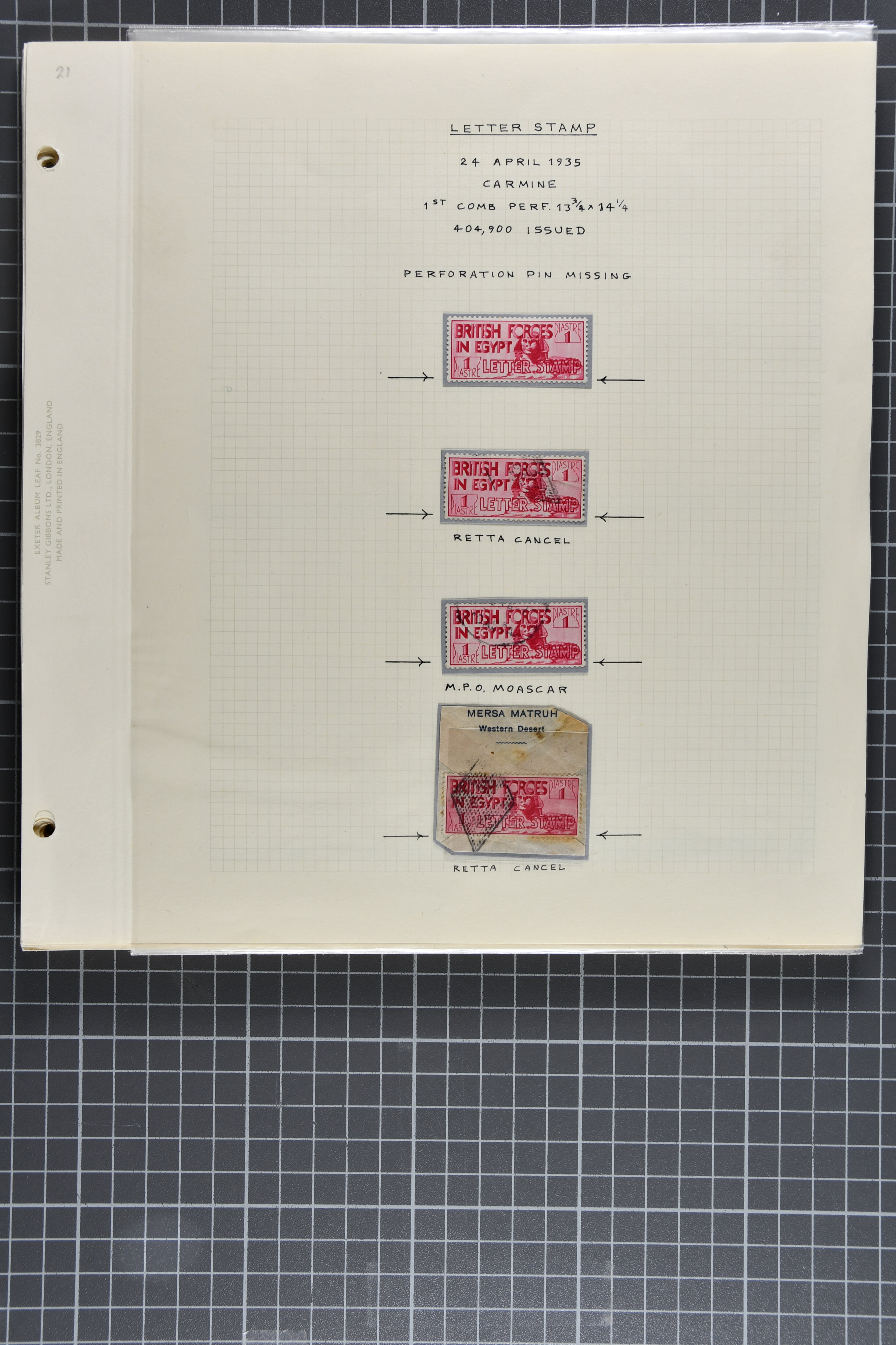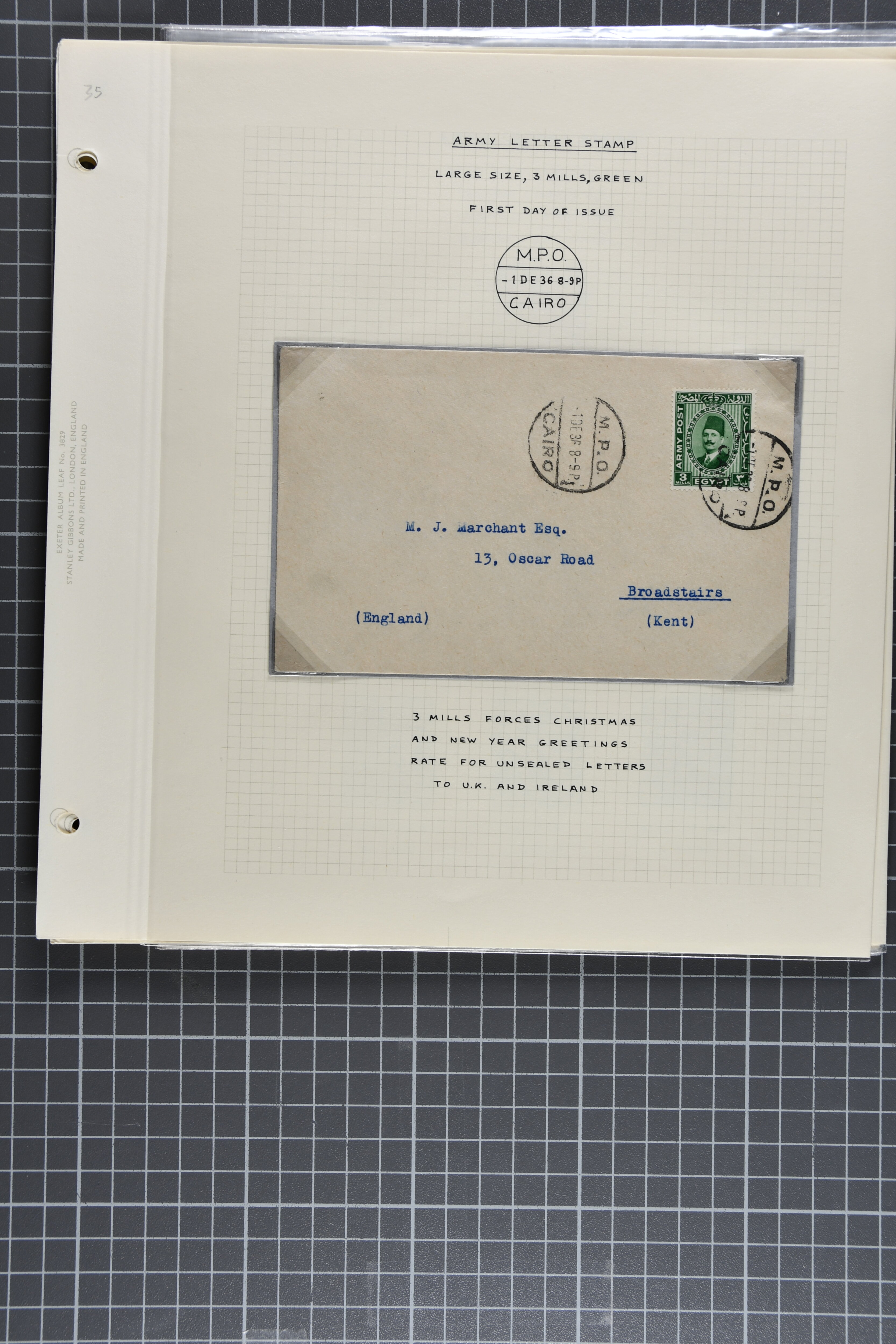 1094 cover/bof imageBritish Forces 1932/36: The collection on leaves with 1932 Postal Seal 1 pi. on cover, Letter Seal covers (3), 1934 1 pi. green unused and on cover, 1935 1 pi. carmine, perf. 13½ x 14, unused in two complete marginal panes of twenty (Gi = £ 720+) and usages on covers (4), 1935 Silver Jubilee 1 pi. ultramarine on cover addressed to Stanley Gibbons (Gi = £ 300); 1936 3 m. Control block of six and usages on FDC and two cards, 10 m. carmine unused and a used block of four and an FDC and another cover; 1939 small format 3 m. green on registered cover with three Egypt 10 m. violet and re-addressed with 3 m. green between FPO's (Nov 23-Nov 27) - this value rare on letter, 10 m. carmine covers (2). An interesting lot (41 items). (Image 1) (Image 2) (Image 3) (Image 4) (Image 5) (Image 6) (Image 7) (Image 8) (Image 9) (Image 10) (Image 11) (Image 12) (Image 13) (Image 14) (Image 15) (Image 16) (Image 17) (Image 18) (Image 19) (Image 20)