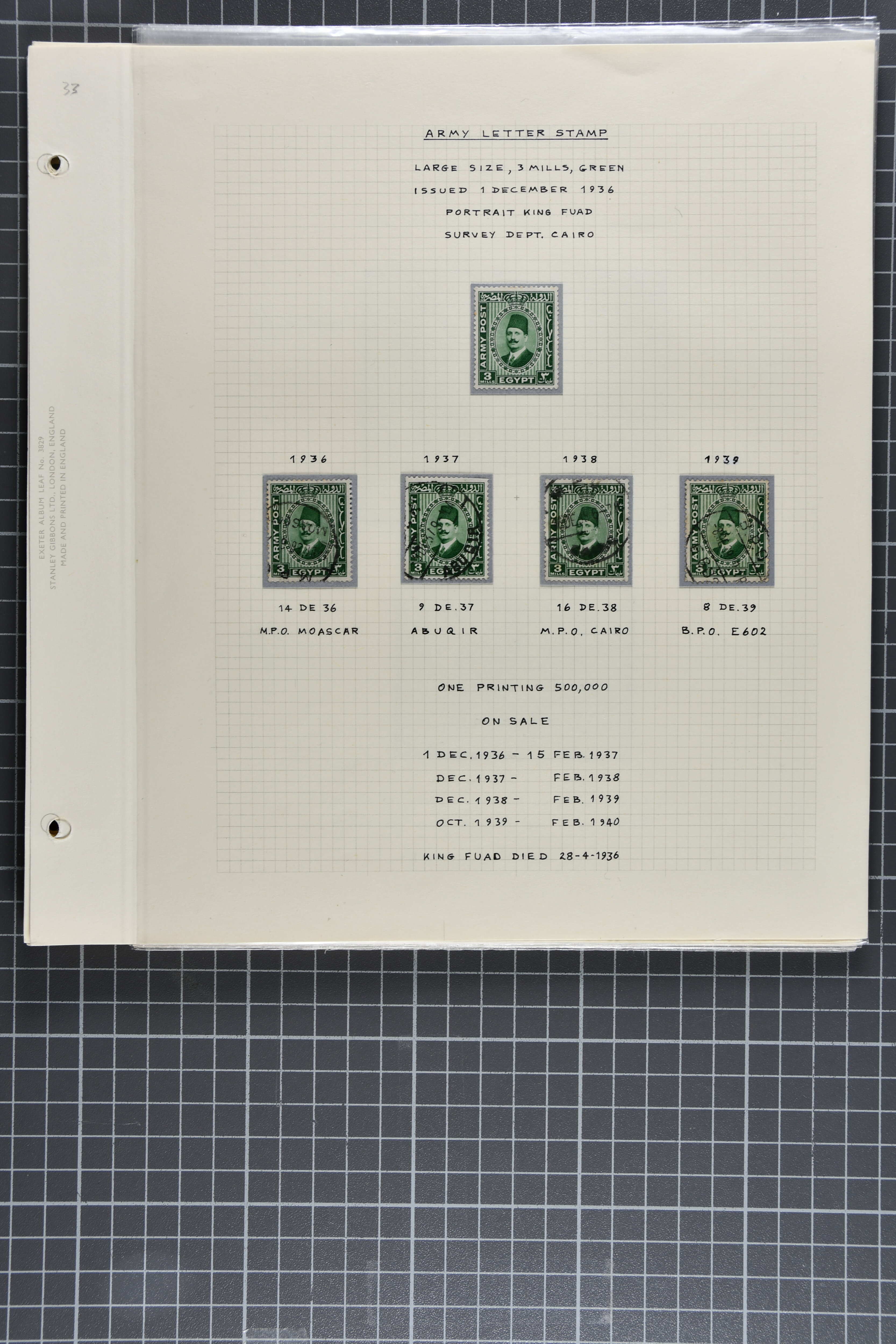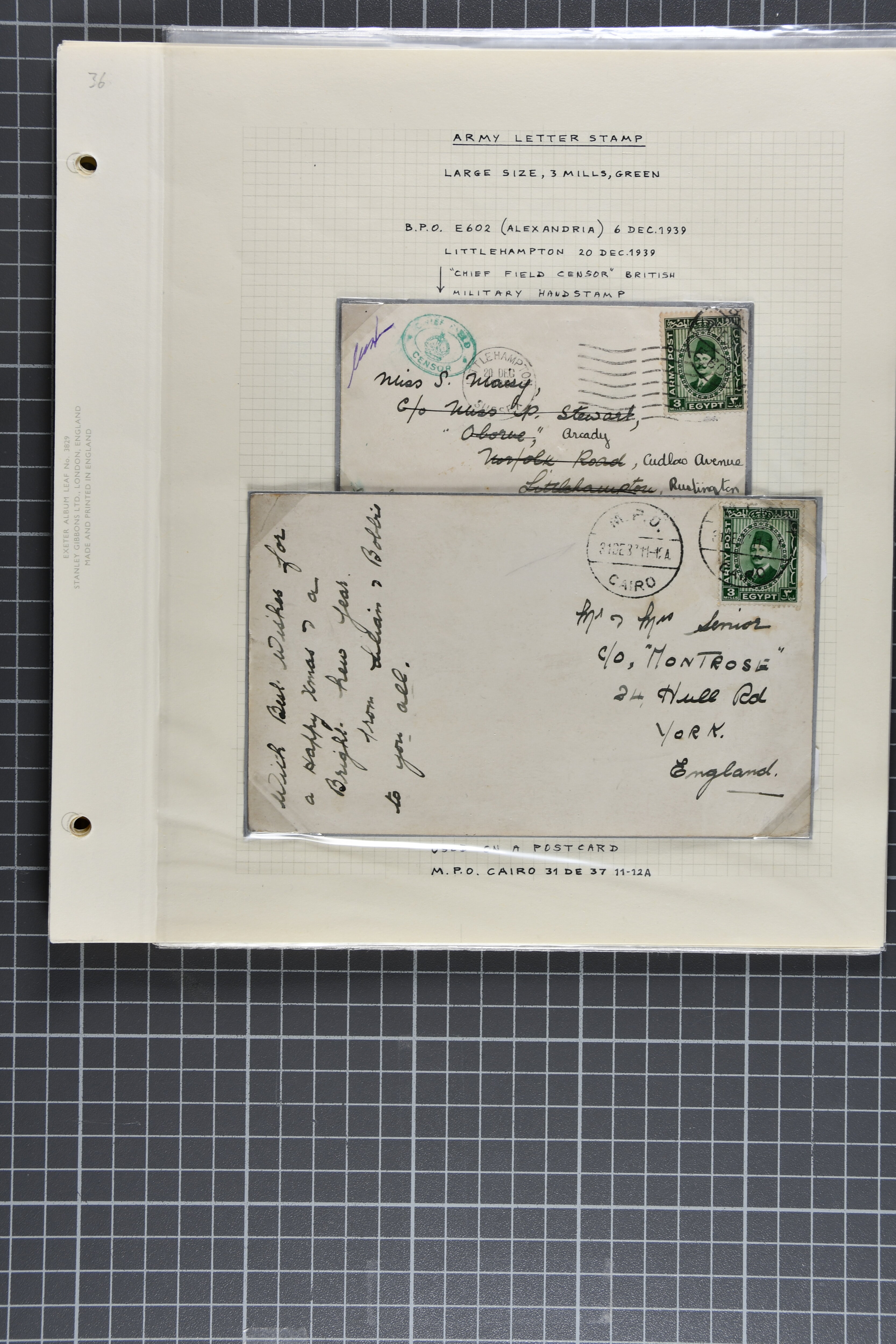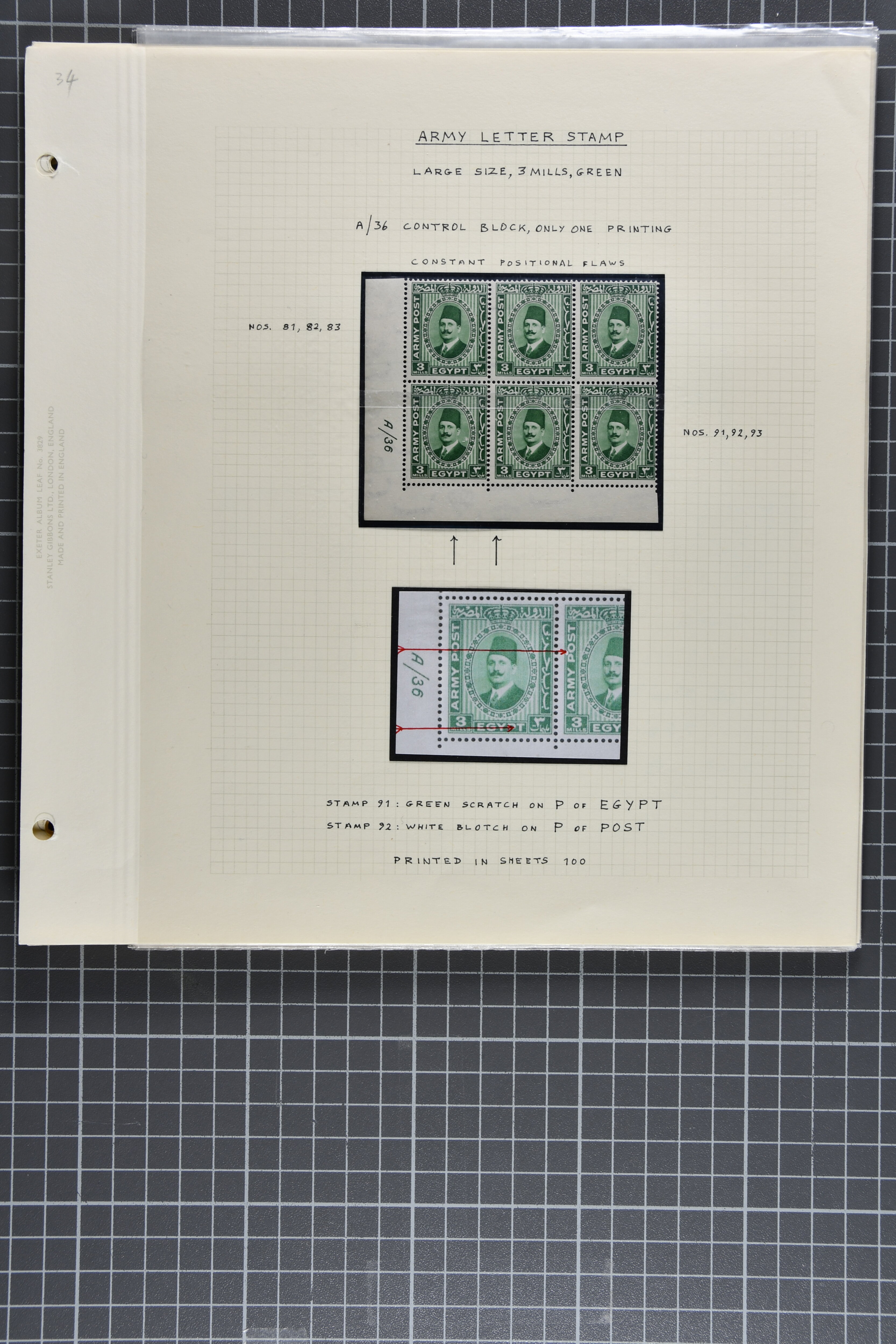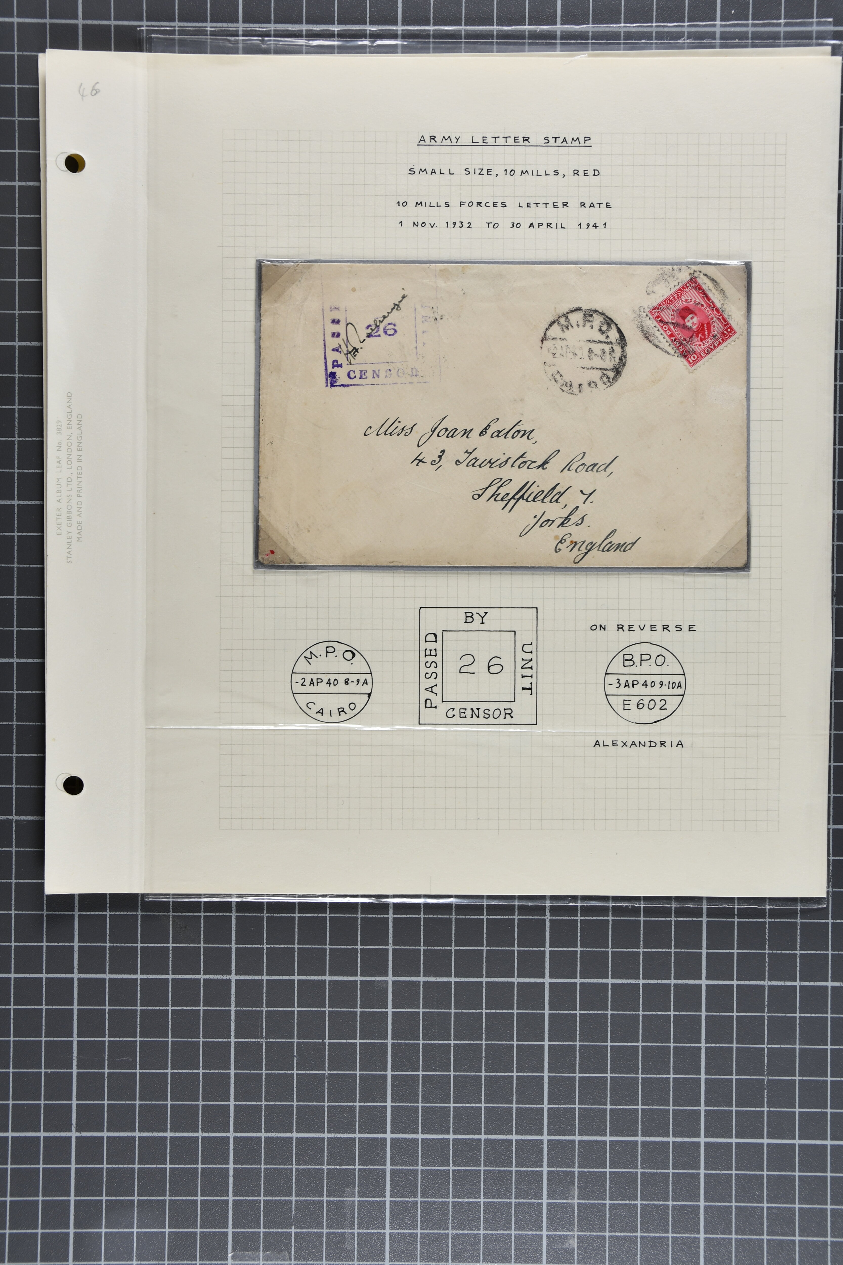 1094 cover/bof imageBritish Forces 1932/36: The collection on leaves with 1932 Postal Seal 1 pi. on cover, Letter Seal covers (3), 1934 1 pi. green unused and on cover, 1935 1 pi. carmine, perf. 13½ x 14, unused in two complete marginal panes of twenty (Gi = £ 720+) and usages on covers (4), 1935 Silver Jubilee 1 pi. ultramarine on cover addressed to Stanley Gibbons (Gi = £ 300); 1936 3 m. Control block of six and usages on FDC and two cards, 10 m. carmine unused and a used block of four and an FDC and another cover; 1939 small format 3 m. green on registered cover with three Egypt 10 m. violet and re-addressed with 3 m. green between FPO's (Nov 23-Nov 27) - this value rare on letter, 10 m. carmine covers (2). An interesting lot (41 items). (Image 1) (Image 2) (Image 3) (Image 4) (Image 5) (Image 6) (Image 7) (Image 8) (Image 9) (Image 10) (Image 11) (Image 12) (Image 13) (Image 14) (Image 15) (Image 16) (Image 17) (Image 18) (Image 19) (Image 20)