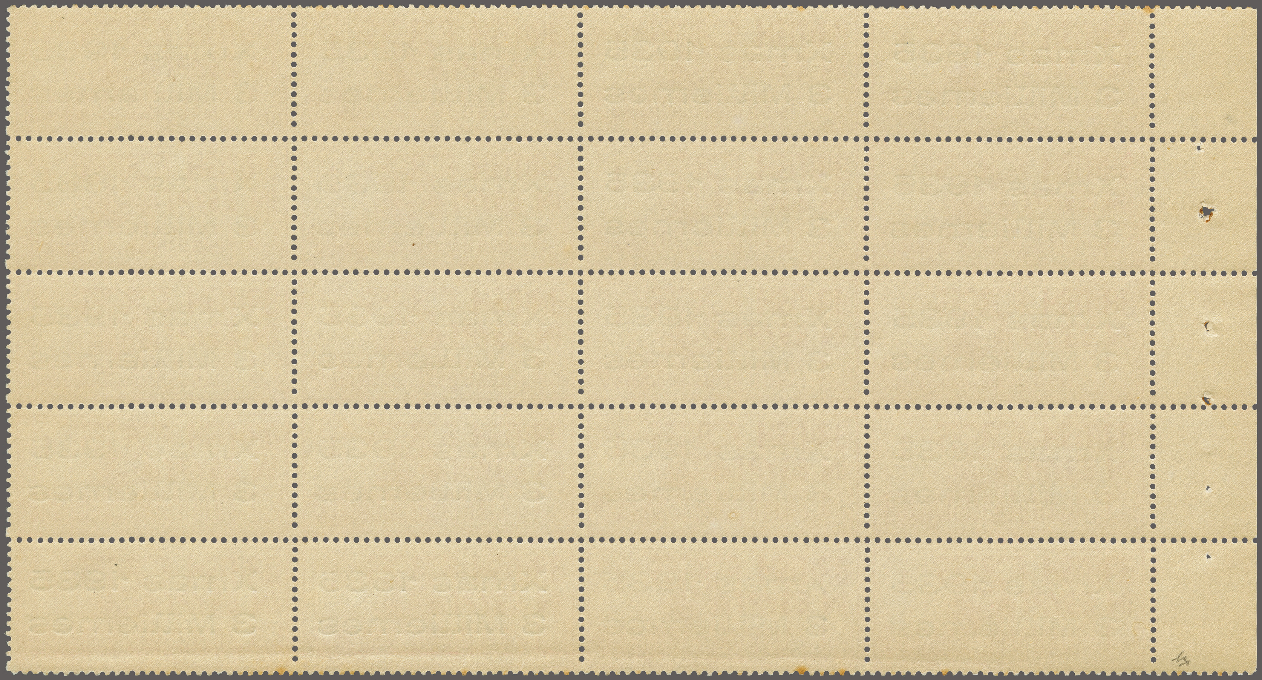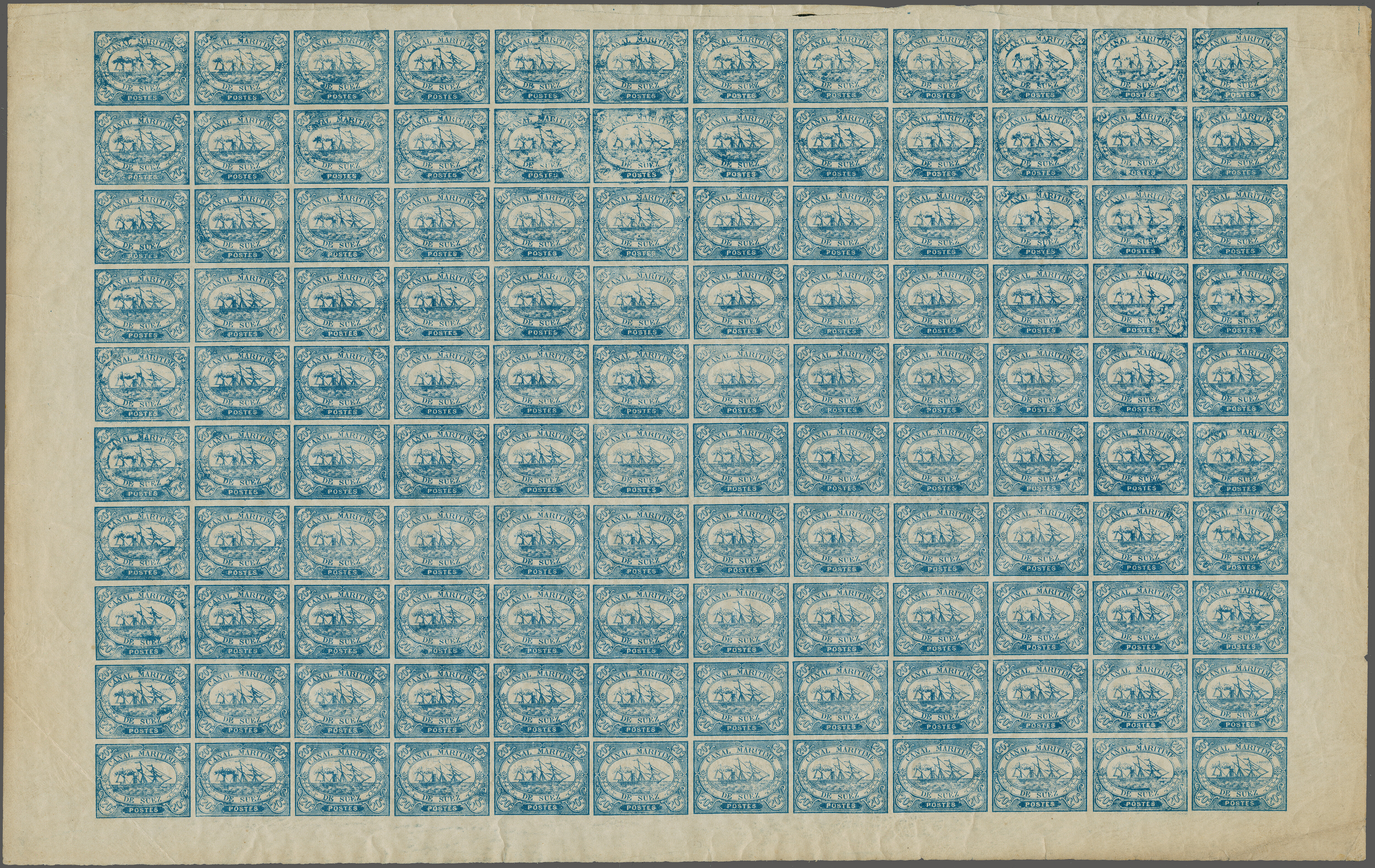 1095 **/bof imageSuez Canal Company 1868 (July 8): 20 c. blue, the magnificent complete sheet of 120 subjects (12 x 10) with full sheet margins all round, of delightful delicate fresh colour, small cut in top margin and slightest creasing affecting the top horizontal row and not apparent on face, corner bend at lower left touching pos. 109, otherwise a truly superb and wonderful sheet with positions 17-18 showing the damaged stones prominently, full original unmounted og. Signed Charles Cotta and Todd AIEP Gi = £ 9'000+. (Image 1) (Image 2)