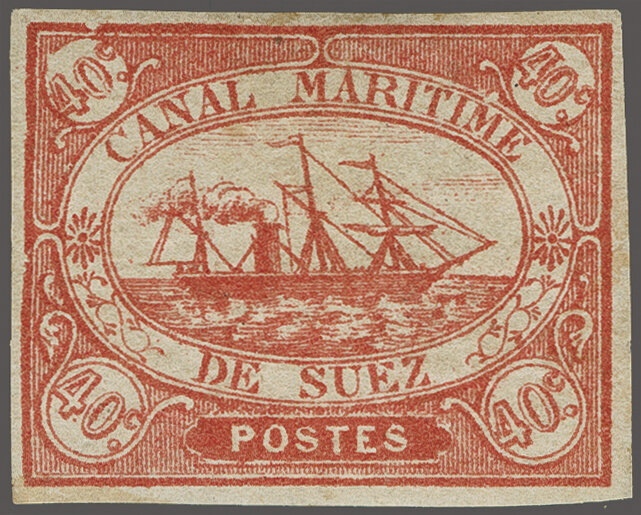 1096 */(*) imageSuez Canal Company 1868 (July 8): The unused set of four values, all with four margins, with 1 c. black signed Holcombe, 5 c. green and 20 c. blue signed A. Diena (these three without gum) and 40 c. red with typically browned original gum, signed Todd AIEP. A scarce set Gi = £ 540. (Image 1) (Image 2)