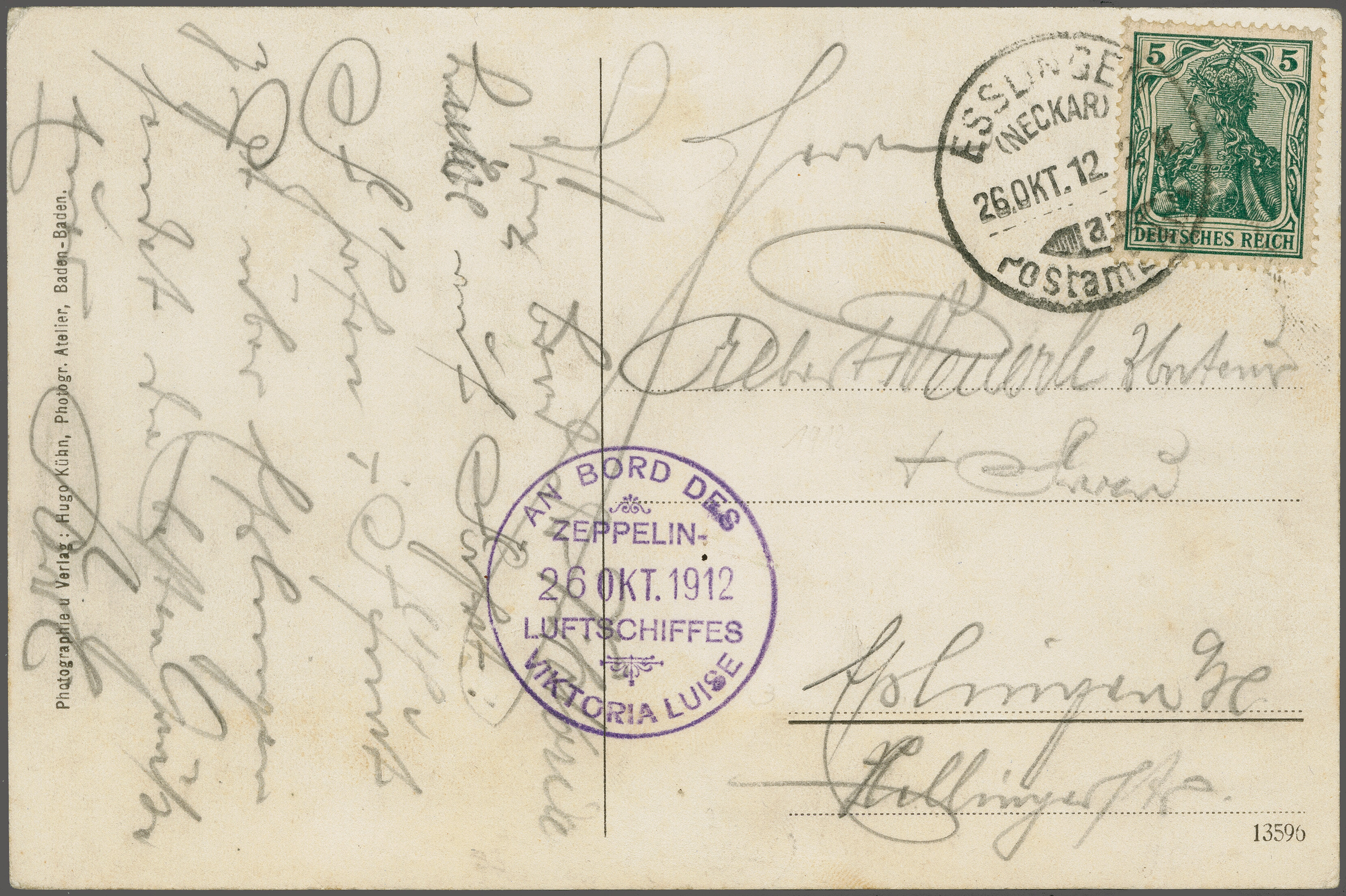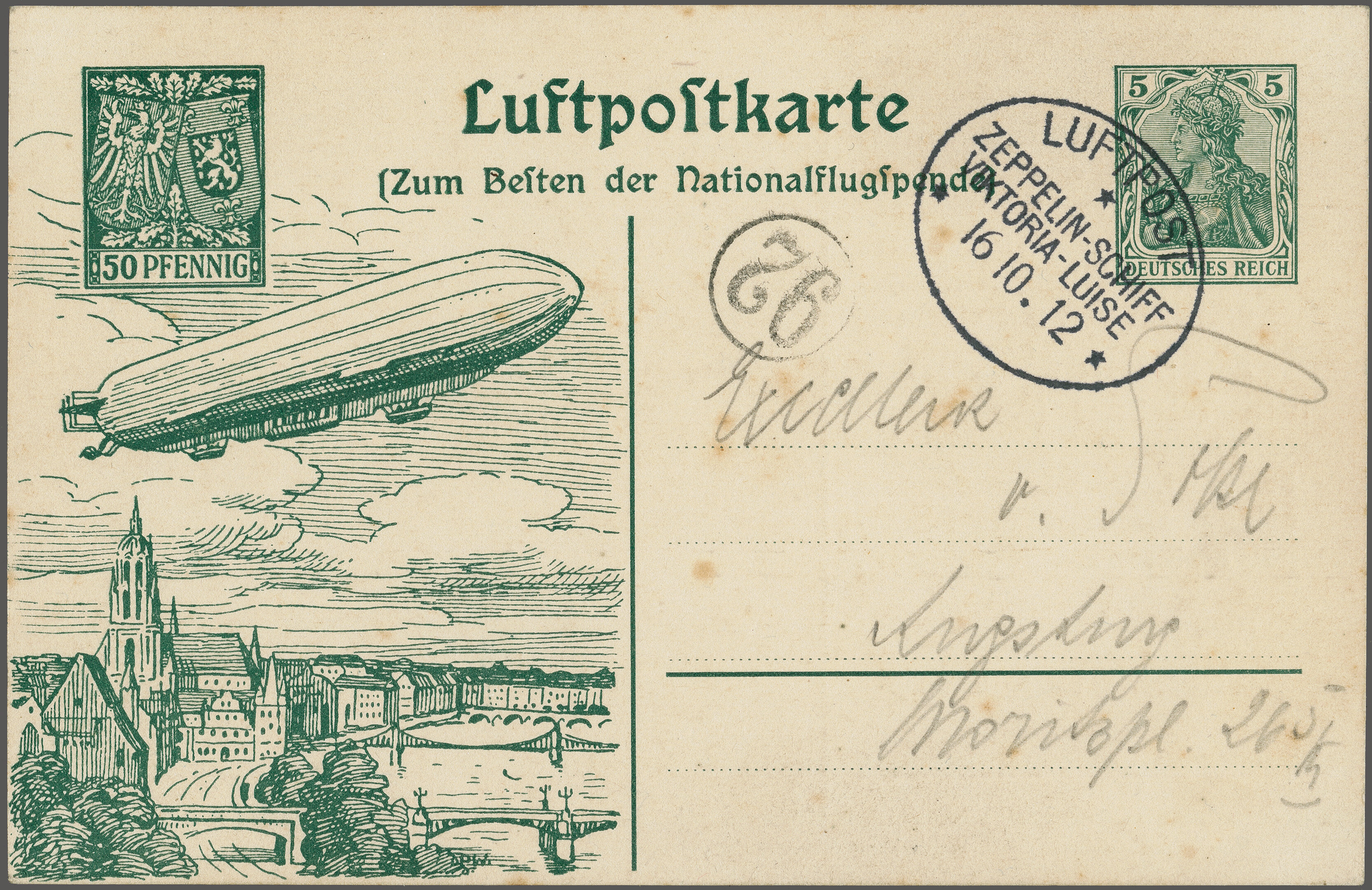 LZ 11 Viktoria Luise - Fahrt für die Nationalspende Frankfurt - Wiesbaden - Frankfurt 1912 (16. Okt.): 5 Pfg. Sonderganzsache zu 50 Pfg. (Zeppelin) entw. mit schwarzem Bordpoststempel vom 16. Oktober, nach Augsburg. Für die