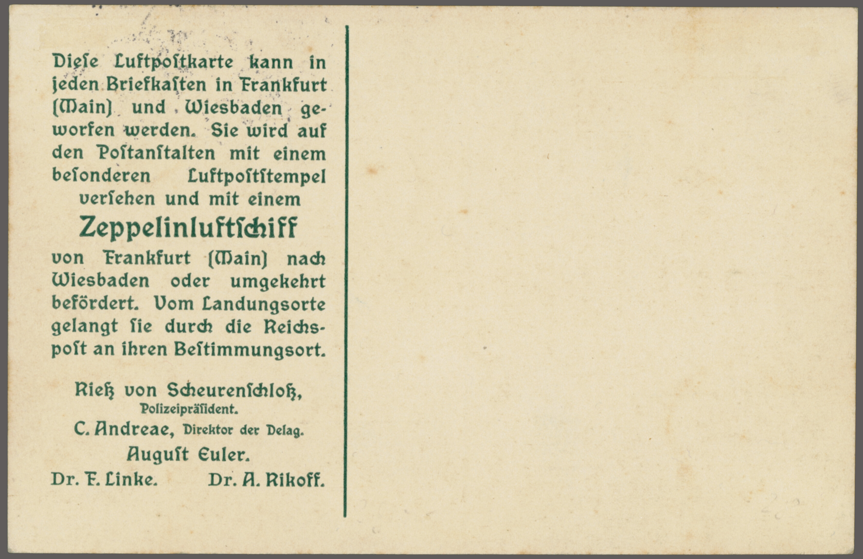 nach Frankfurt Main. Saubere Karte geschrieben von Luftschiffkapitän und Postellenleiter Dörr an Oberpostdirektor Lindemann, ein seltener Ersttagsbeleg Mi. = Euro 1'000+. (Image 1)