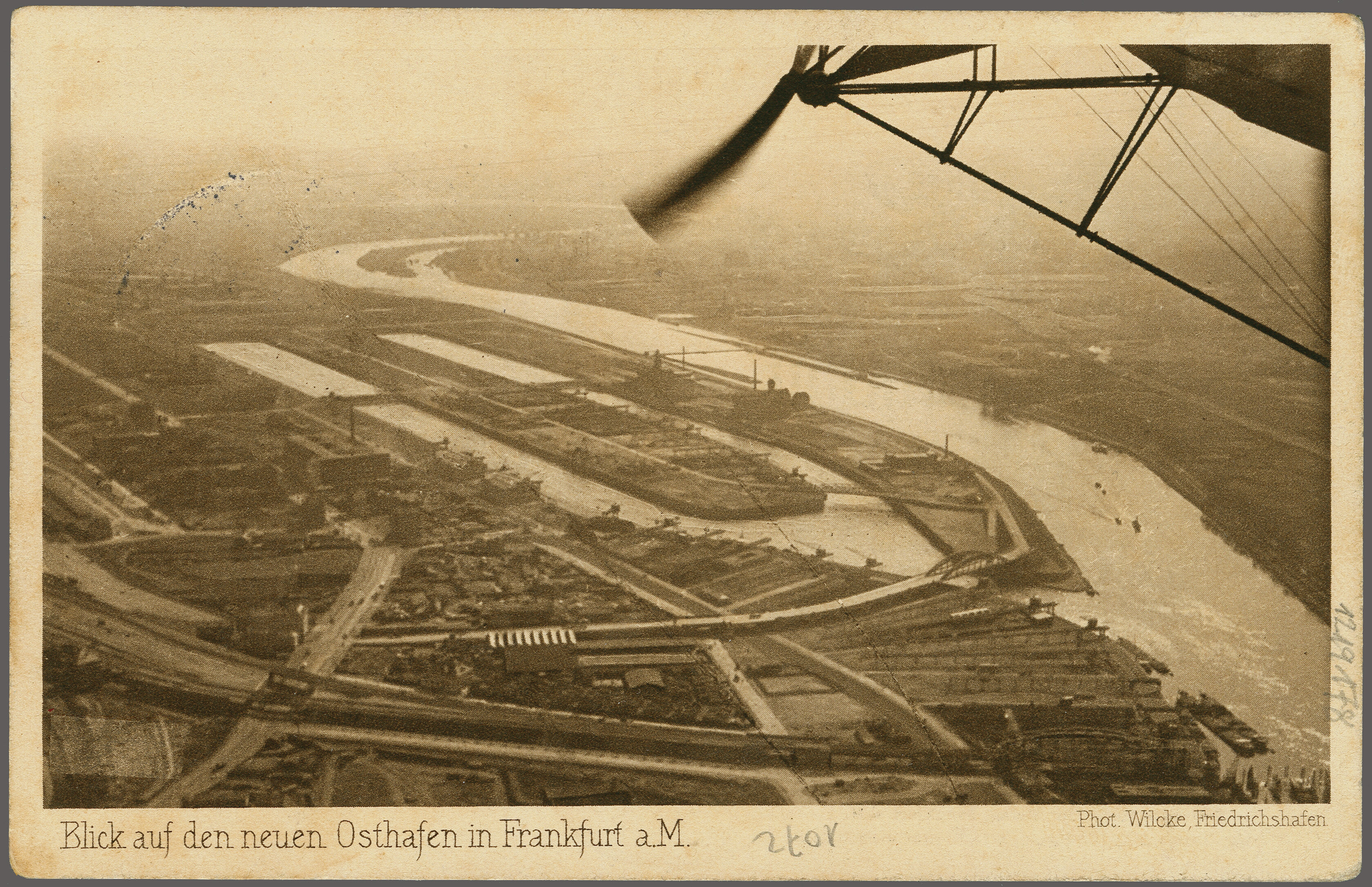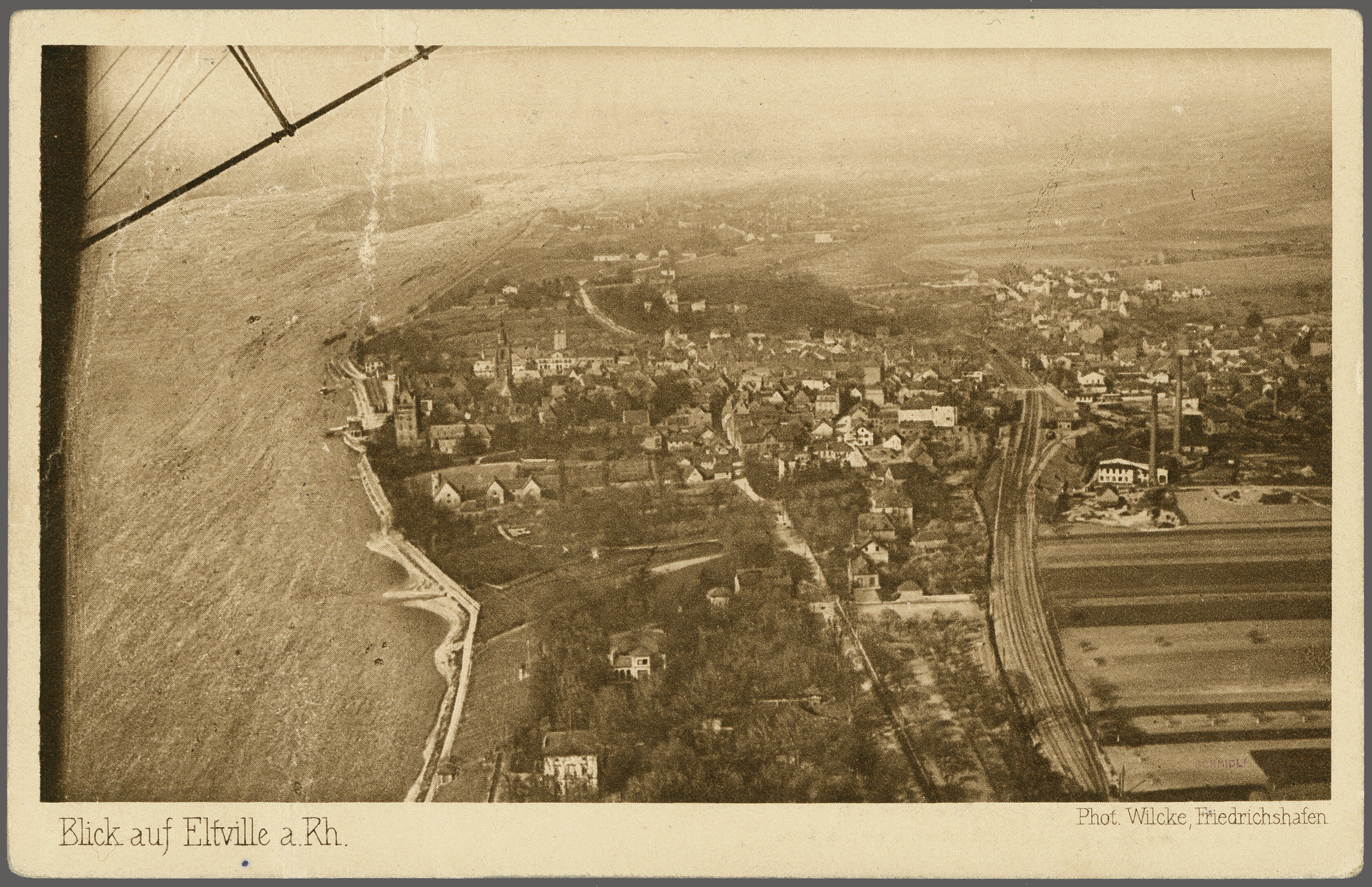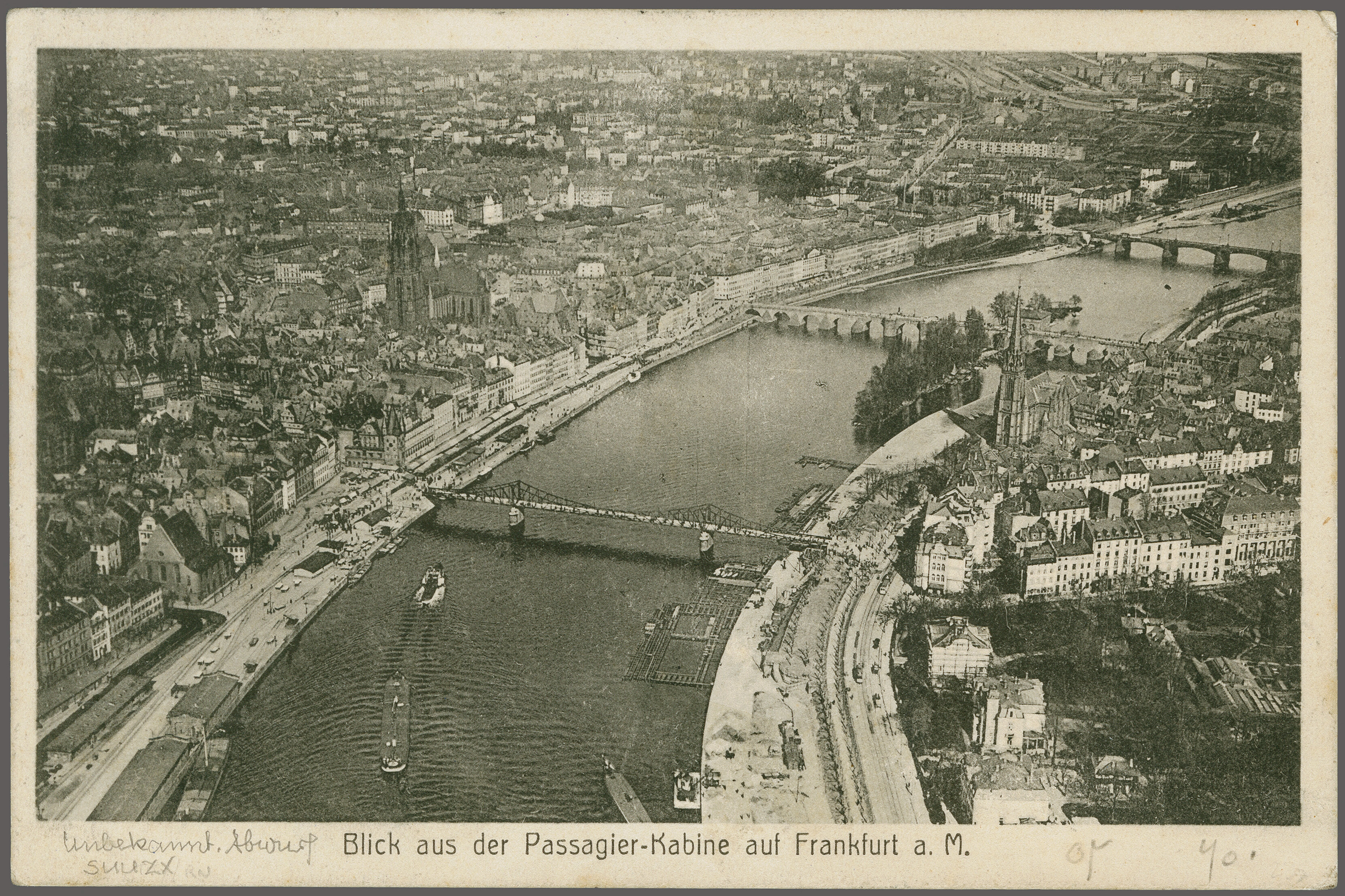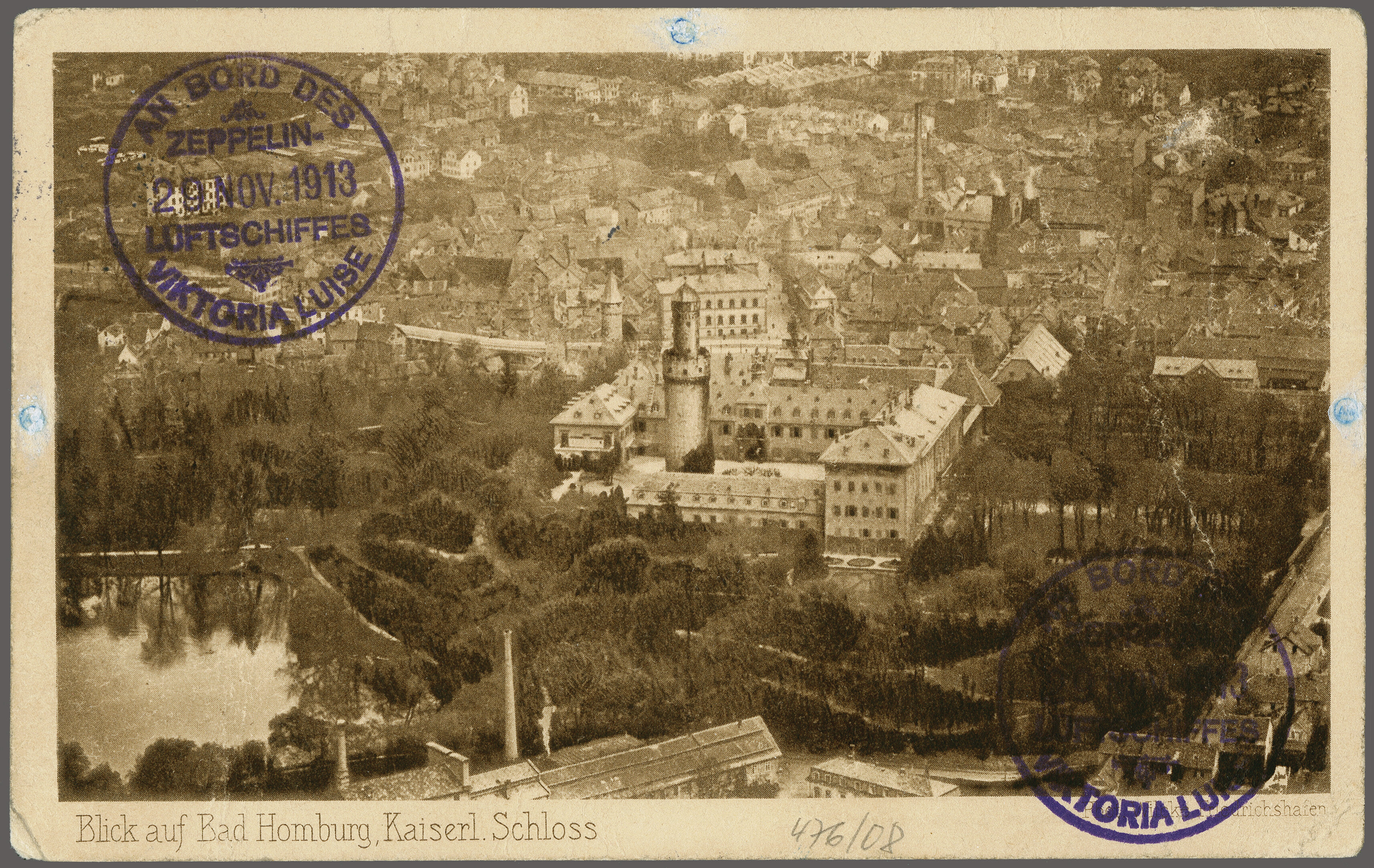 LZ 11 Viktoria Luise - Fahrt Oos - Frankfurt 1912 (26. Okt.): Fotokarte 'Blick aus der Passagier-Kabine auf Frankfurt a. M. mit viol. Bordstp., Ohne Bordpoststp., frankiert mit 5 Pfg. vom 'wilden' Abwurf "Esslingen (Neckar)