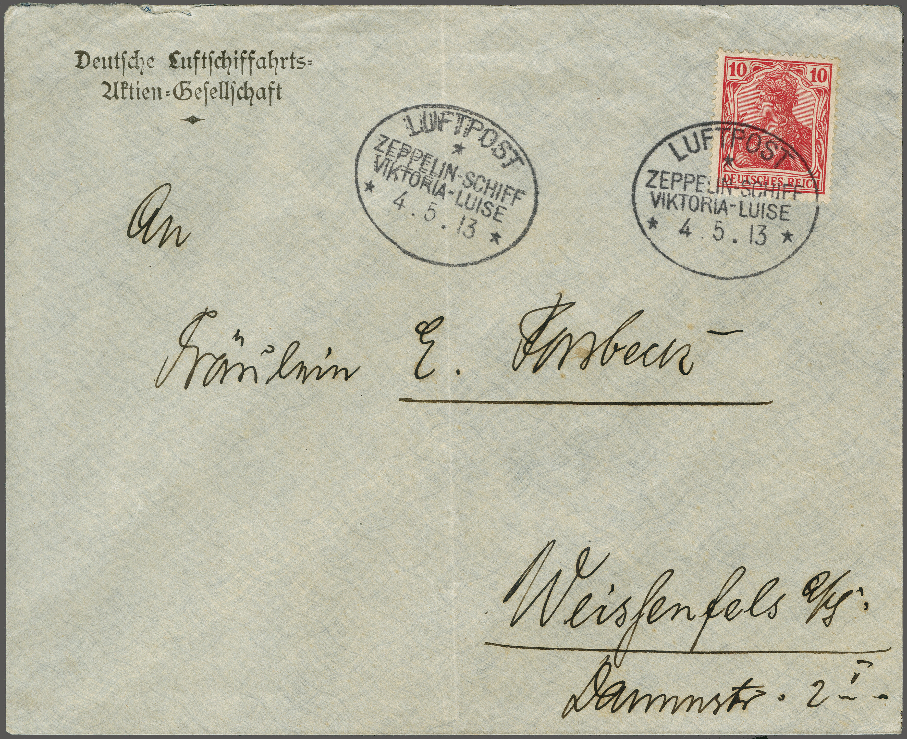 LZ 11 Victoria Luise - Rundfahrt Frankfurt 1913 (4. Mai.): Offizieller Brief der Deutschen Luftschiffahrts-Aktien-Gesellschaft DELAG frankiert mit Germania 10 Pfg., sauber und übergehend entwertet mit Bordpoststp. nach