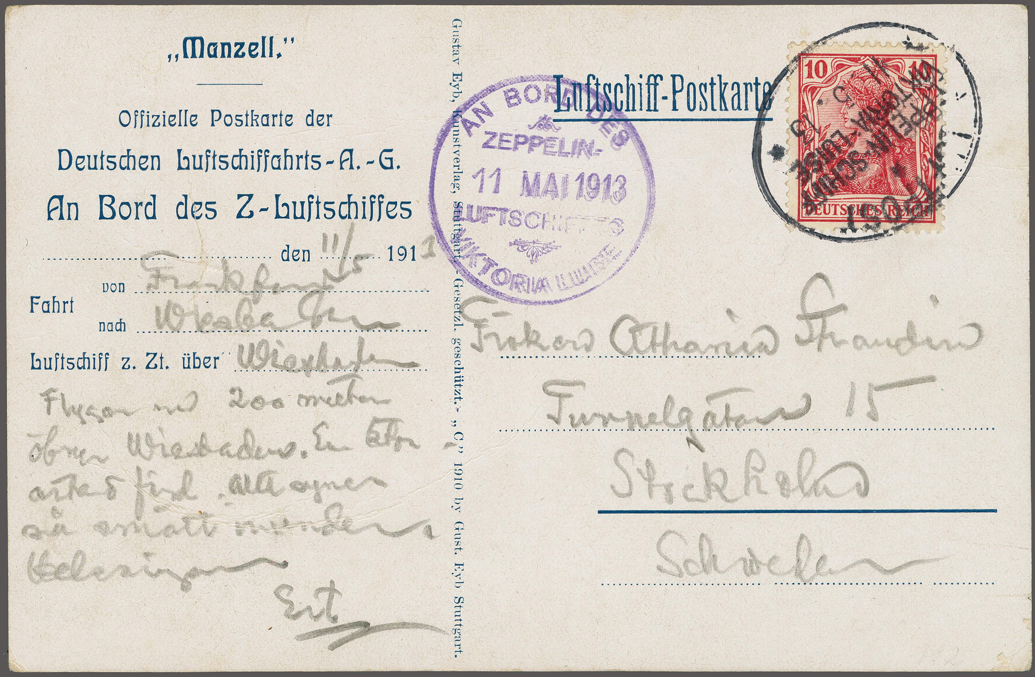 LZ 11 Victoria Luise - Rundfahrt Frankfurt - Wiesbaden - Frankfurt 1913 (11. Mai.): DELAG Karte 'Manzell' mit viol.Bordstp., frankiert mit Germania 10 Pfg. rot, sauber und übergehend entwertet mit schwarzem Bordpoststp. nach