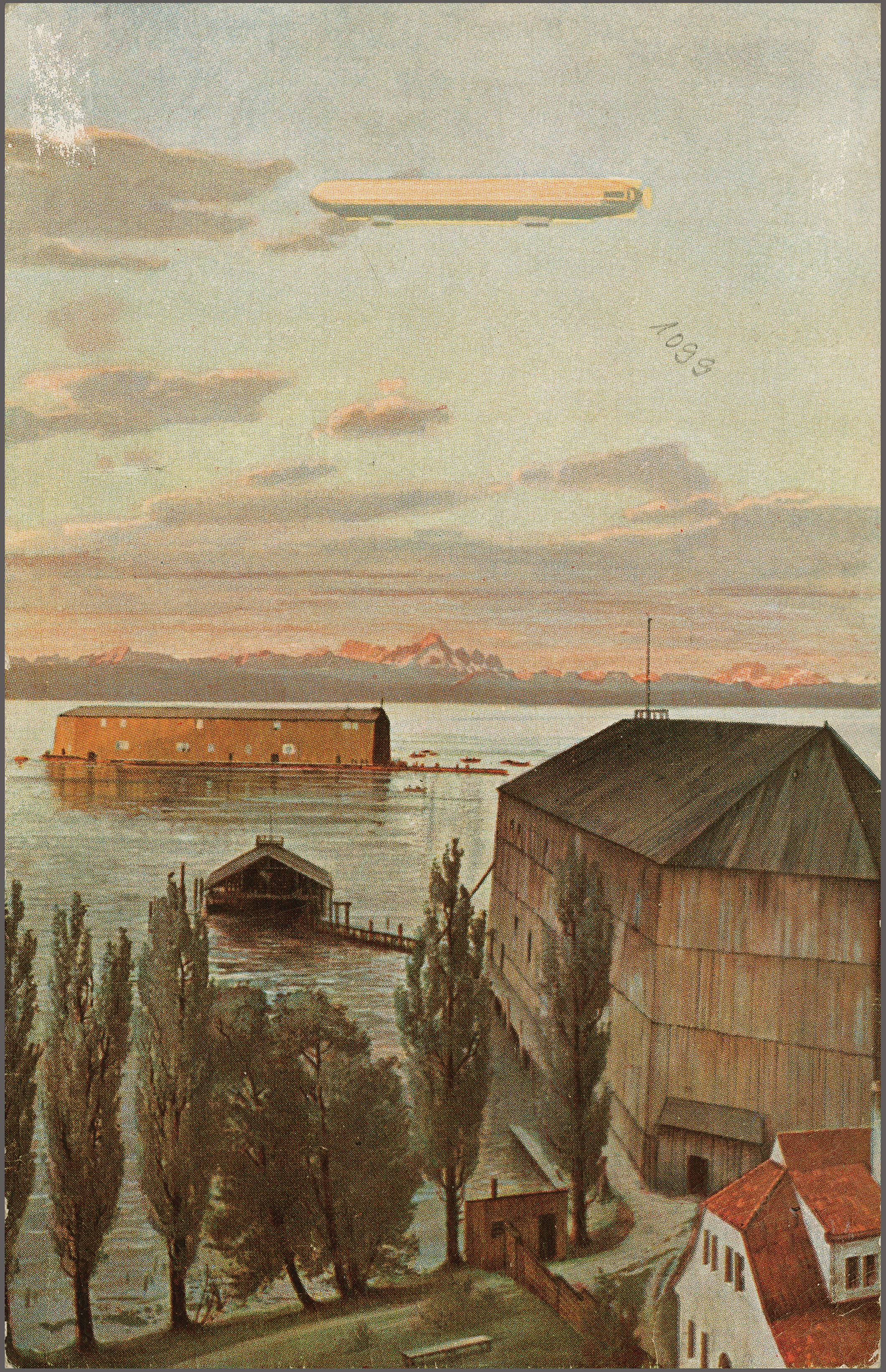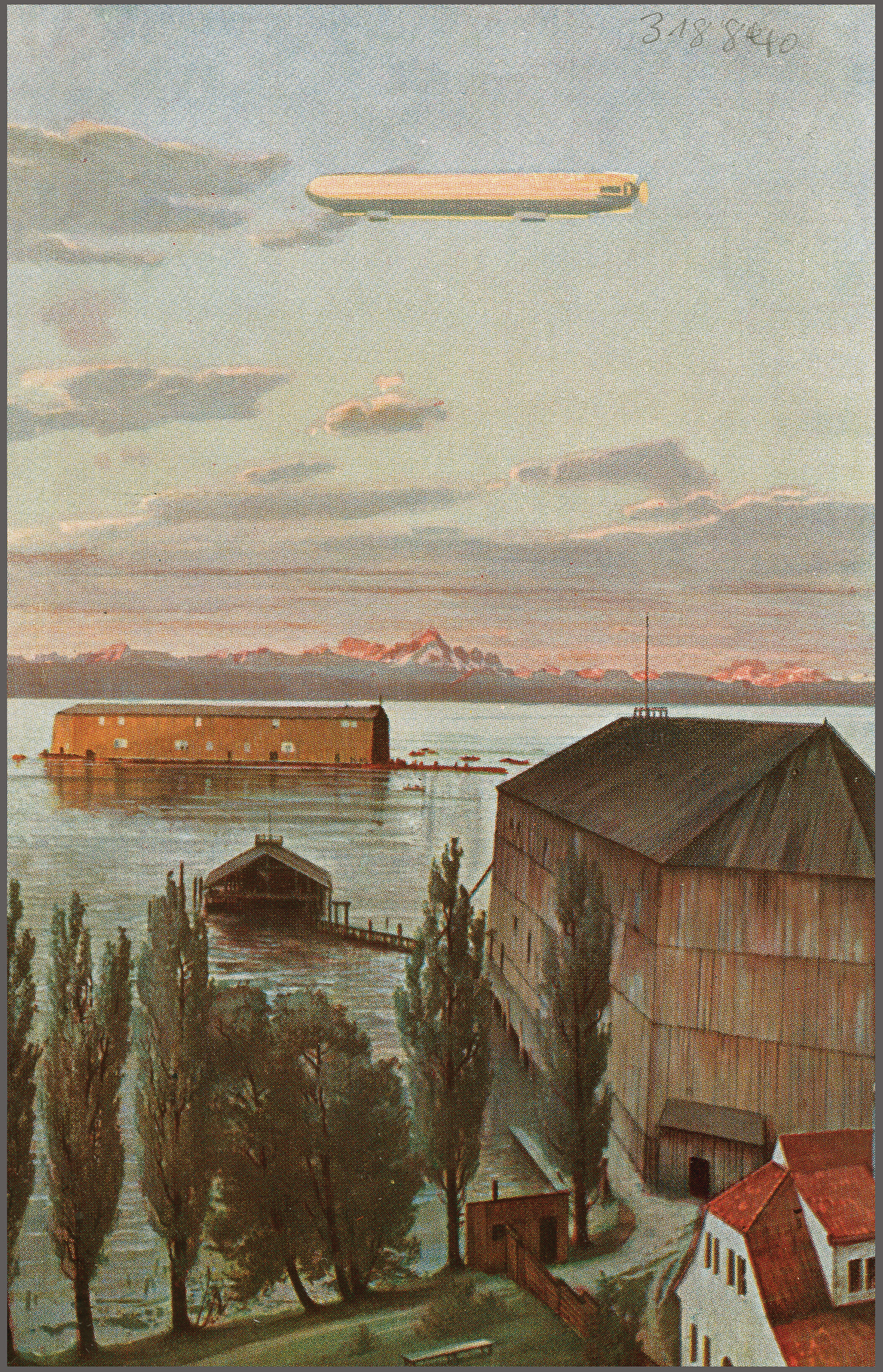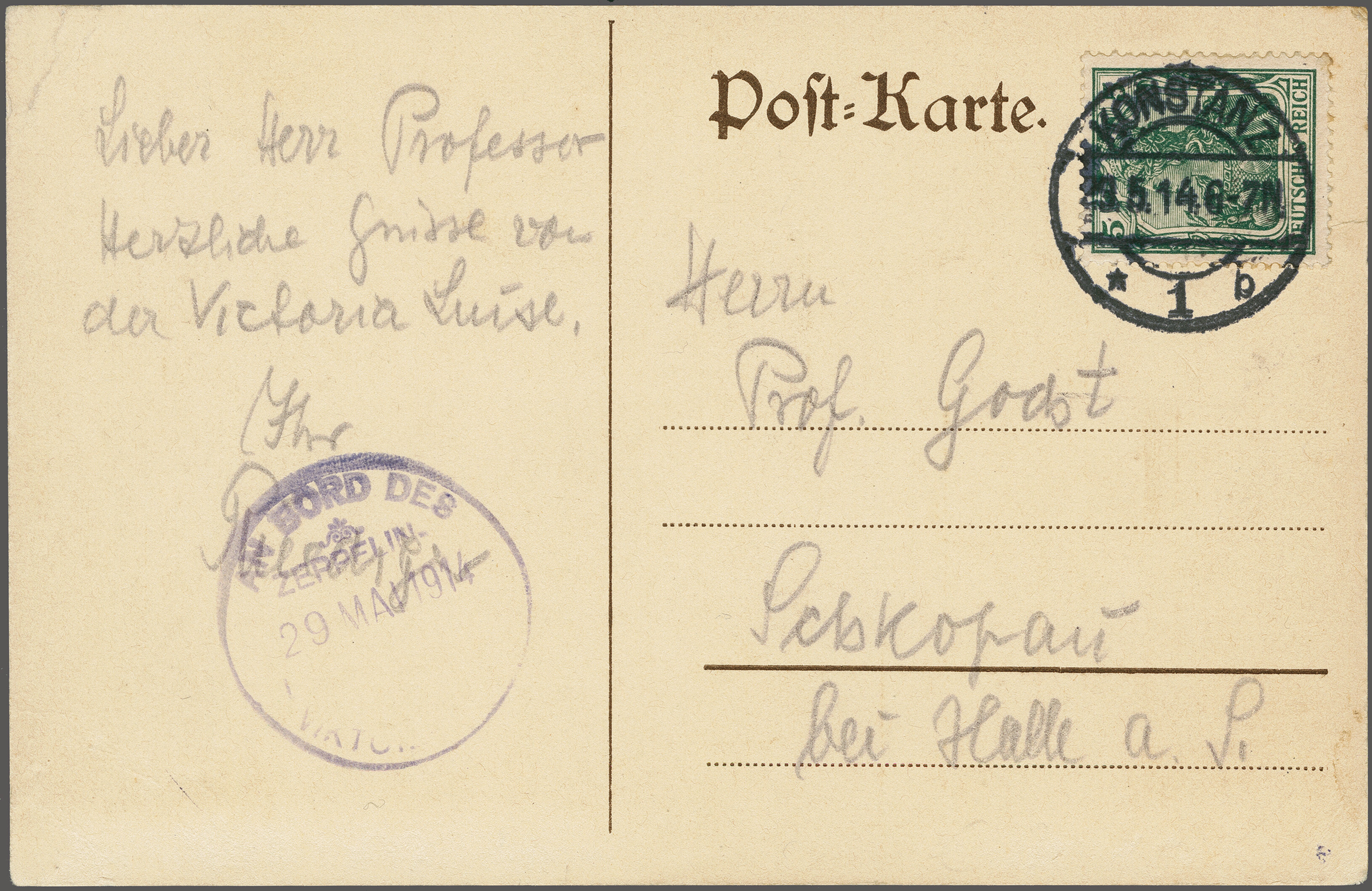 LZ 11 Viktoria Luise - Rundfahrt Friedrichshafen 1914 (29. Mai): Ansichtskarte des Luftschiffbau Zeppelin mit viol. Bordstp., frankiert mit 5 Pfg. vom wilden Abwurf in "Constanz 29.5.14 6-7N". Diese waren nach Eröffnung der
