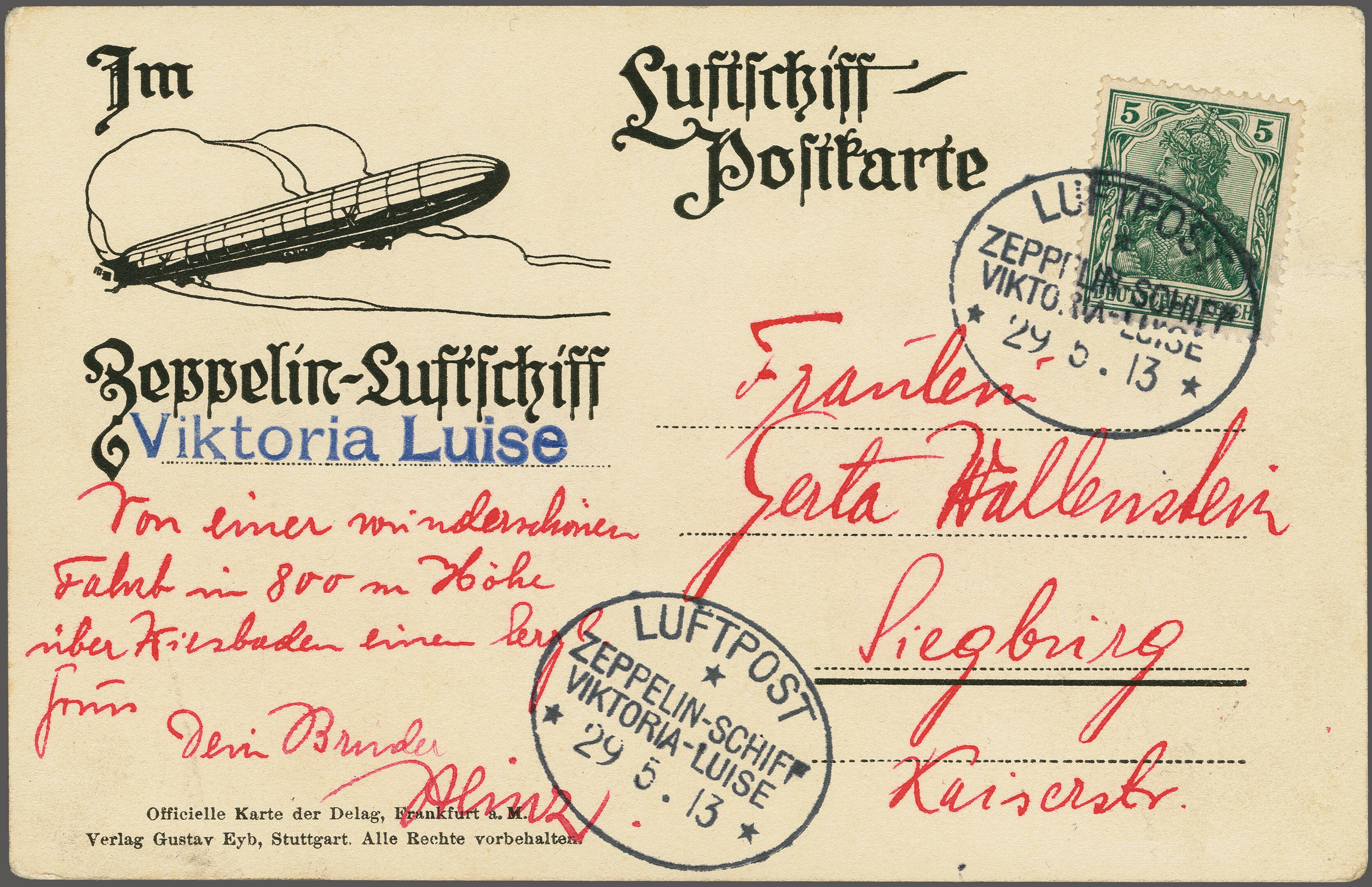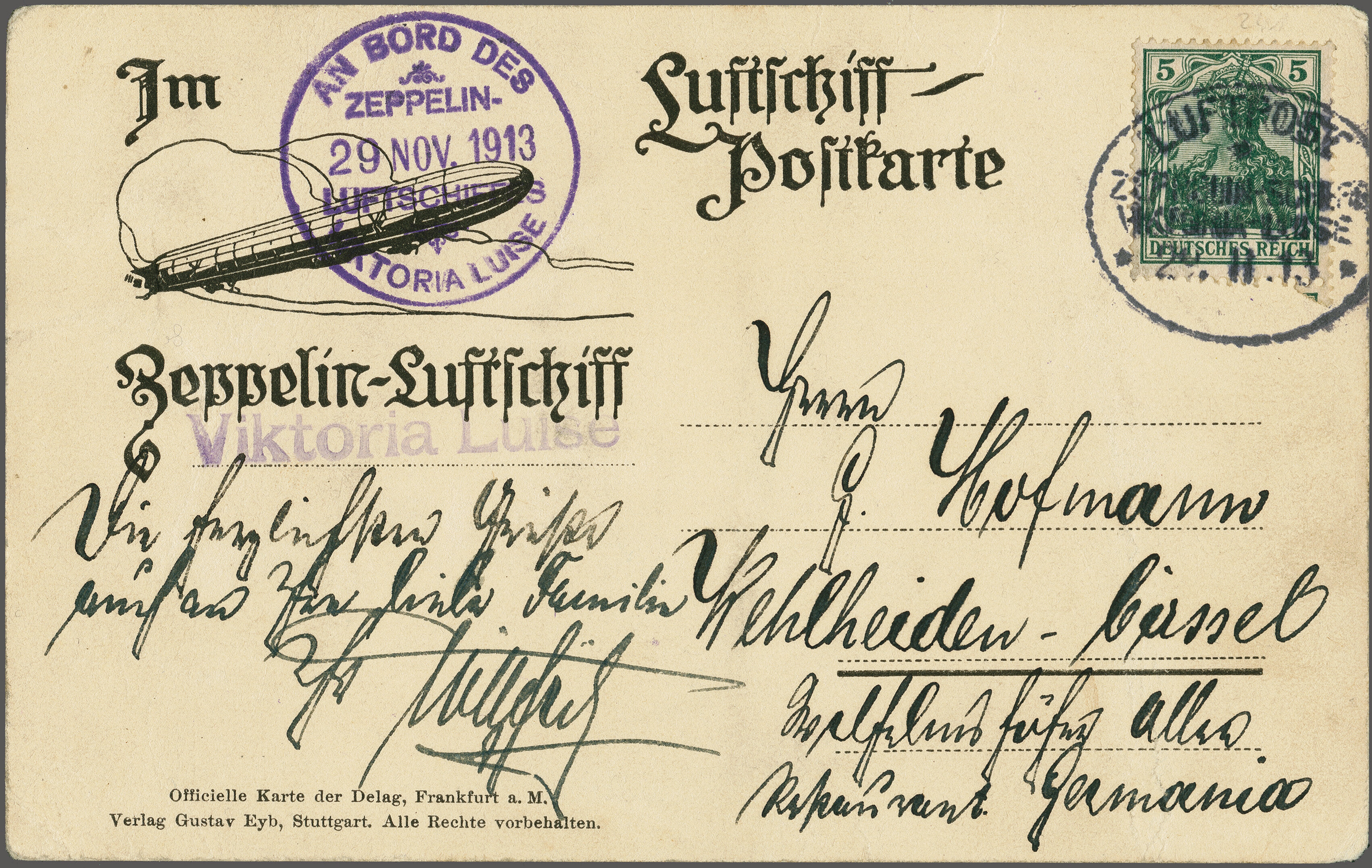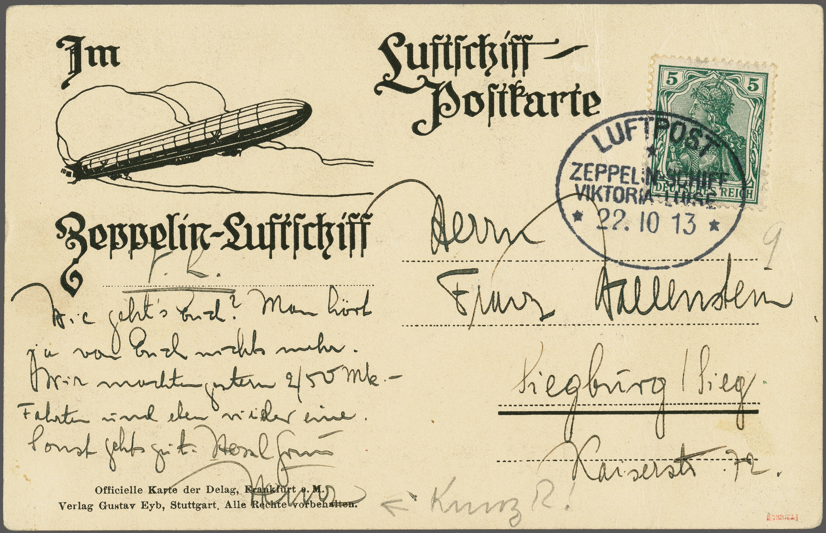 LZ 11 Viktoria Luise - Rundfahrt über Frankfurt 1913 (22. Okt.): Offizielle Luftschiffkarte frankiert mit 5 Pfg., sauber entw. mit schwarzem Bordpoststp., geschrieben von und adressiert an Besatzungsmitglied Franz Wallenstein