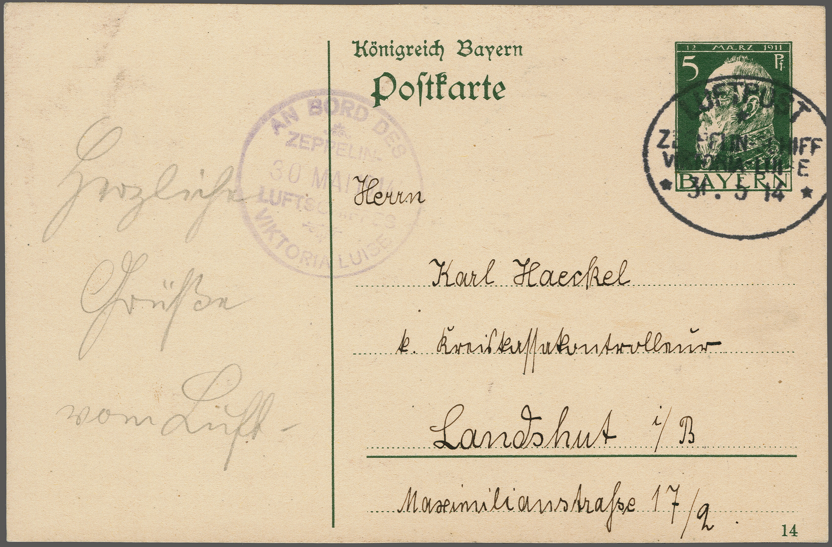 LZ 11 Viktoria Luise - Rundfahrt Friedrichshafen - München - Friedrichshafen 1914 (30. Mai.): Bayrische 5 Pfg. GS-Karte mit beigef. viol. Bordstp. und Bordpost-Entwertung, Abgabe München nach Landshut. Bei Fahrten über