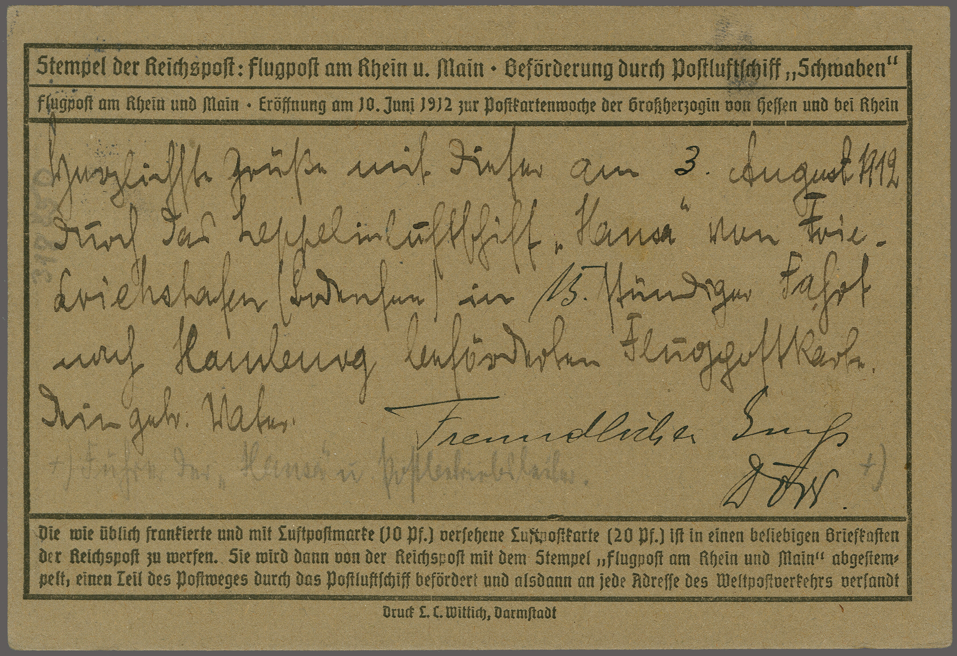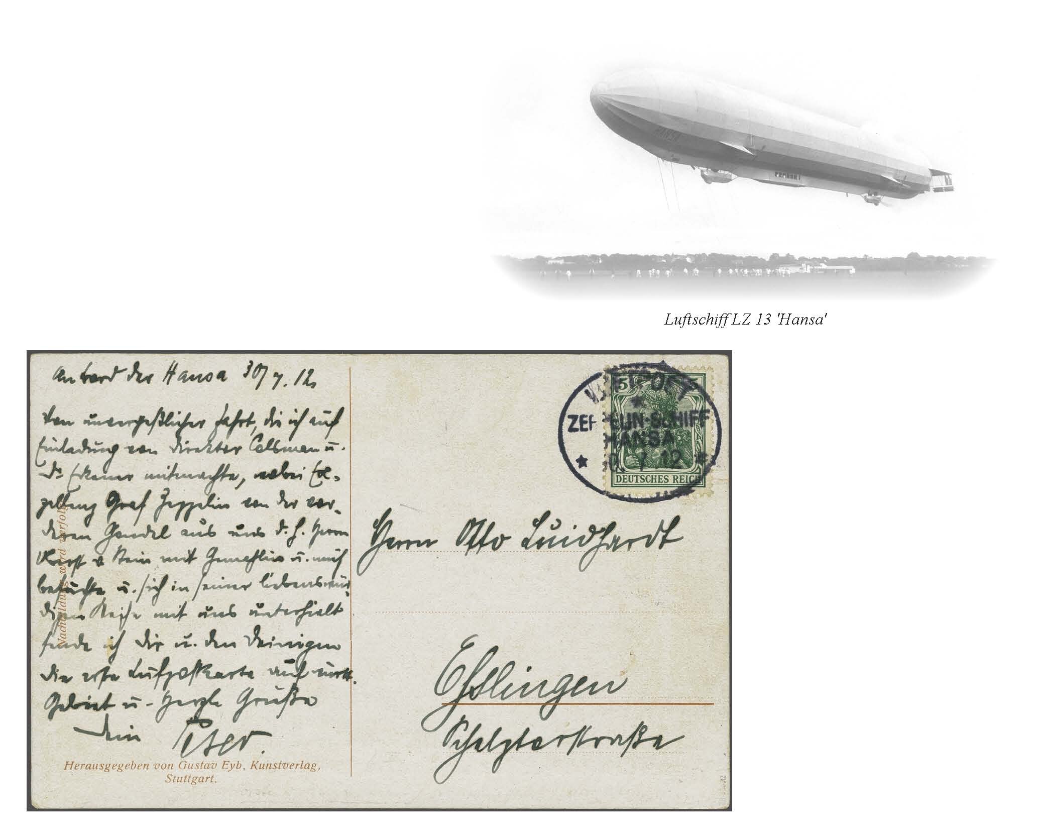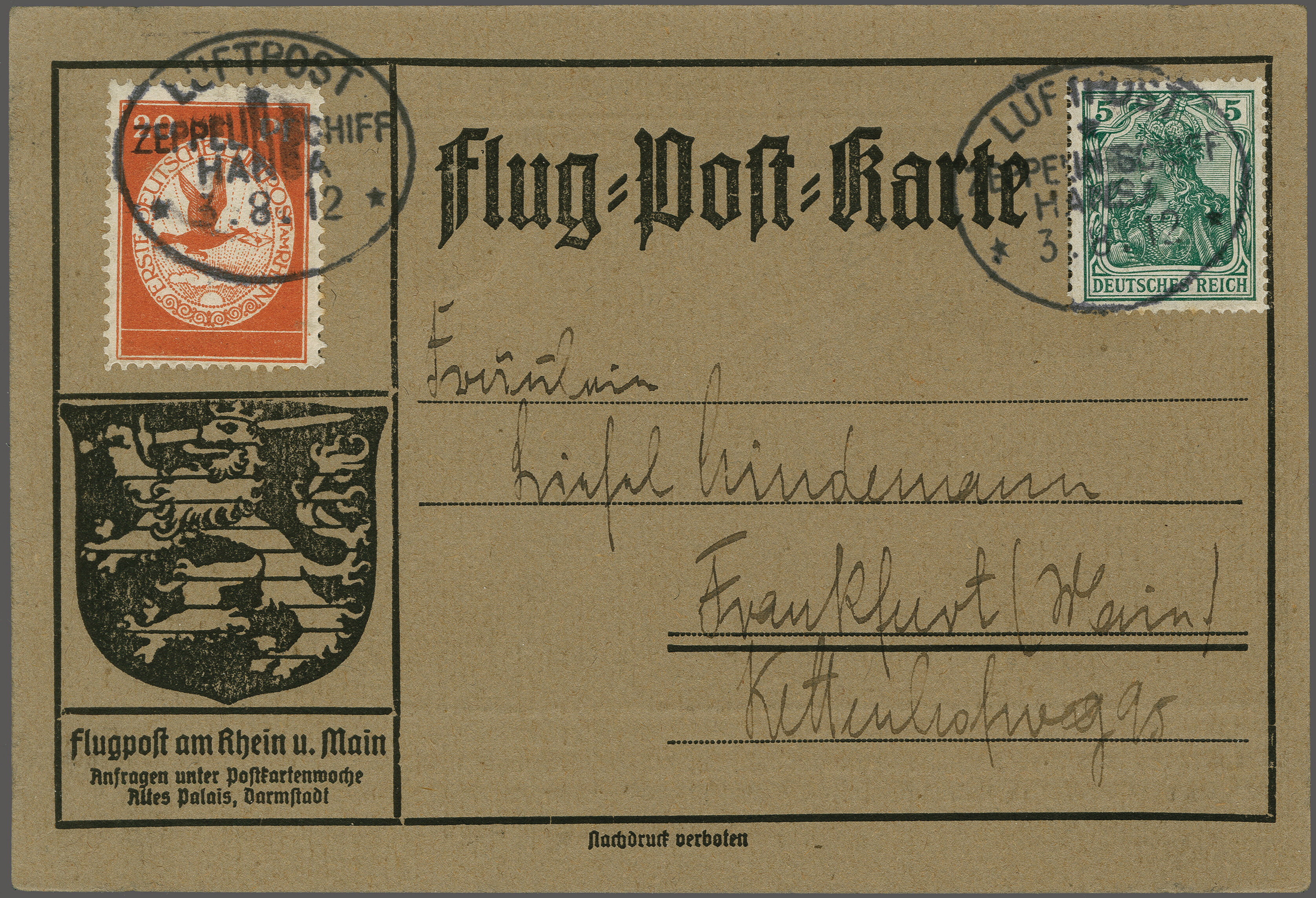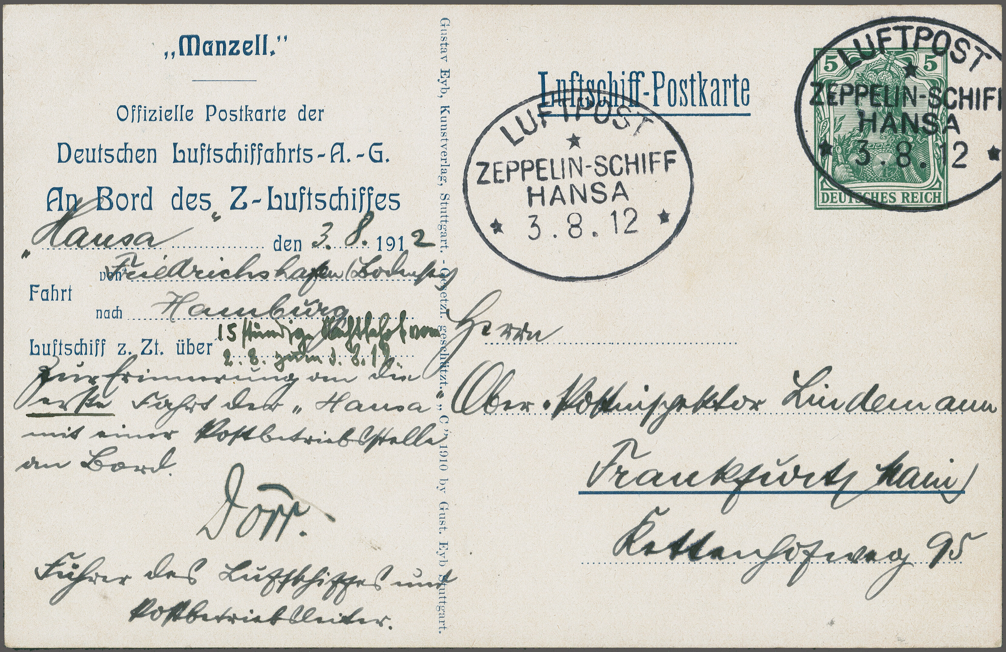 LZ 13 Hansa - DELAG Erstfahrt mit Poststelleneröffnung Friedrichshafen - Hamburg 1912 (3. Aug.): Rhein-Main Flugpostkarte verwendet vom Oberpostdirektor Lindeman an seine Tochter in Frankfurt, frankiert mit halbamtl.