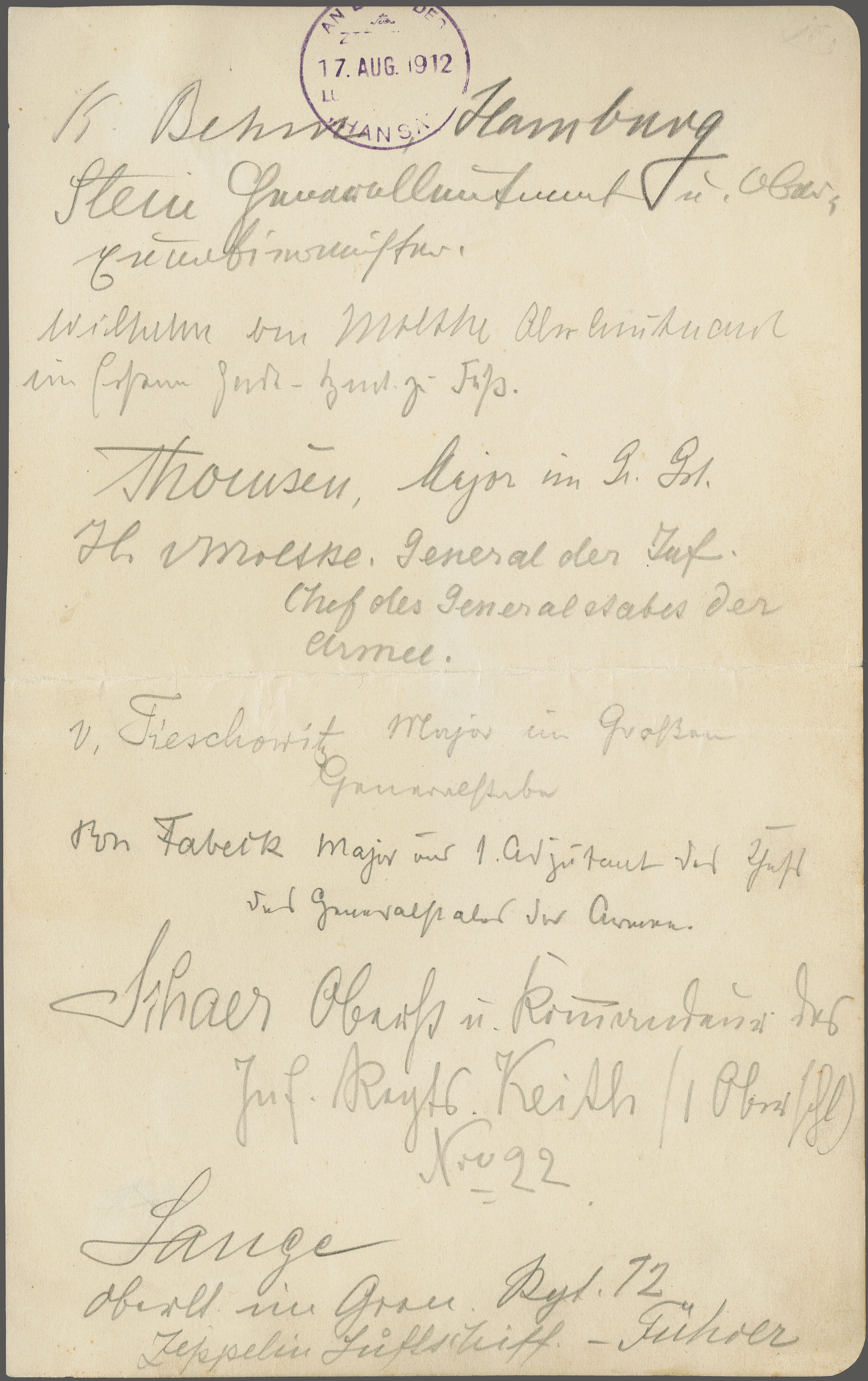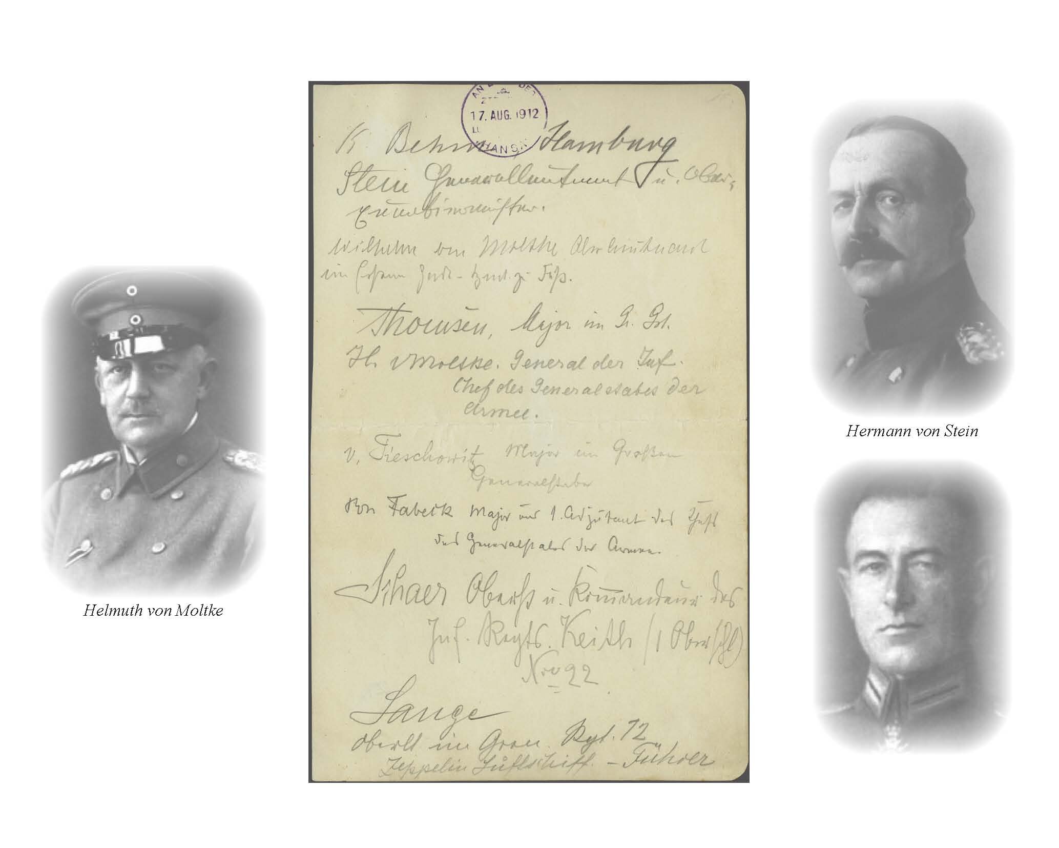 LZ 13 Hansa - Rundfahrt Hamburg Fahrt des Deutschen Generalstabs 1912 (17. Aug.): Bordbuchseite mit viol. Bordstp. der Hansa mit Autogrammen der acht Fahrtteilnehmer, u.a. H.v.Molke, General der Infanterie und Chef des