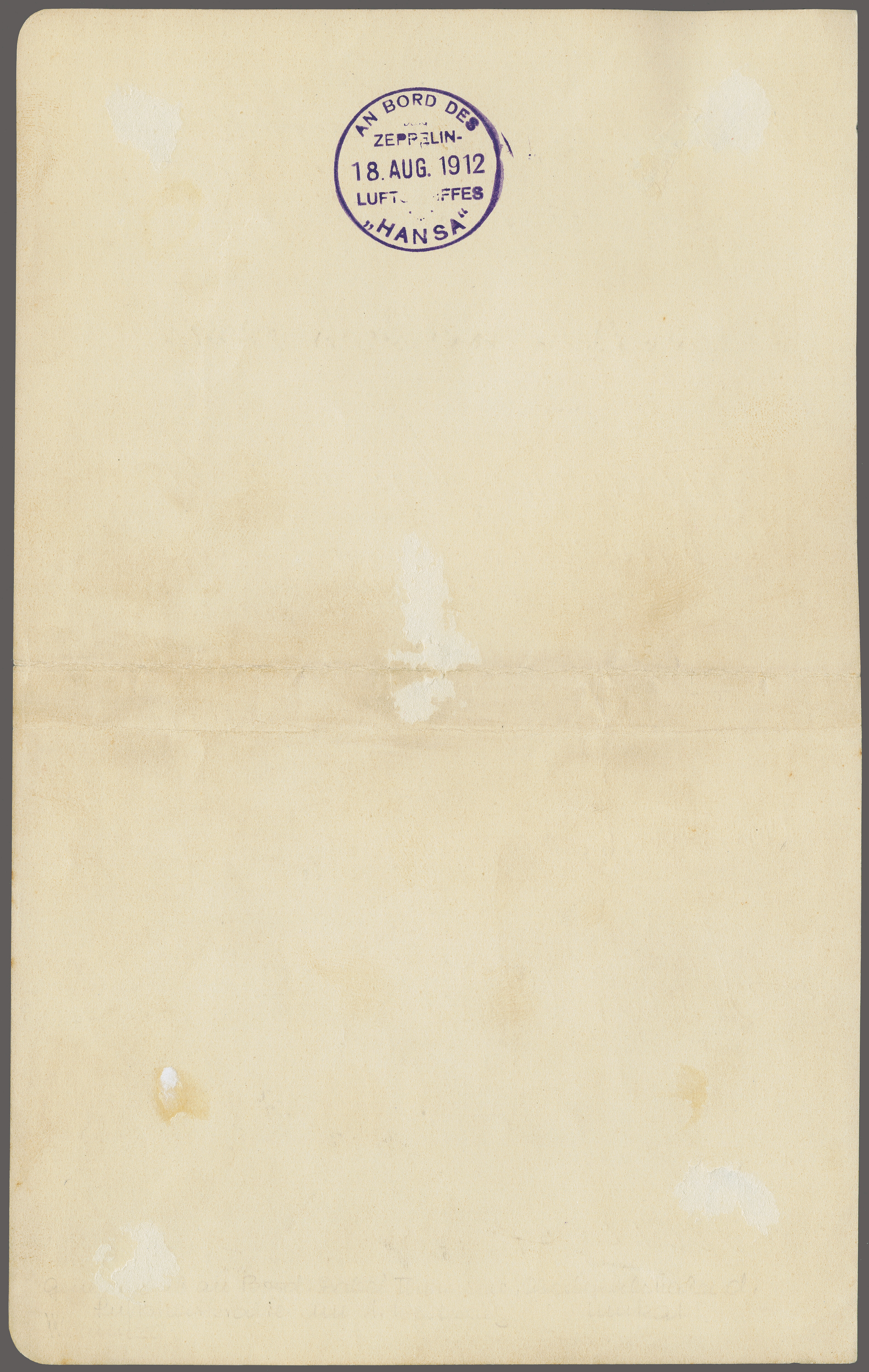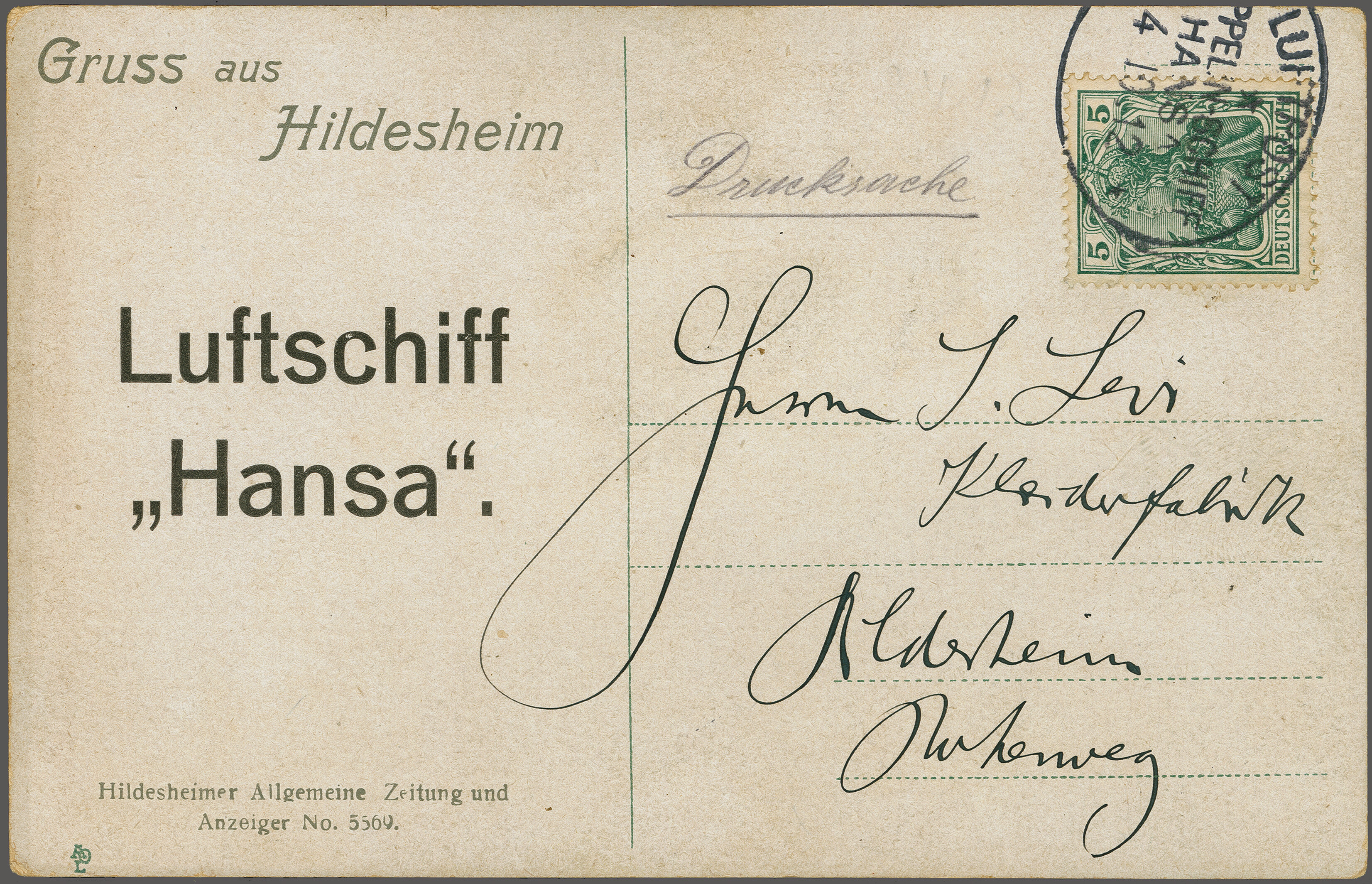 LZ 13 Hansa - Rundfahrt Hamburg 1912 (4. Okt.): 'HANSA' Werbekarte 'Gruss aus Hildesheim' und rücks. Leporello der Hildesheimer Zeitung, frankiert mit 5 Pfg. sauber entw. mit Bordpoststempel Typ 1 nach Hildesheim. Aufgrund des