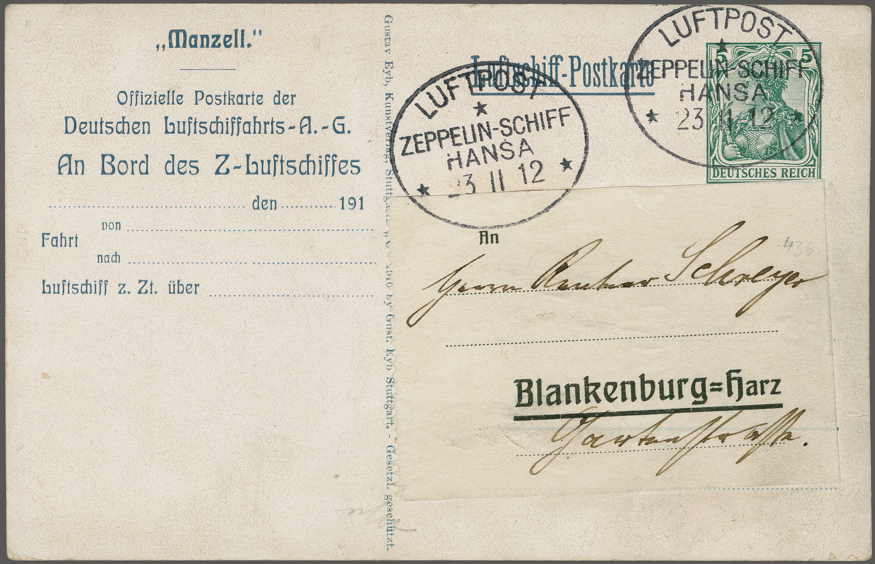 LZ 13 Hansa - Fahrt Potsdam - Halberstadt - Potsdam 1912 (23. Nov.): Luftschiff Ganzsachenkarte 'Manzell' sauber entw. mit Bordpoststempel Typ 1 nach Blankenburg - Harz. Delag Karte mit vorgedruckter Adressetikette für