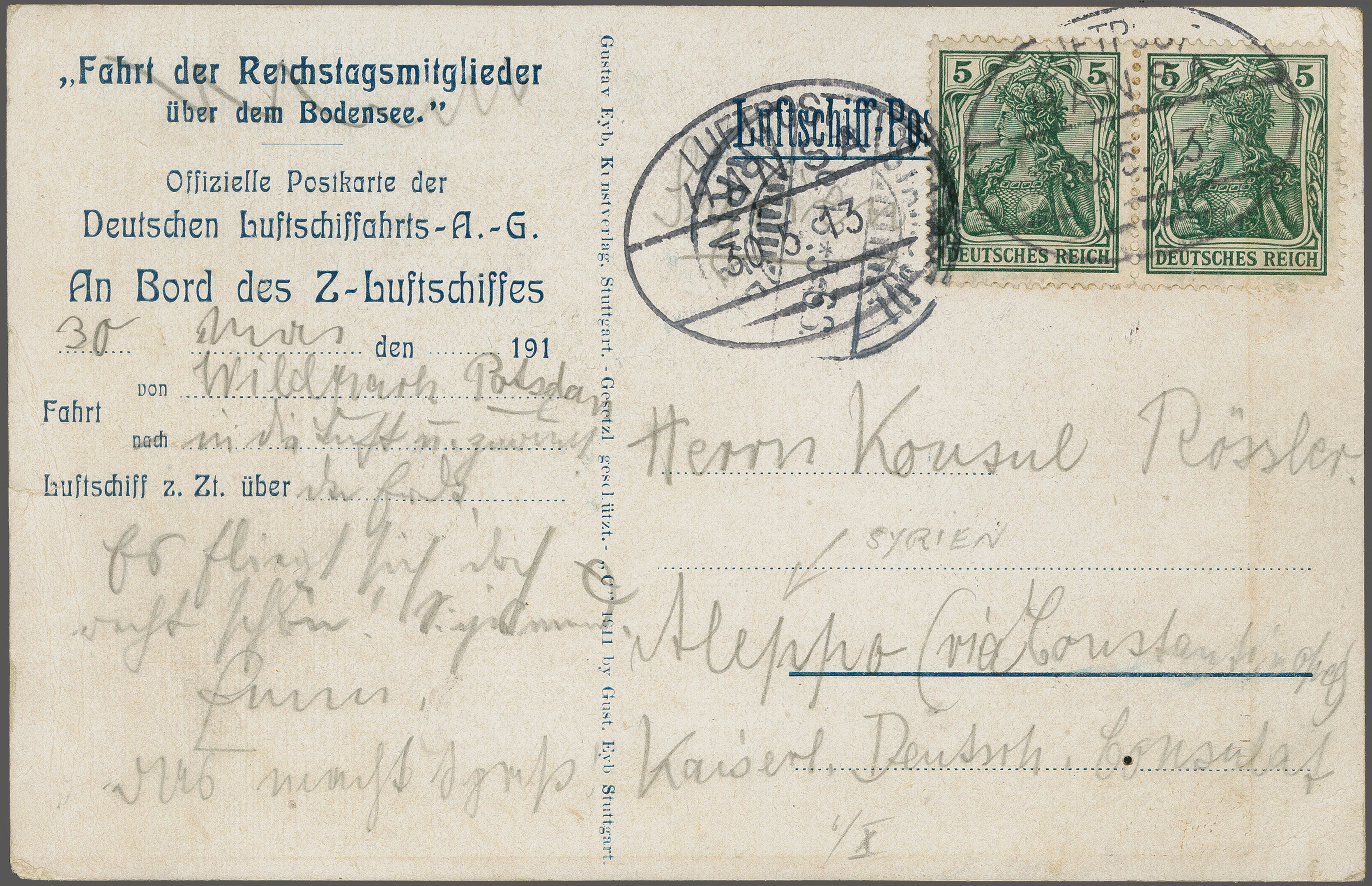 LZ 13 Hansa - Rundfahrt über Potsdam 1913 (30. Mai): DELAG Karte 'Fahrt der Reichstagsmitglieder' frankiert mit 5 Pfg. im waagr. Paar entw. mit Bordpoststempel Typ II (umgearbeiteter Bordpoststp. der Schwaben) als