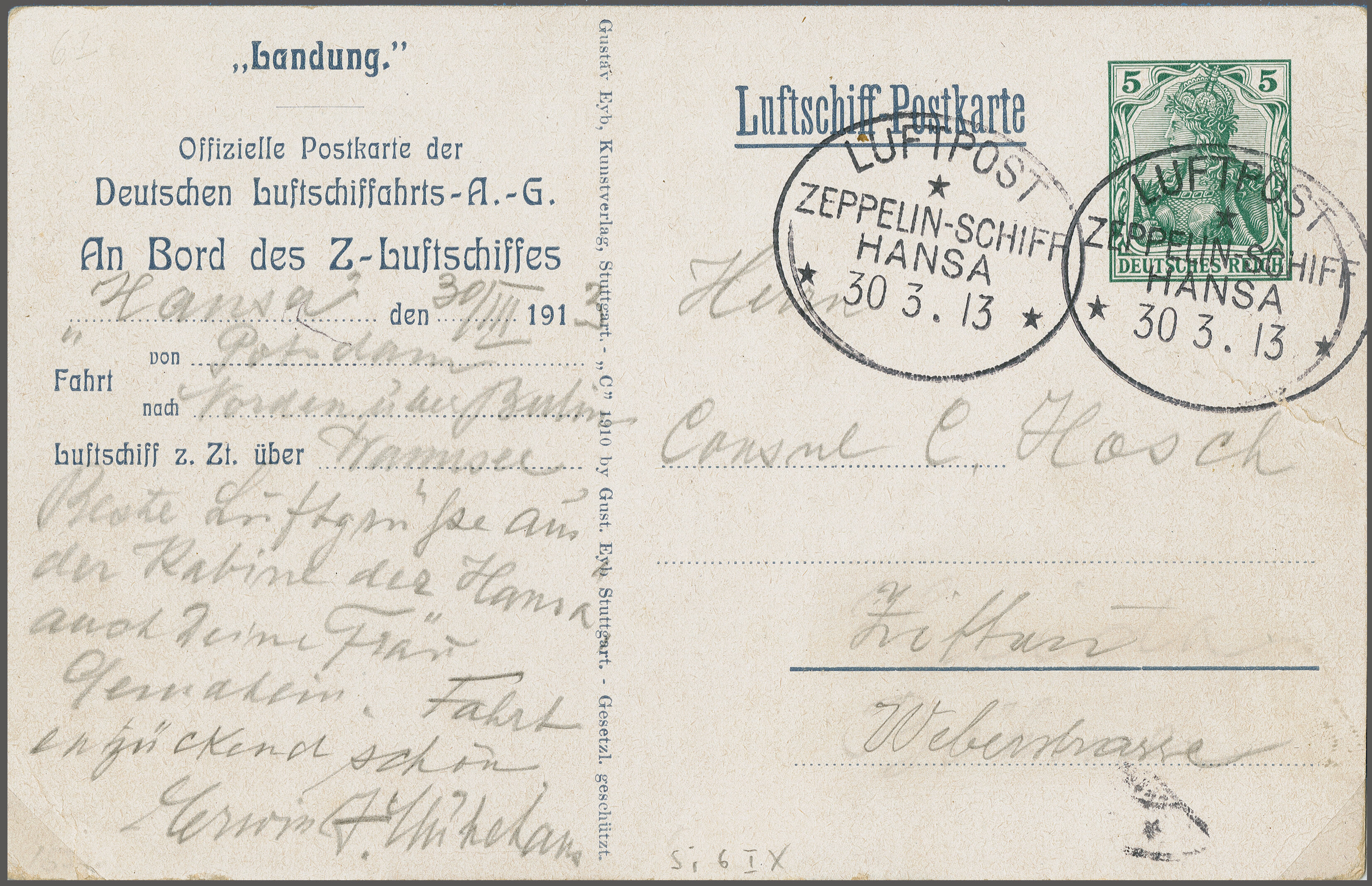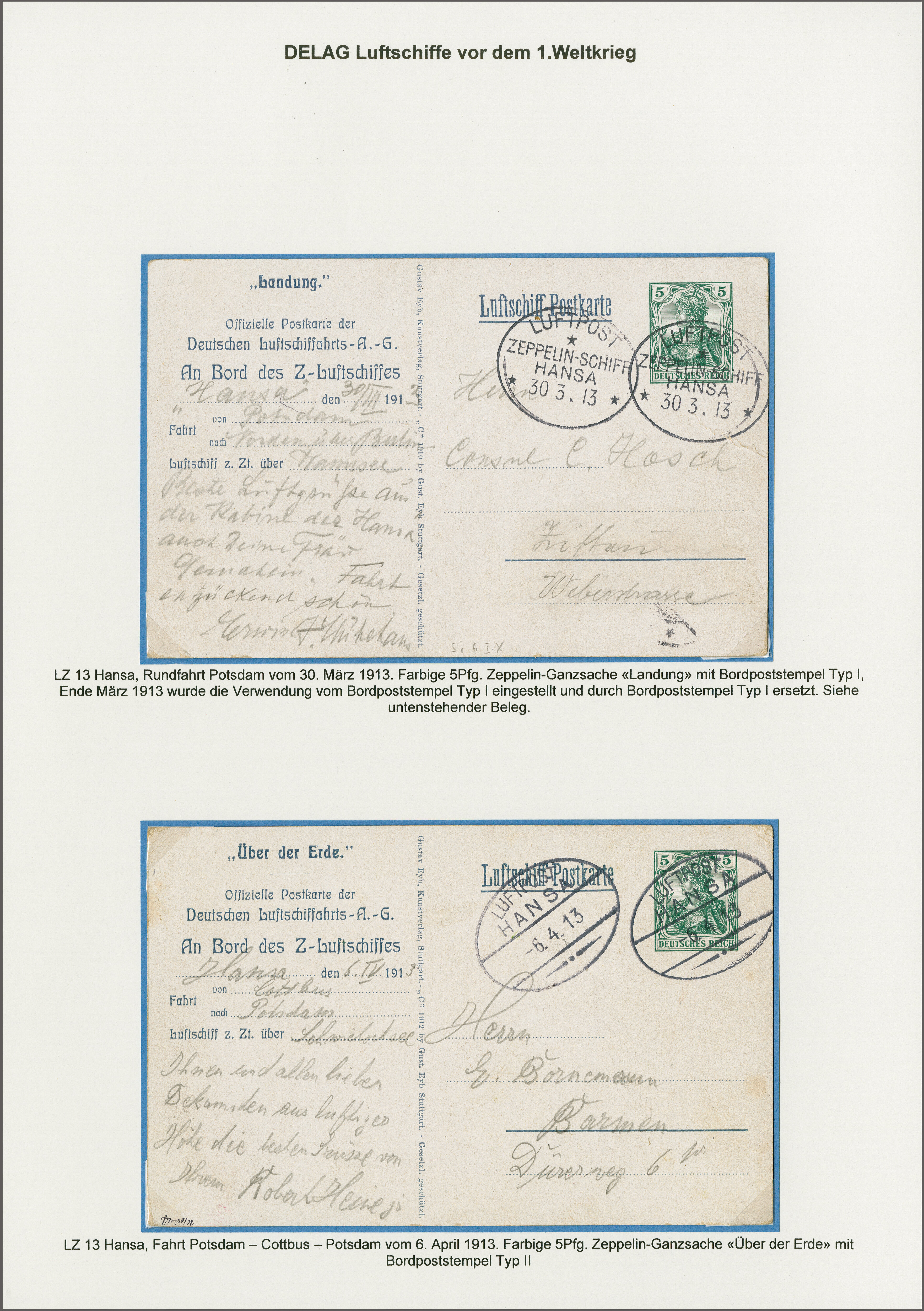 LZ 13 Hansa - Rundfahrt Potsdam 1913 (30. März): Zeppelin Ganzsache 'Landung' zu 5 Pfg. sauber entw. mit Bordpoststempel Typ I nach Zittau, dazu weitere 5 Pfg. Ganzsache 'Über der Erde' der Fahrt vom 6. April 13 sauber gest.