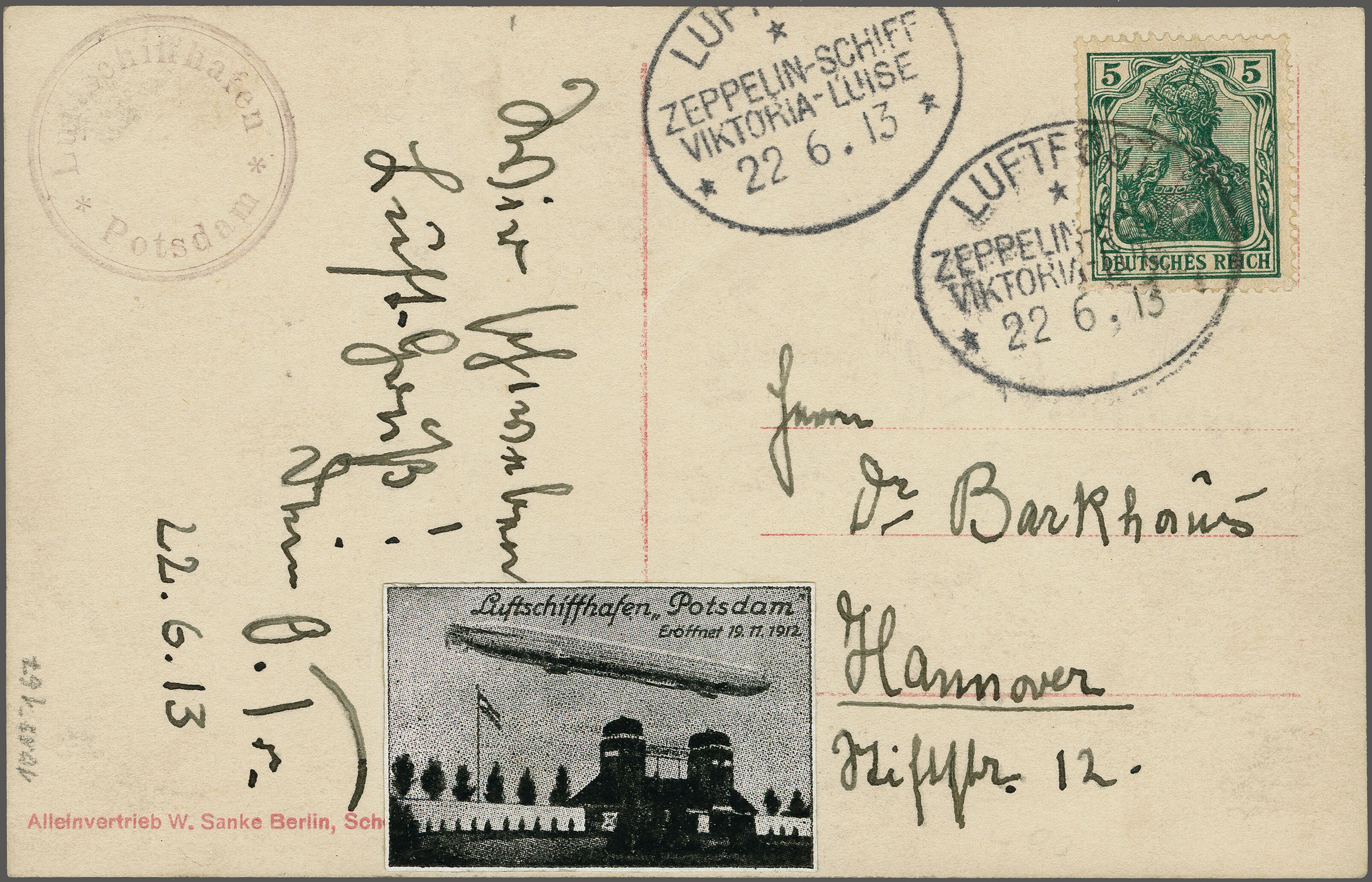 LZ 11 Viktoria Luise - Rundfahrt über Frankfurt 1913 (22. Juni.): Fotokarte Luftschiffhafen Potsdam nach Hannover mit adressseitig entsprechendem Stempel, bzw. kl. s/w Vignette, frankiert mit 5 Pfg. sauber gest. mit schwarzem