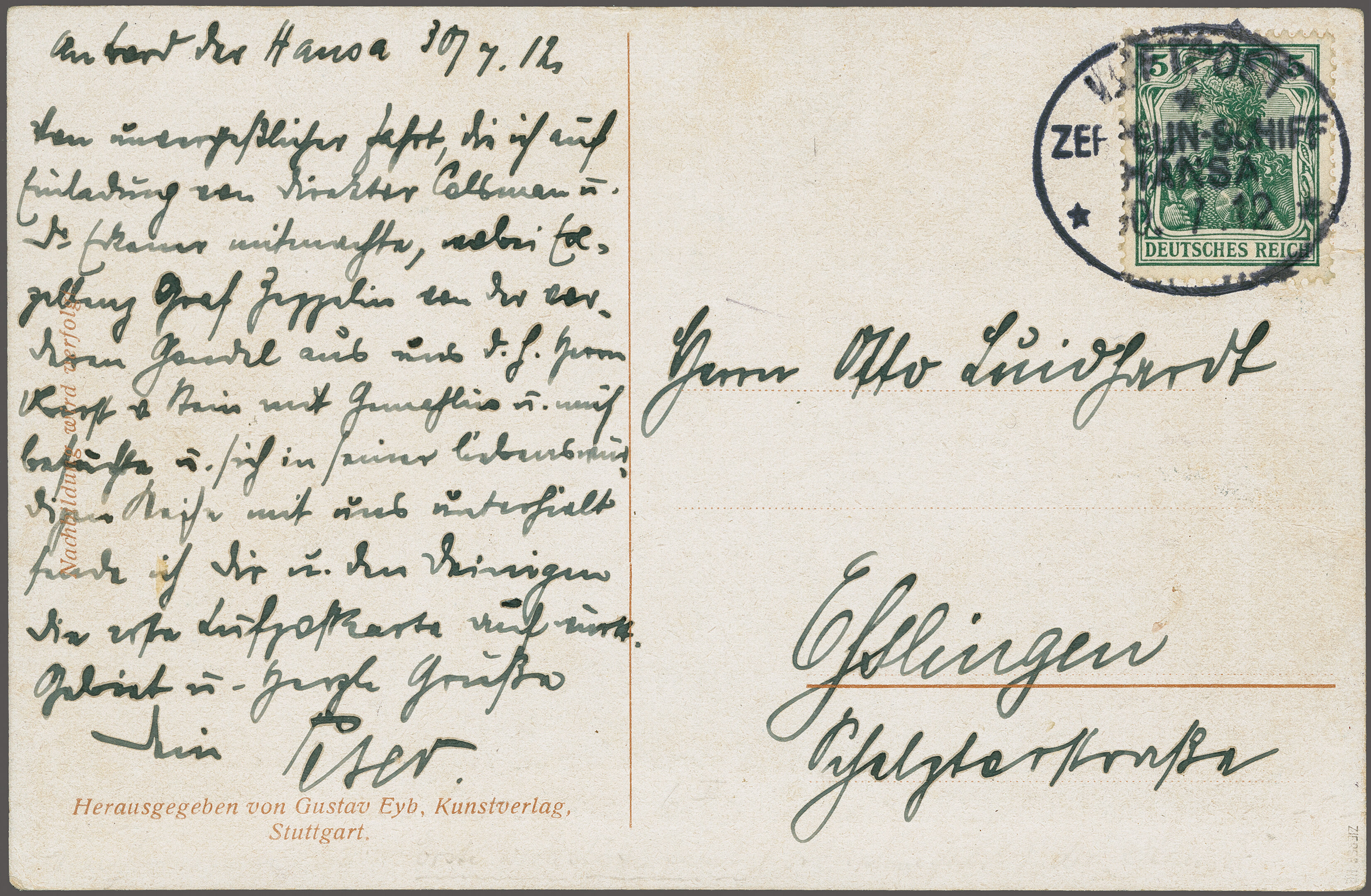 LZ13 Hansa - Probefahrt 1912 (30. Juli): Zeppelinkarte des Kunstverlags Eyb frankiert mit 5 Pfg. entw. mit Bordstp. Type1, welcher offiziell erst ab 3. August zur Eröffnung der Bordpoststelle hätte verwendet werden dürfen, mit