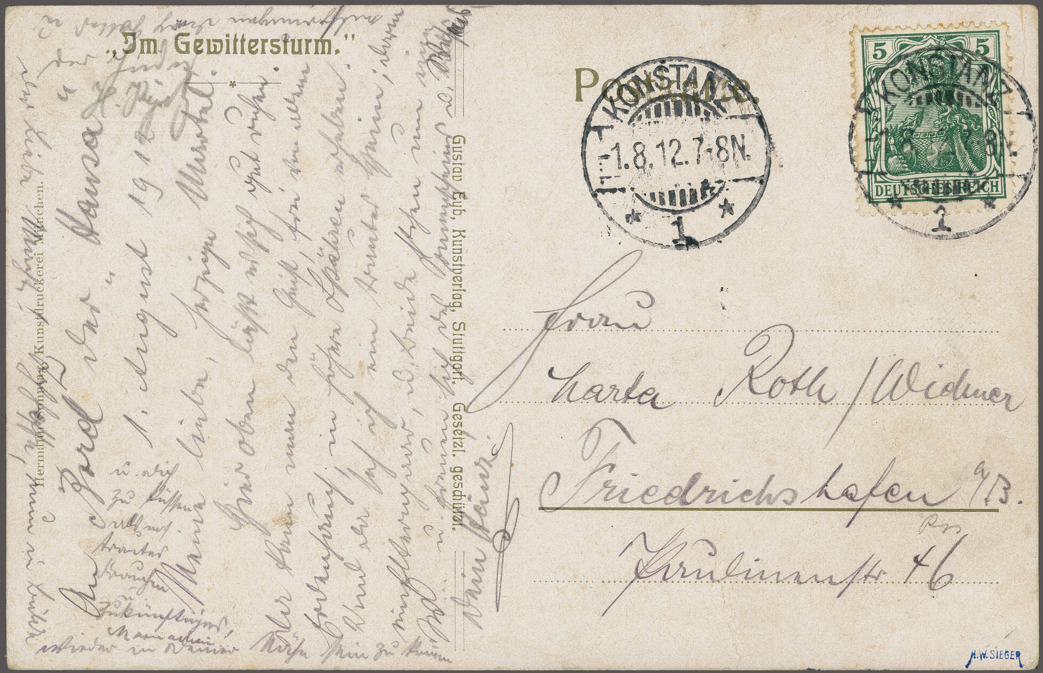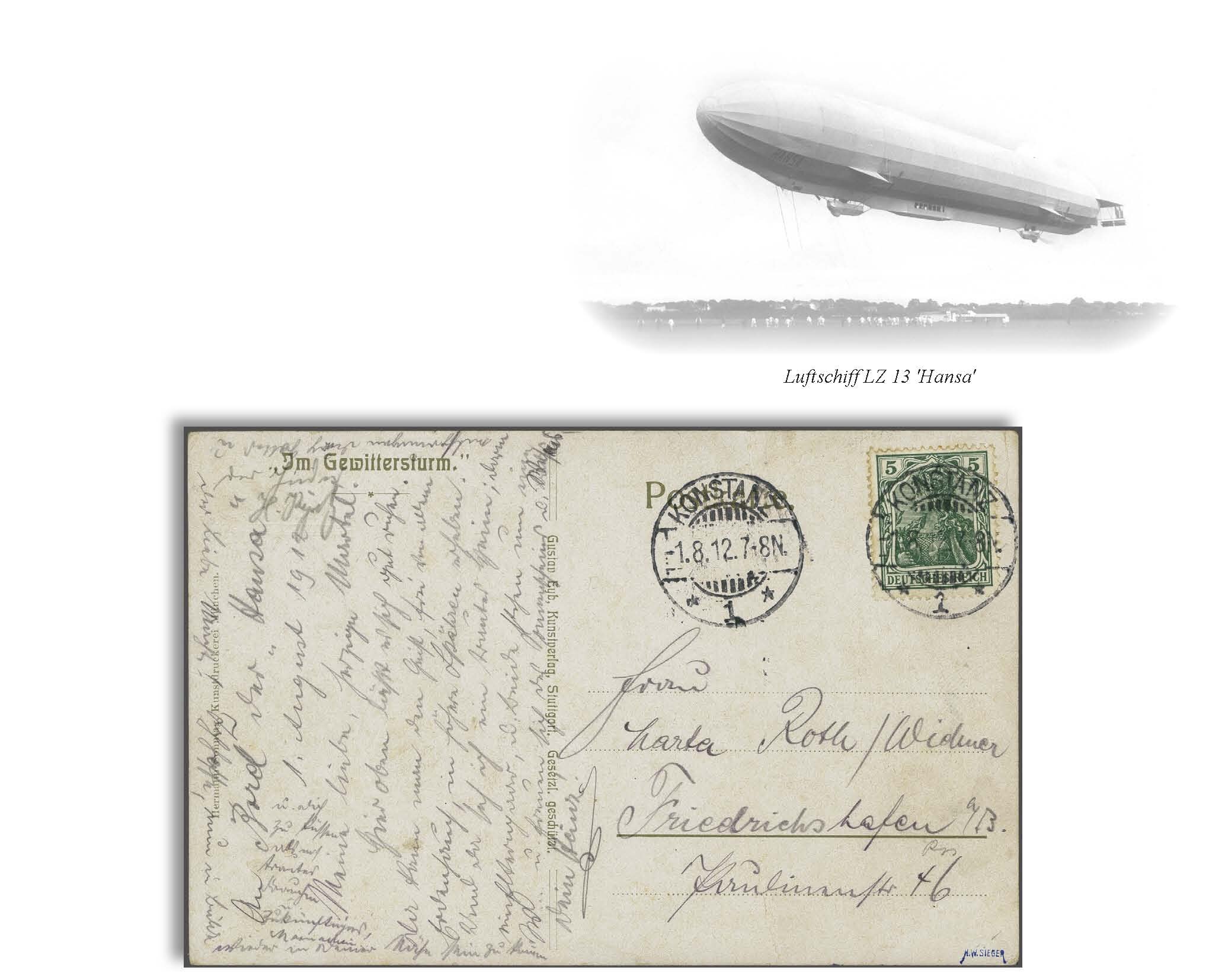 LZ13 Hansa - Probefahrt 1912 (1. August): DELAG Karte ohne Bordstempel vom Abwurf Konstanz, frankiert mit 5 Pfg., sauber gest. "Konstanz 1.8.12 7-8N" nach Friedrichshafen. Eine seltene Karte ohne Bordstempel, vor der Übernahme