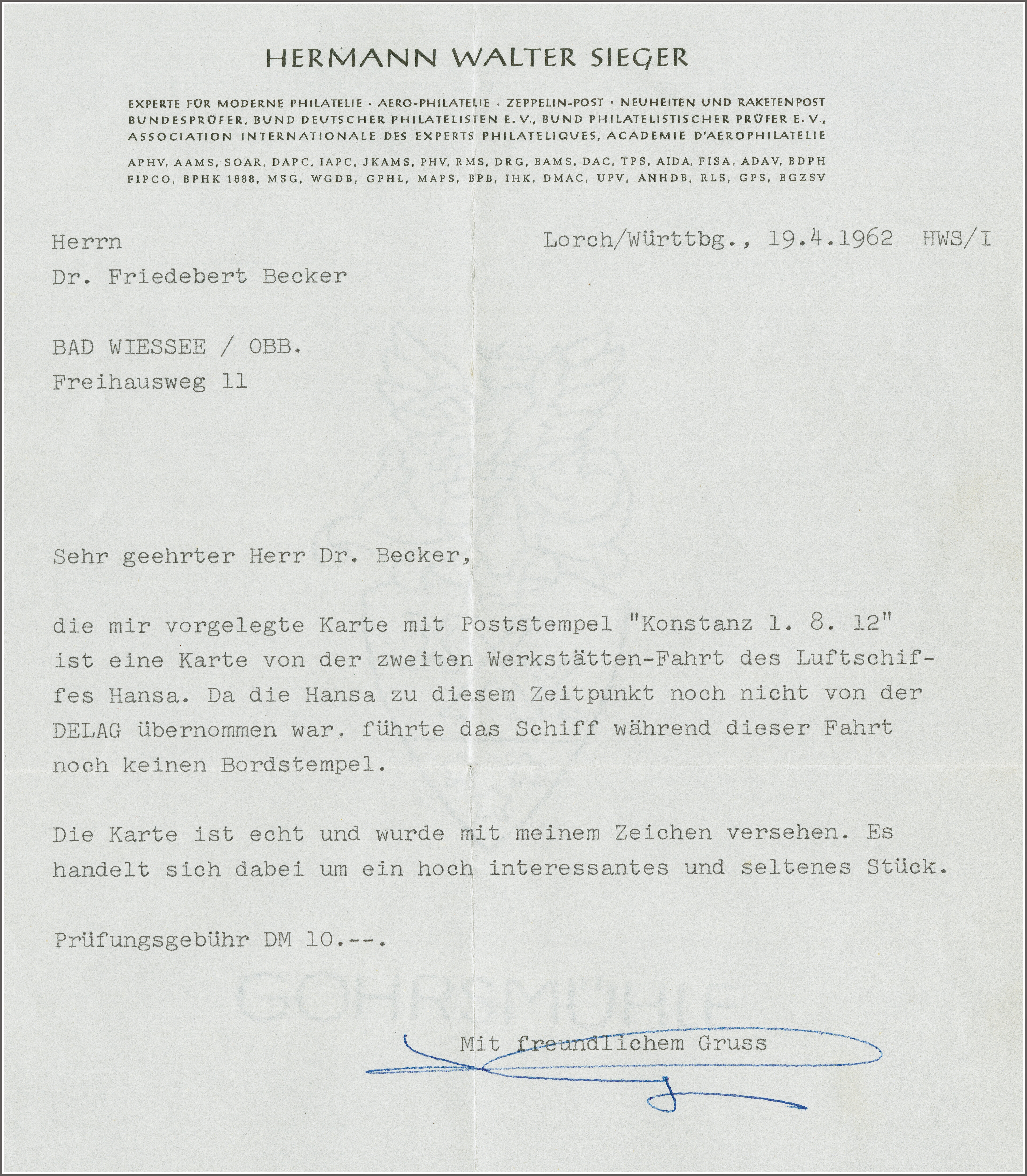 durch die DELAG, da während der Fahrt noch kein Bordstempel mitgeführt wurde. Attest Sieger (1962) Mi. = Euro 4'000. (Image 1)