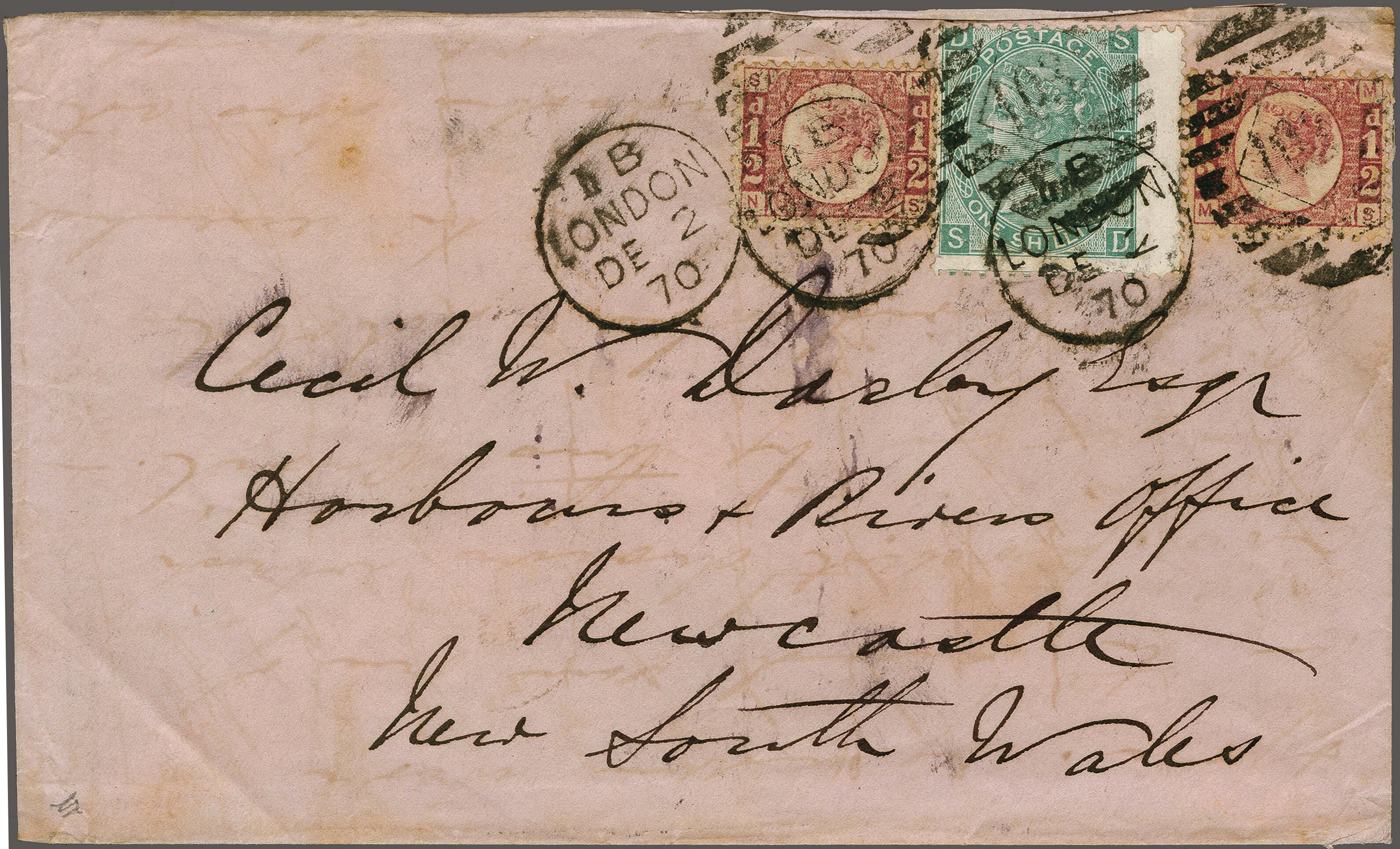 Incoming Mail Overland via Brindisi & Suez 1870 (Dec 2): Cover from London to Newcastle, New South Wales bearing 1870 Great Britain bantam ½ d. rose pl. 6, two examples used with 1 s. green pl. 4 cancelled by the London