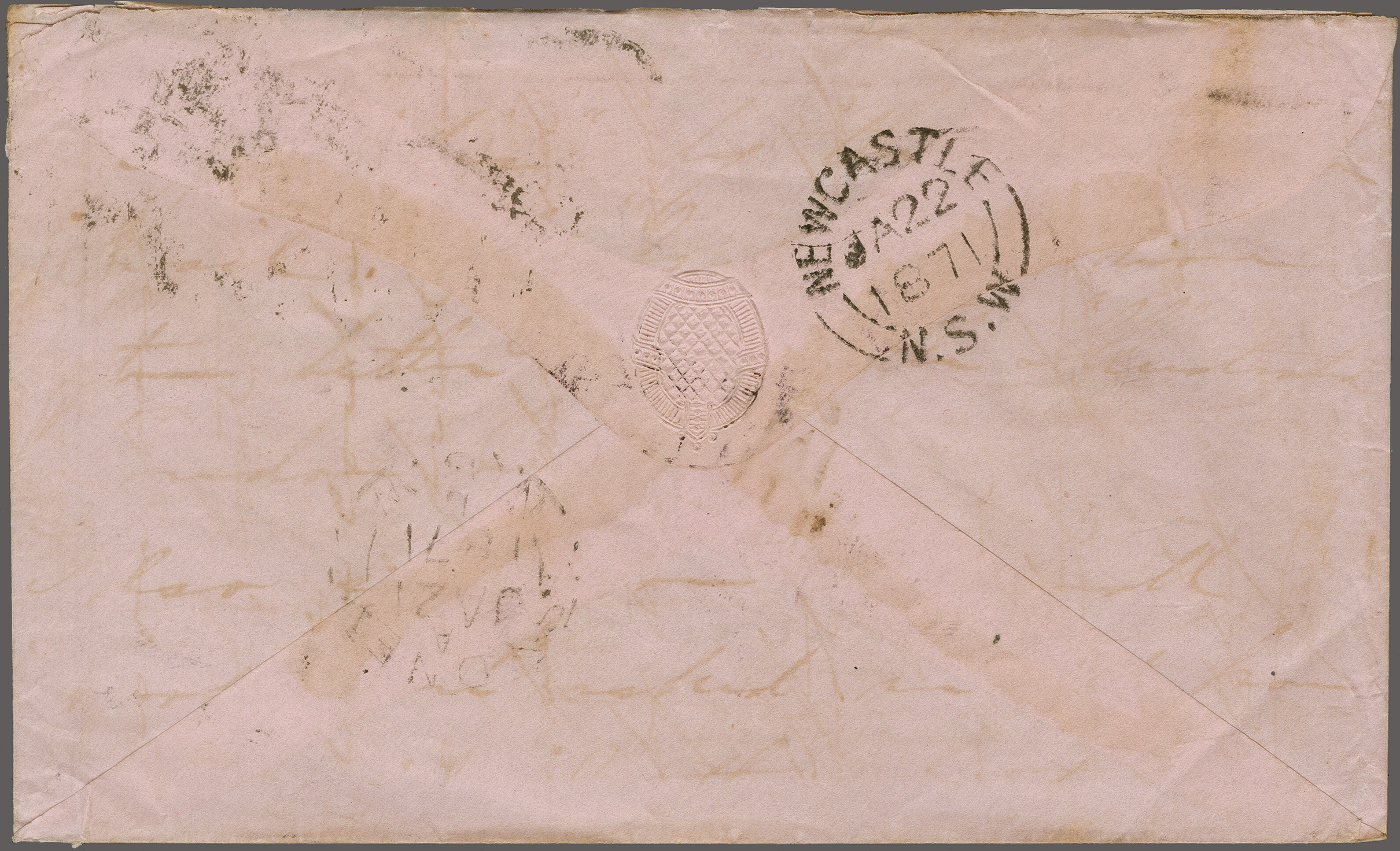 1871 and Melbourne (18 Jan) to Sydney (21 Jan); by rail to Newcastle, arriving 22 Jan 1871 (51 days). Note: The 1 s. 1 d. rate to the Australian Colonies was only available for 15 months from October 1869. By way of comparison, only about fifteen