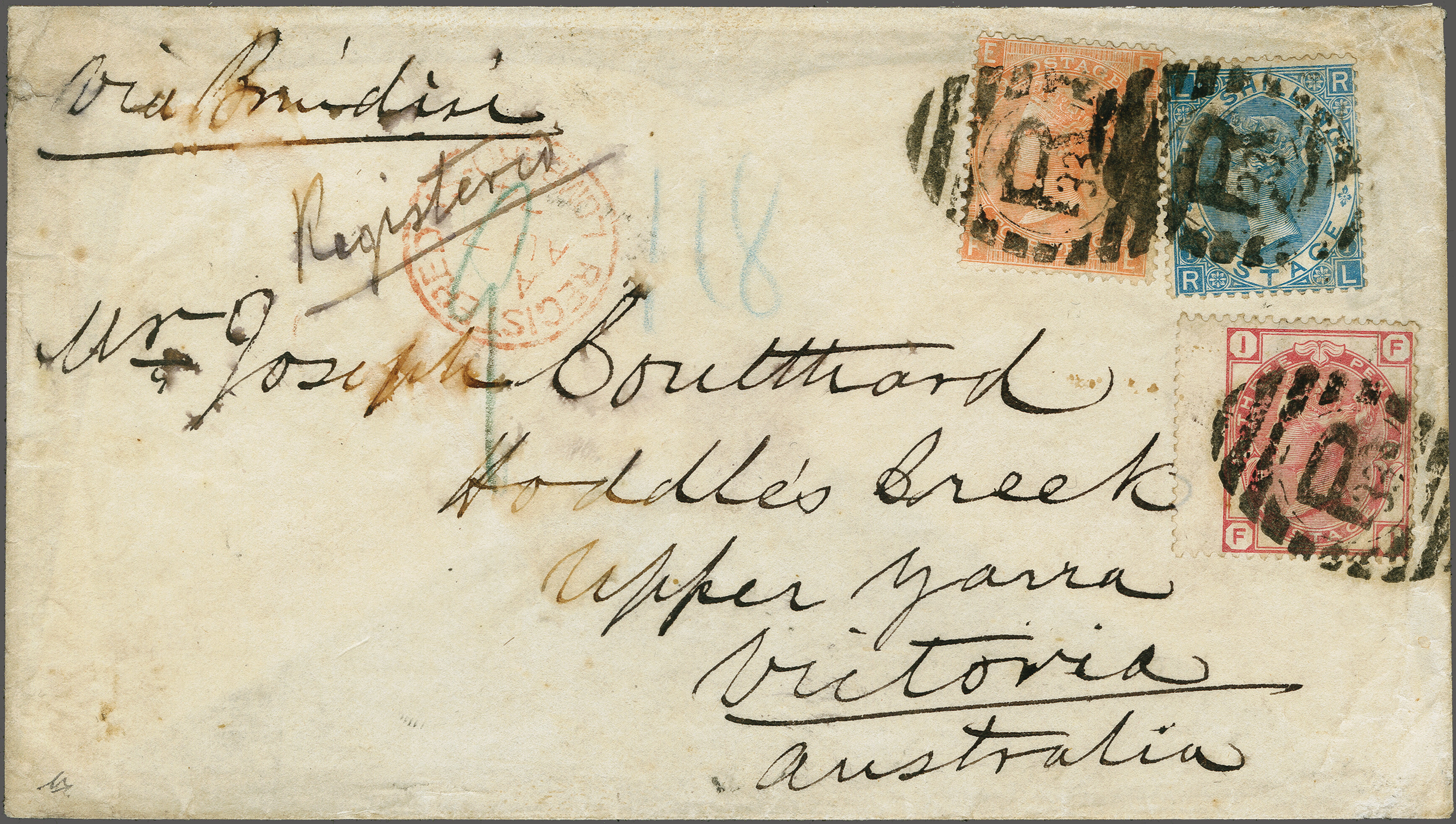 obliterator and prepaying 2 s. 7 d. comprising 2 s. 3 d. for a 1½ ounce ship letter to Victoria plus 4 d. registration. Endorsed “Via Brindisi” at upper left and with manuscript “Registered” in black and London registered datestamp in red. A