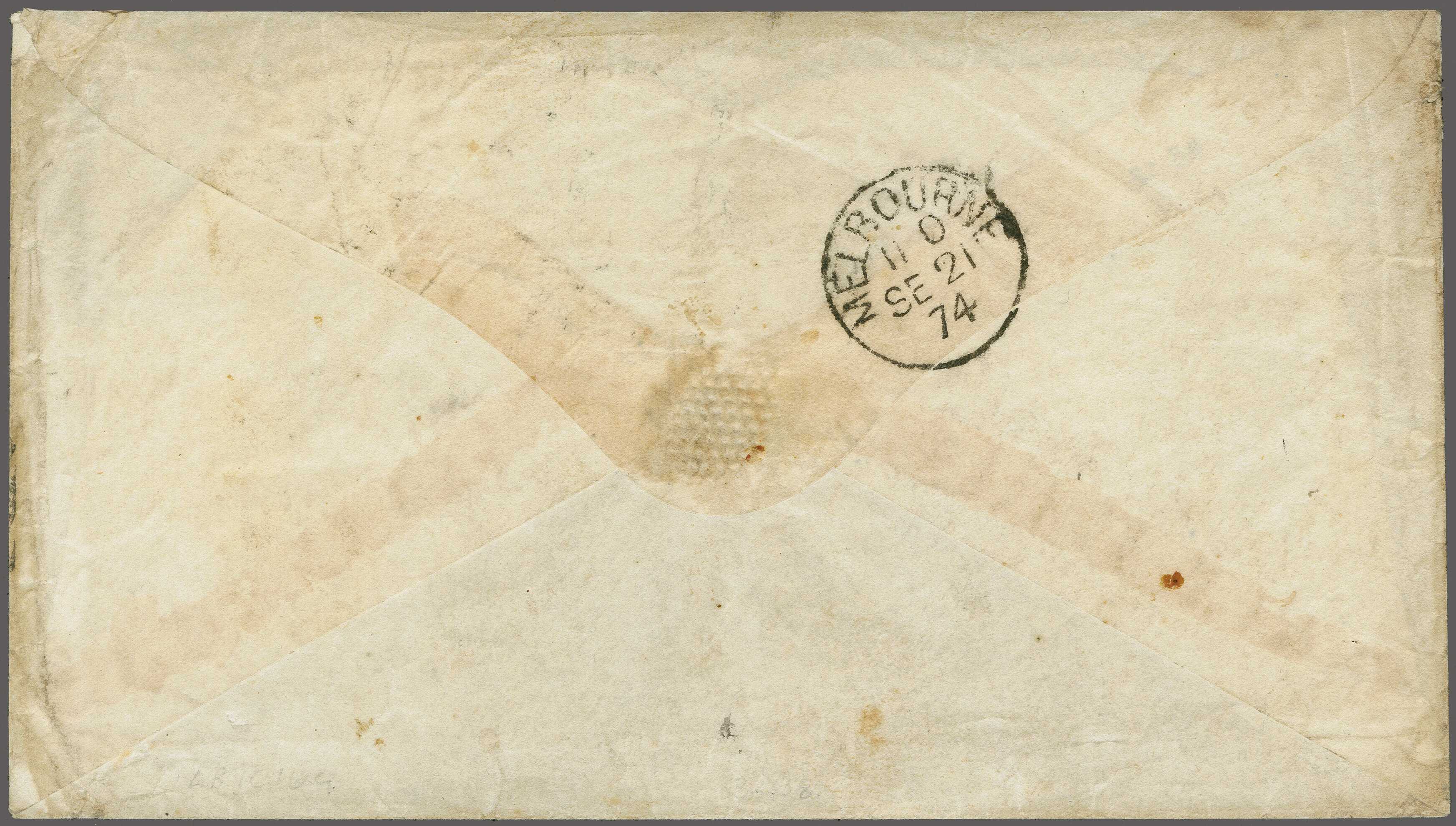 “Golconda” (29 Aug) via King Georges Sound (14 Sept) and Adelaide (19 Sept) to Melbourne, arriving 21 Sept 1874 (45 days). Note: This cover is recorded as Cover No. 6 on Page 171 in “Great Britain: Mixed-franking covers illustrating postage stamp