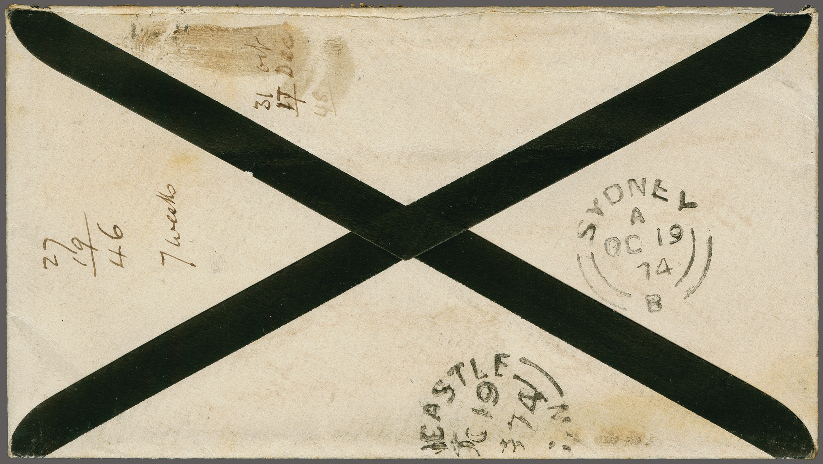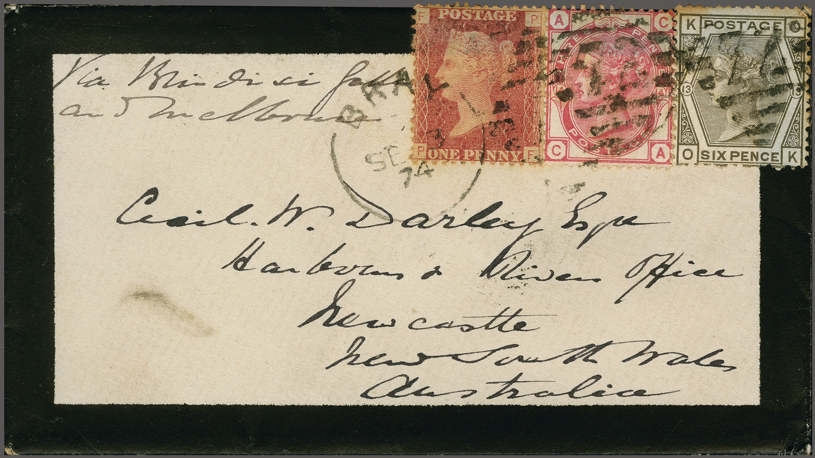 (25 Sept); “Pera” via King Georges Sound (8 Oct) and Adelaide (12 Oct) to Melbourne (15 Oct); “Ellora” (15 Oct) to Sydney (19 Oct); by rail to Newcastle, arriving 19 Oct 1874 (46 days). Note: This cover is not recorded “Great Britain: Mixed-franking