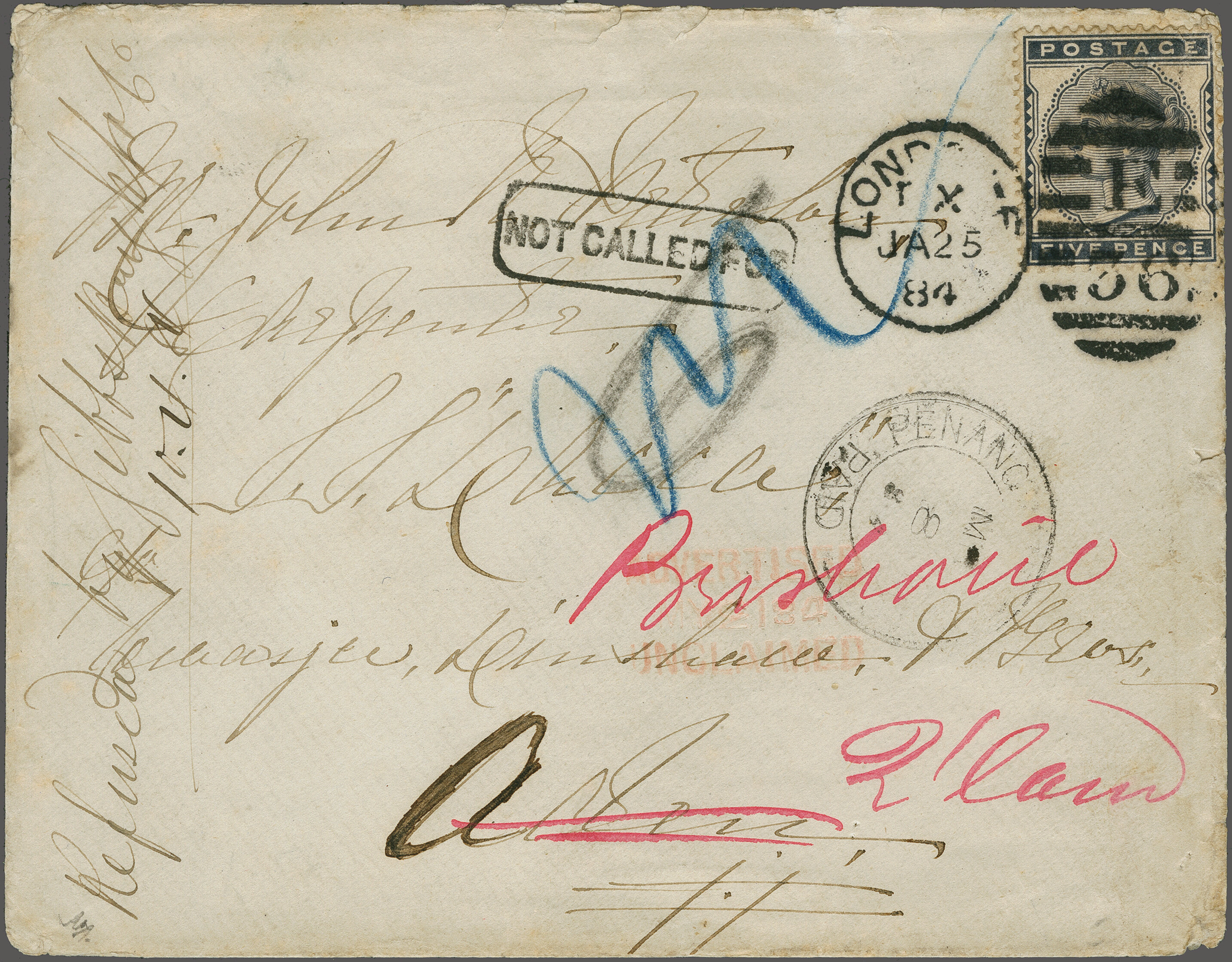 Incoming Mail Overland via Brindisi & Suez 1884 (Jan 25): Cover from London to Aden, redirected via Penang to Brisbane, Queensland bearing Great Britain 1881 5 d. indigo, cancelled by the London duplex prepaying 5 d. for a
