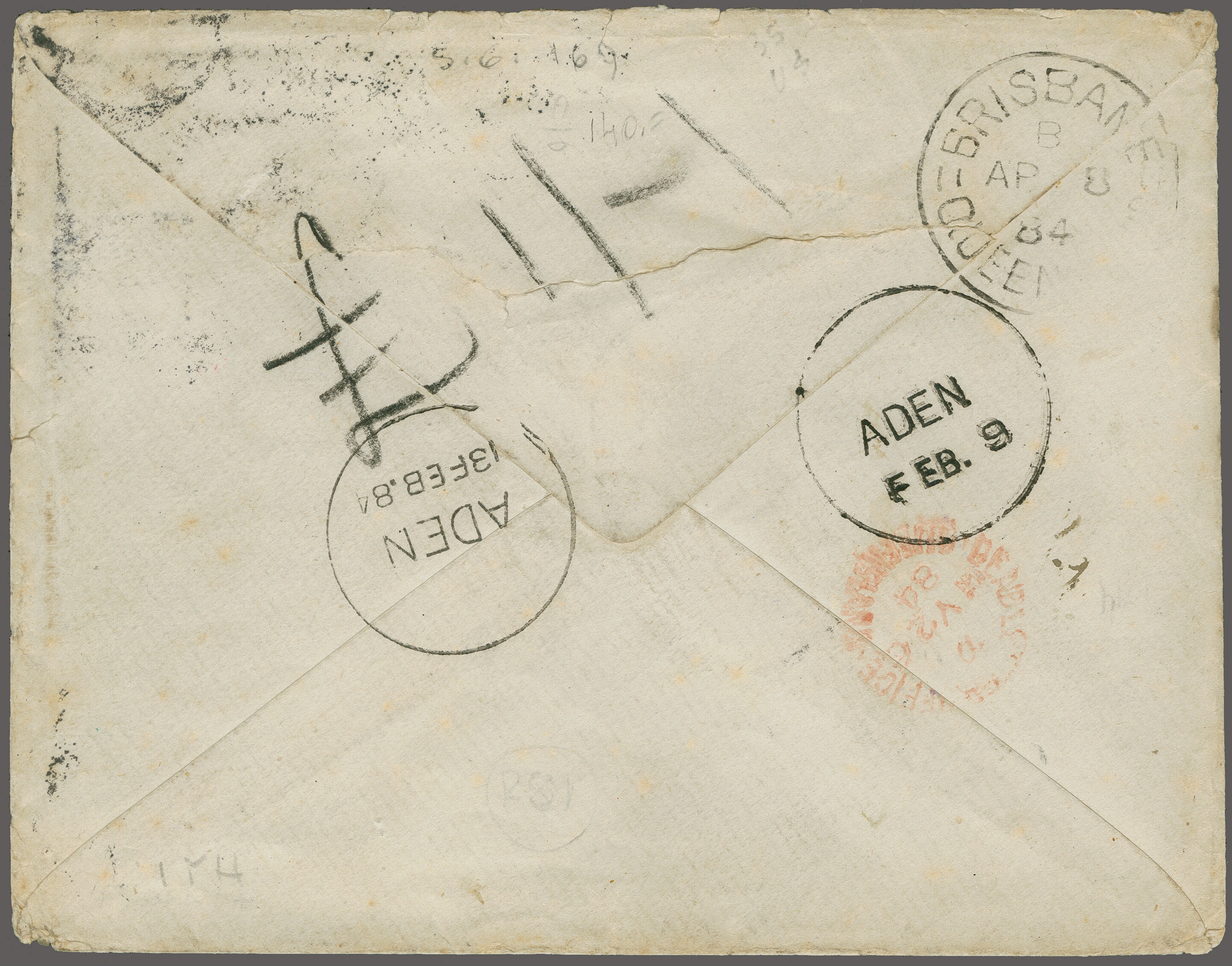 with the Brisbane Dead Letter Office datestamp in red (26 May). A very fine and rare franking from Aden to the Australian Colonies, particularly so for Queensland. Route - P&O Line: Departed London 25 Jan 1884 per “Cathay” via Alexandria and Suez
