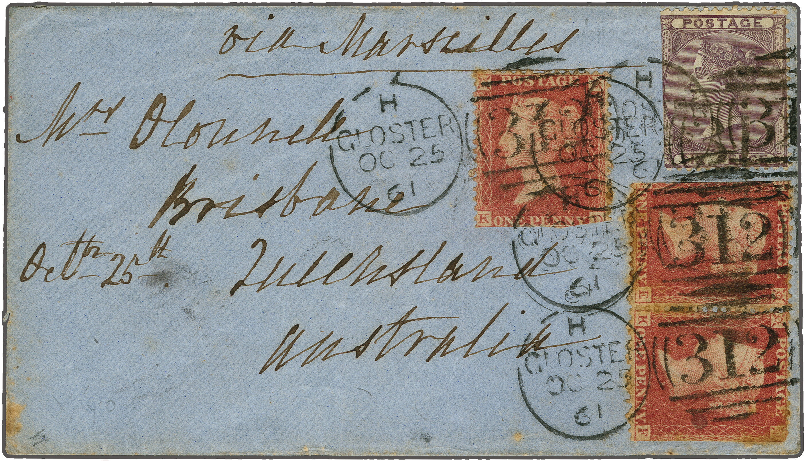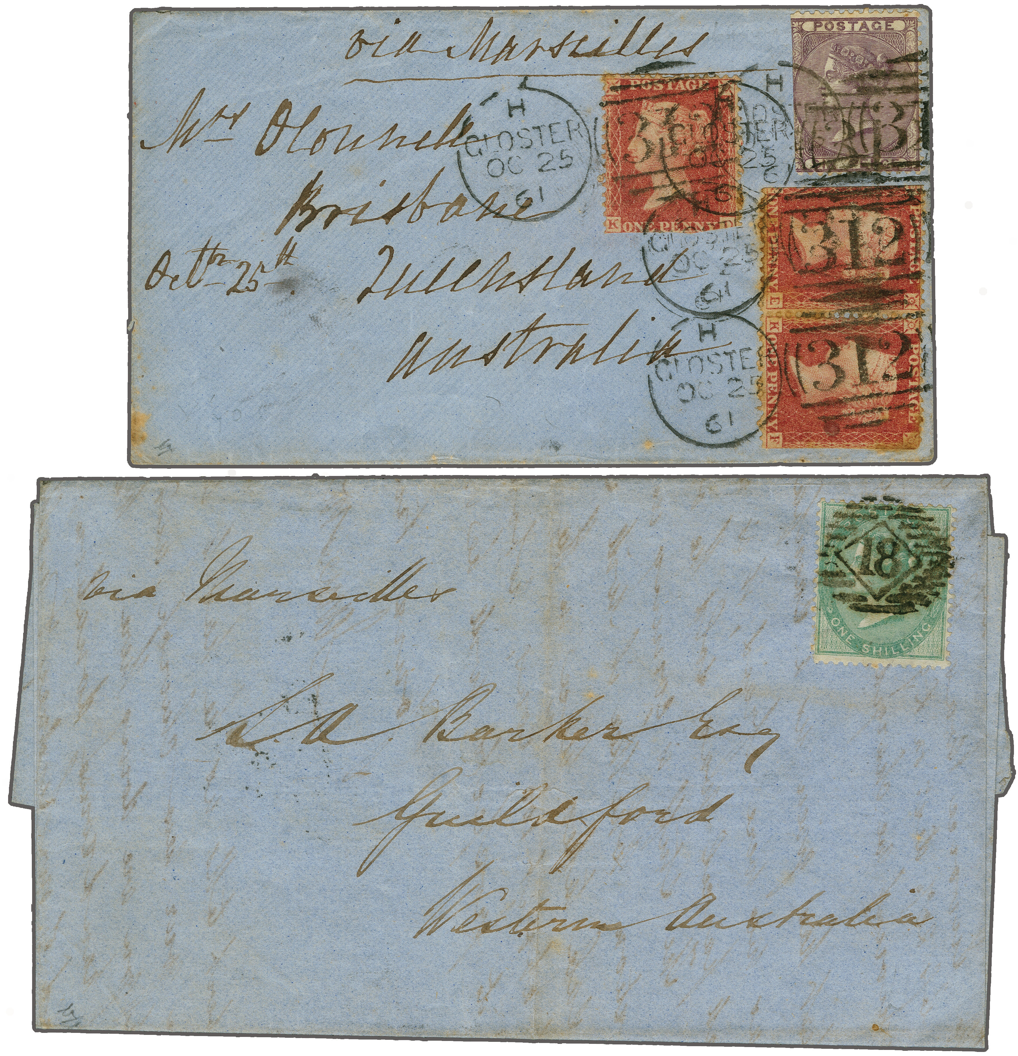 prepaying 9 d for a 1⁄4 ounce ship letter to Queensland. Each cover endorsed "via Marseilles" and both covers fine and both addressed to scarcer Colonies for mail from Great Britain (2 covers). 1. Route - Departed London 18 May 1860 by rail to