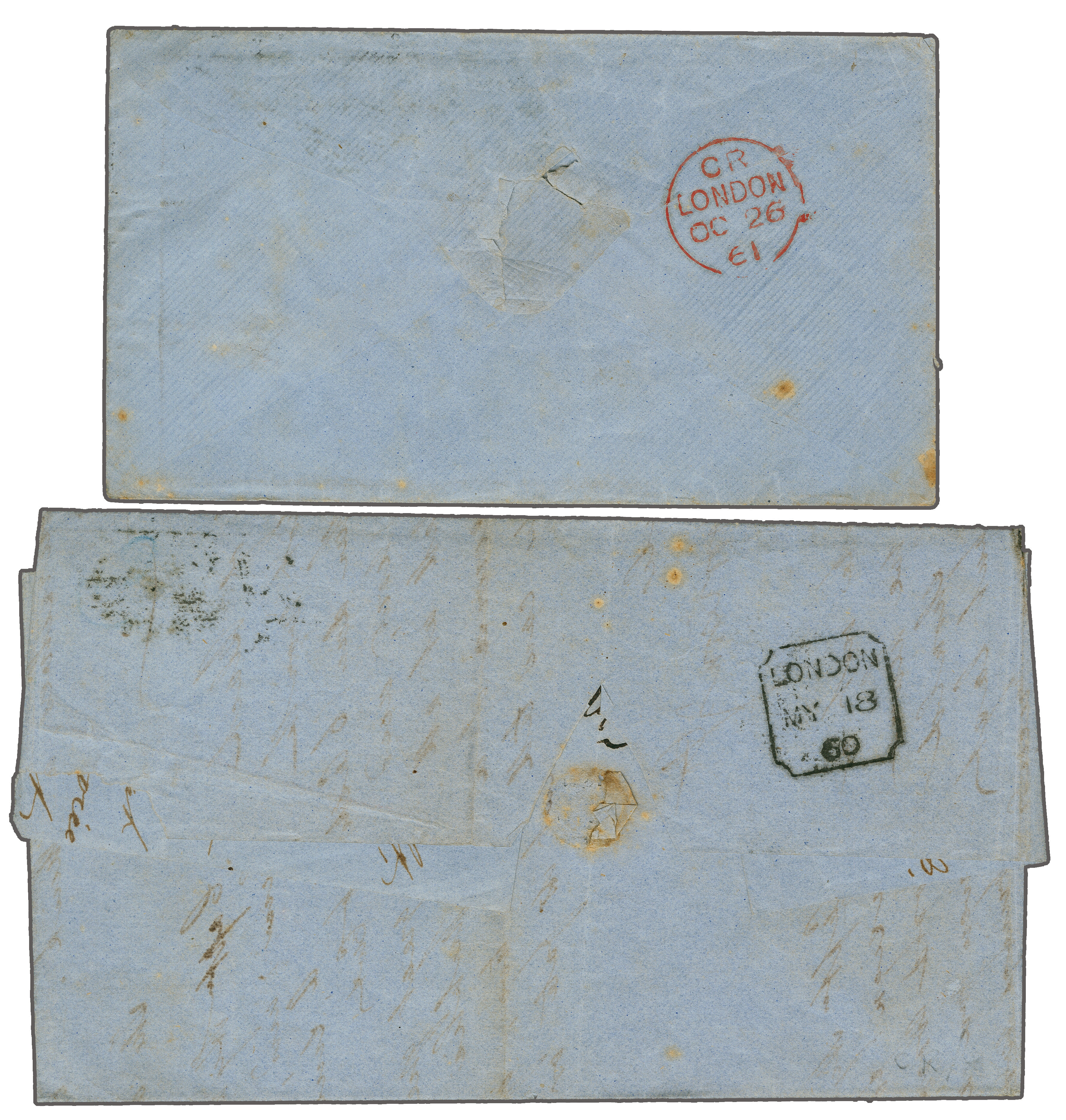 Incoming Mail Overland via Marseilles 1860 (May 18): Entire from London, England to Guildford, Western Australia (from the Barker correspondence) bearing 1856 Great Britain 1 s. pale green boldly cancelled London “18” numeral,