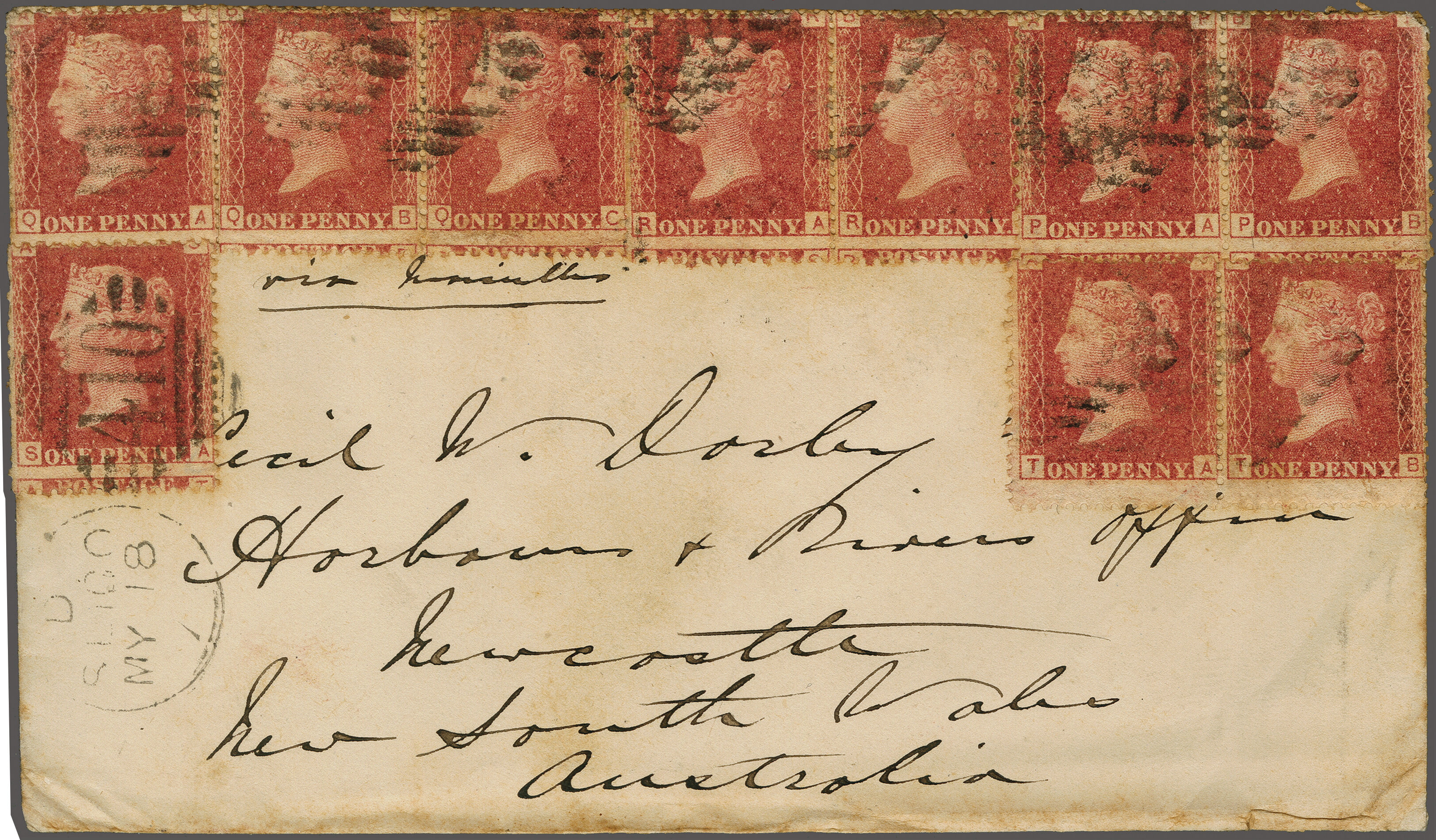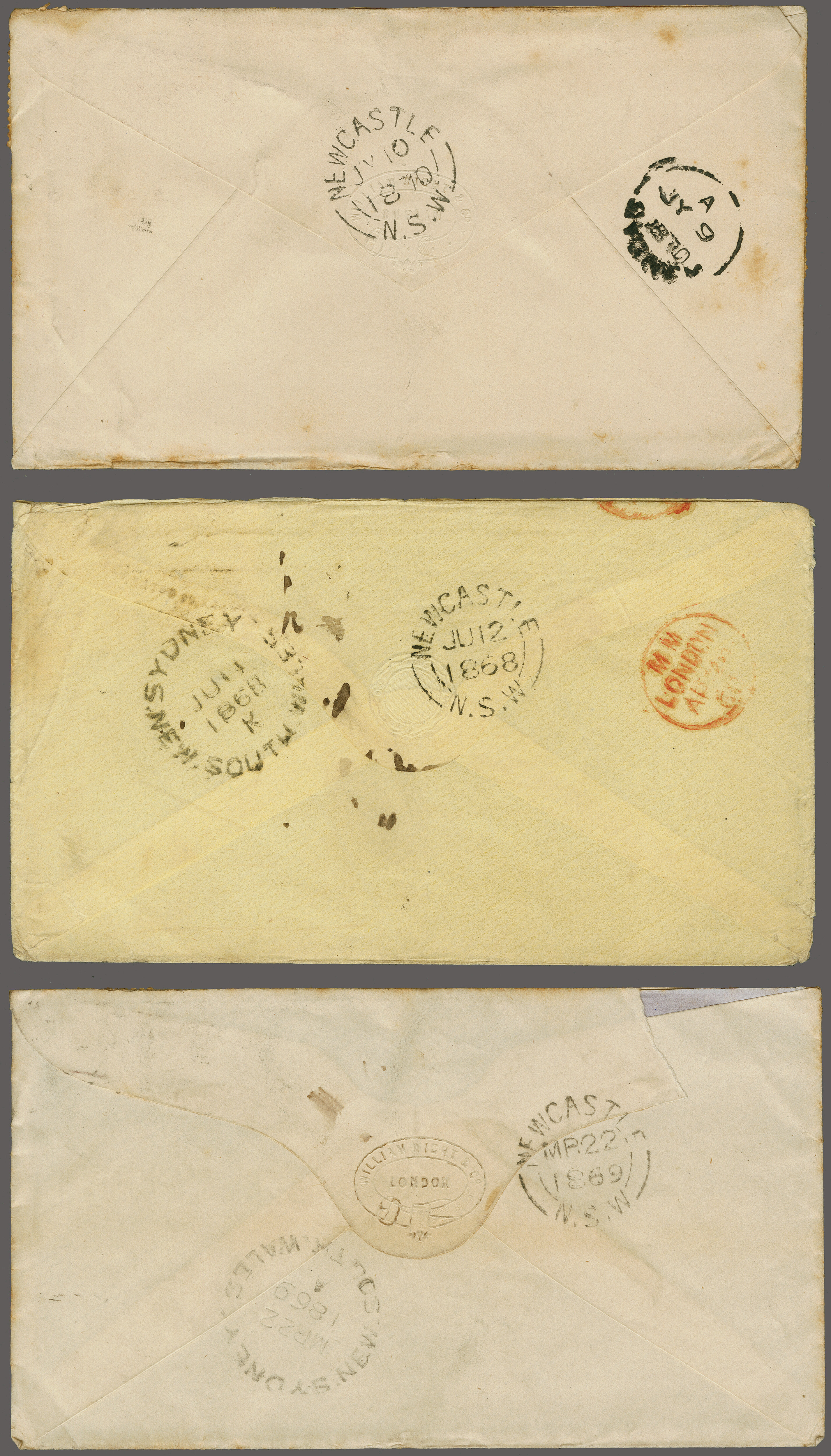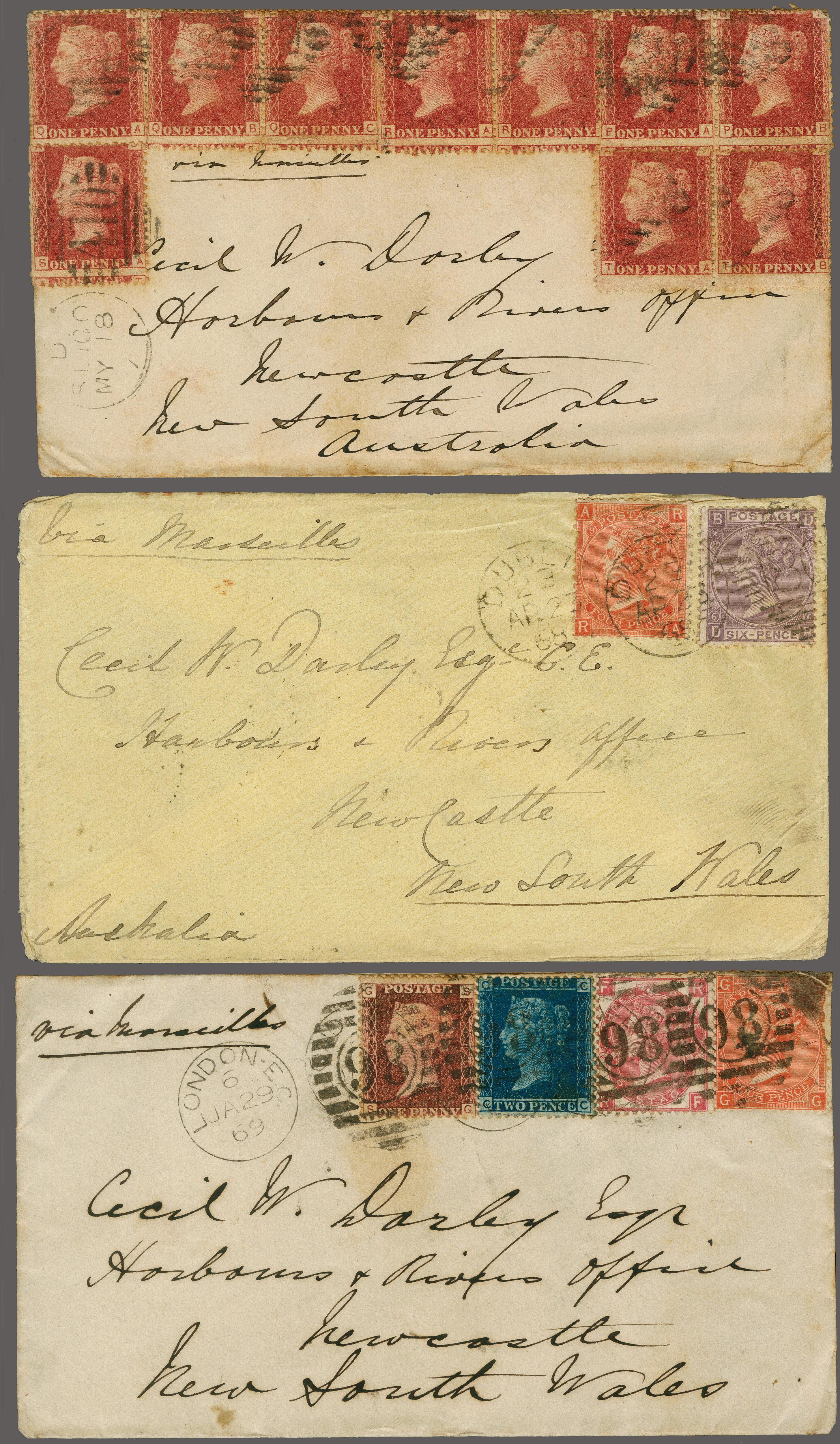 Incoming Mail Overland via Marseilles 1868-70: Three covers from England to New South Wales, all from the Darley correspondence and all at the 10 d. rate via Marseilles, including an 1870 cover with 1 d. reds (ten examples), 4