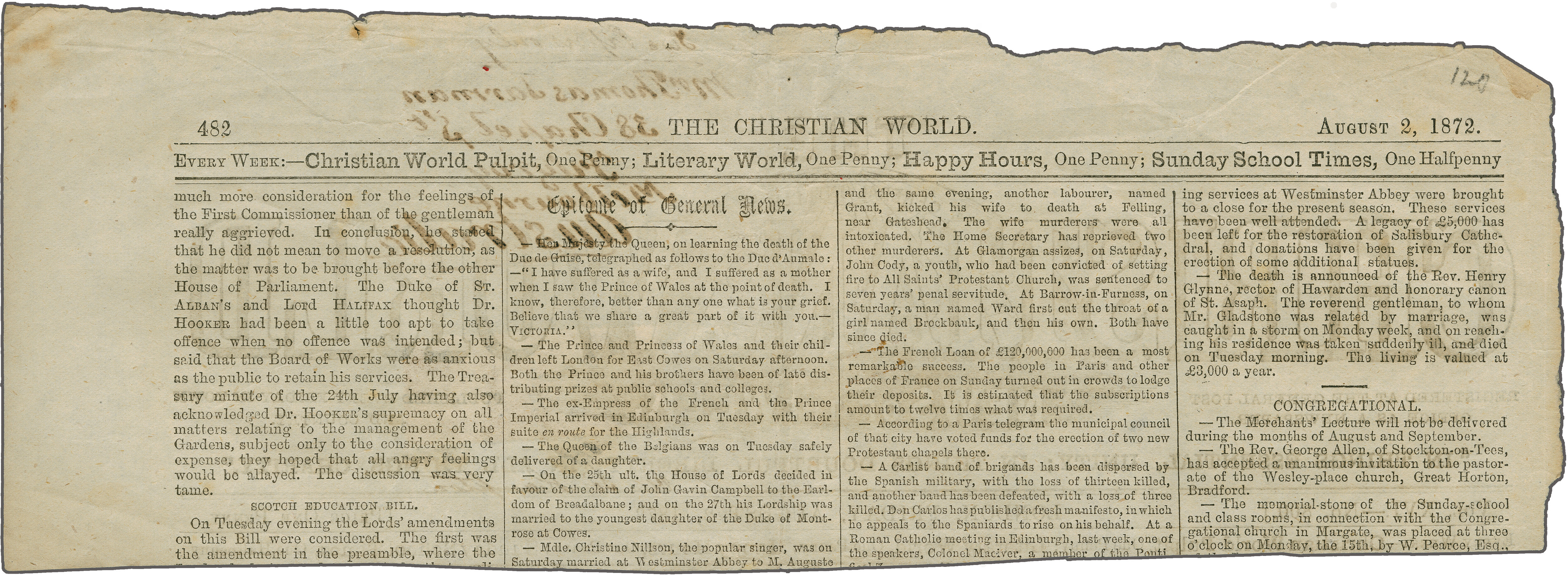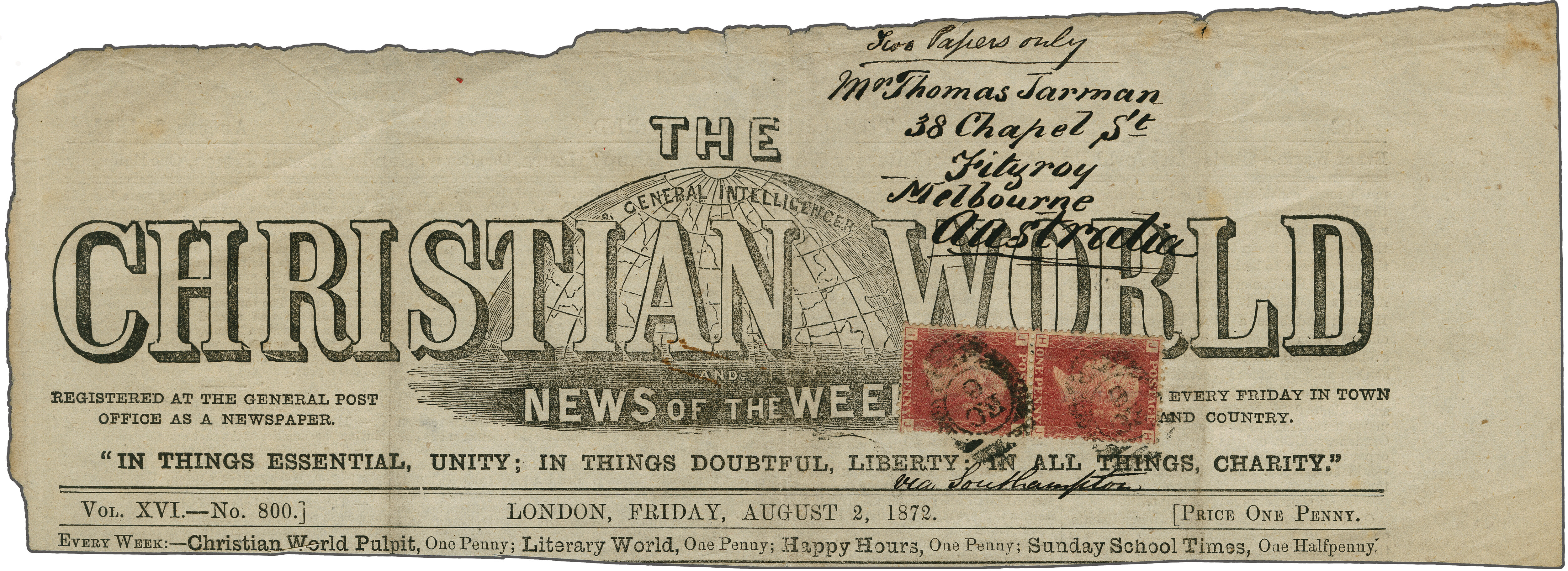 Incoming Mail Overland via Southampton 1872 (Aug 29): Large part newspaper front of “The Christian World” mailed from London to Melbourne, Victoria and endorsed "Two Papers Only", bearing 1864 Great Britain 1 d. red pair,
