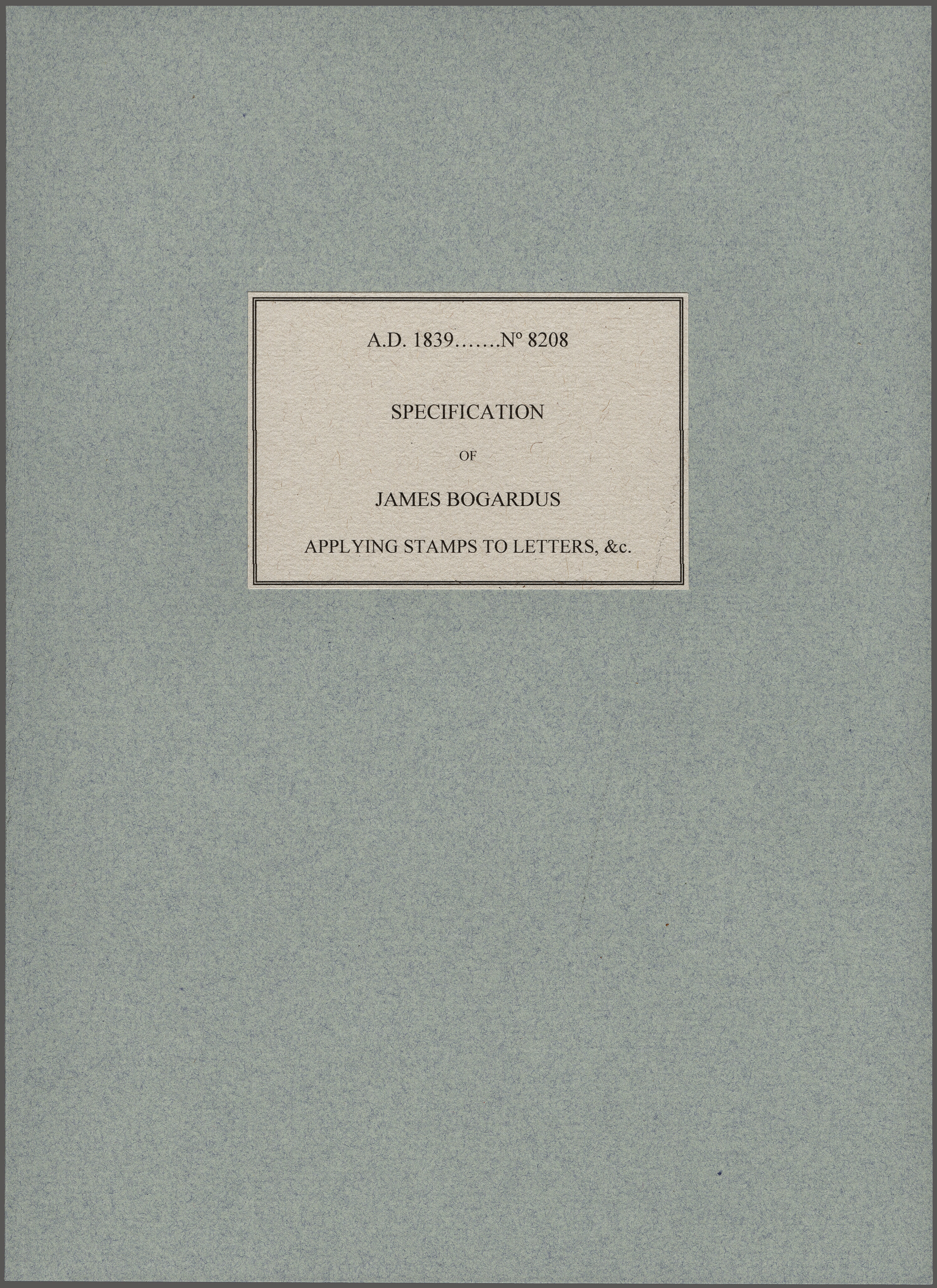 1839: Rebound "A.D. 1839 No. 3208 / Specification of James Bogardus, Applying Stamps to Letters &c." printed in black with blue covers, slightly restored, printed by Eyre and Spottiswoode in Loindon (1857). Well rebound, a