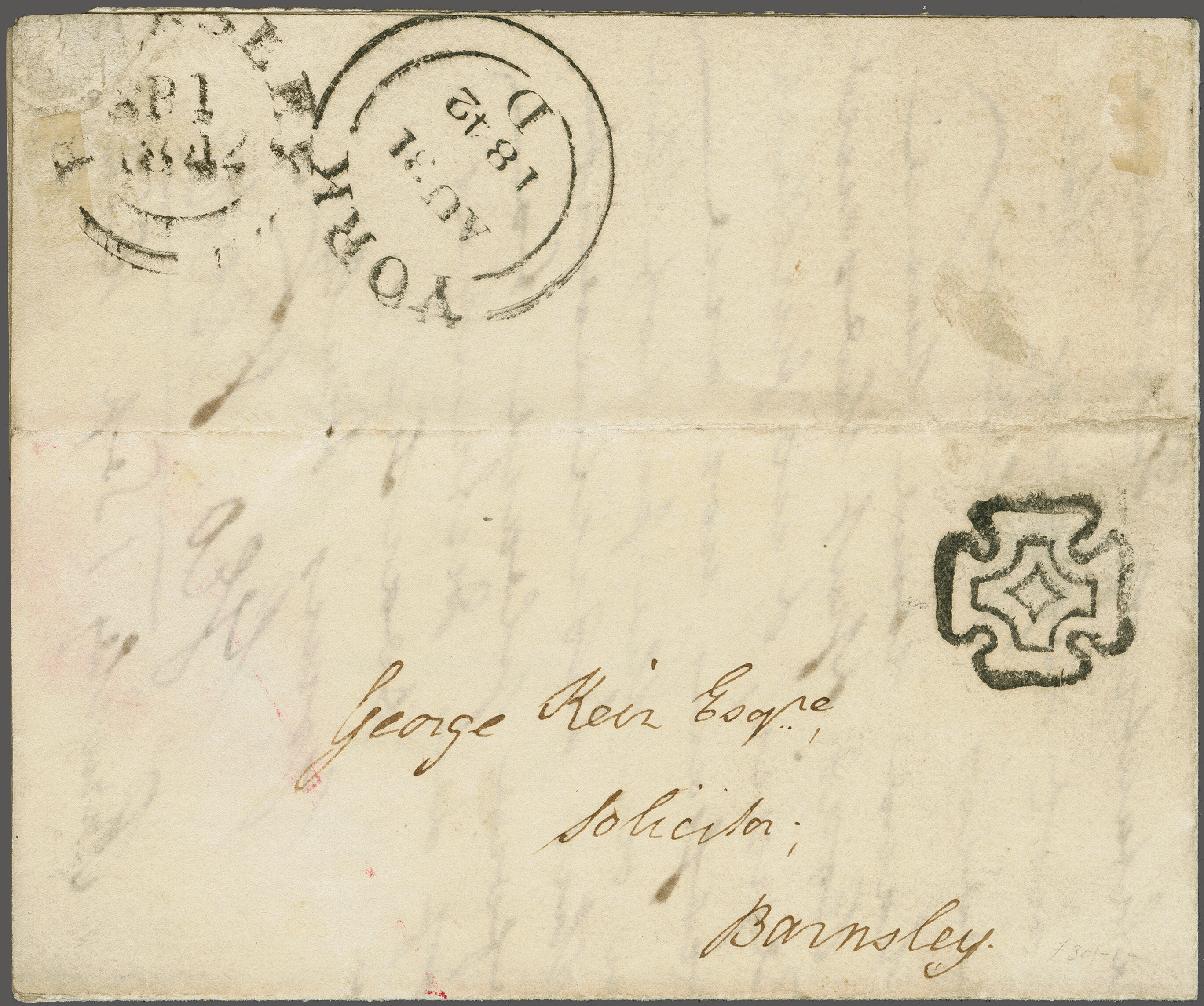 1842 (Aug 31): Entire letter from York to Barnsley struck with superb strike of the distinctive YORK Maltese Cross in black with double arc York circular datestamp (Aug 31) and Barnsley arrival cds (Sept 1) both displaying