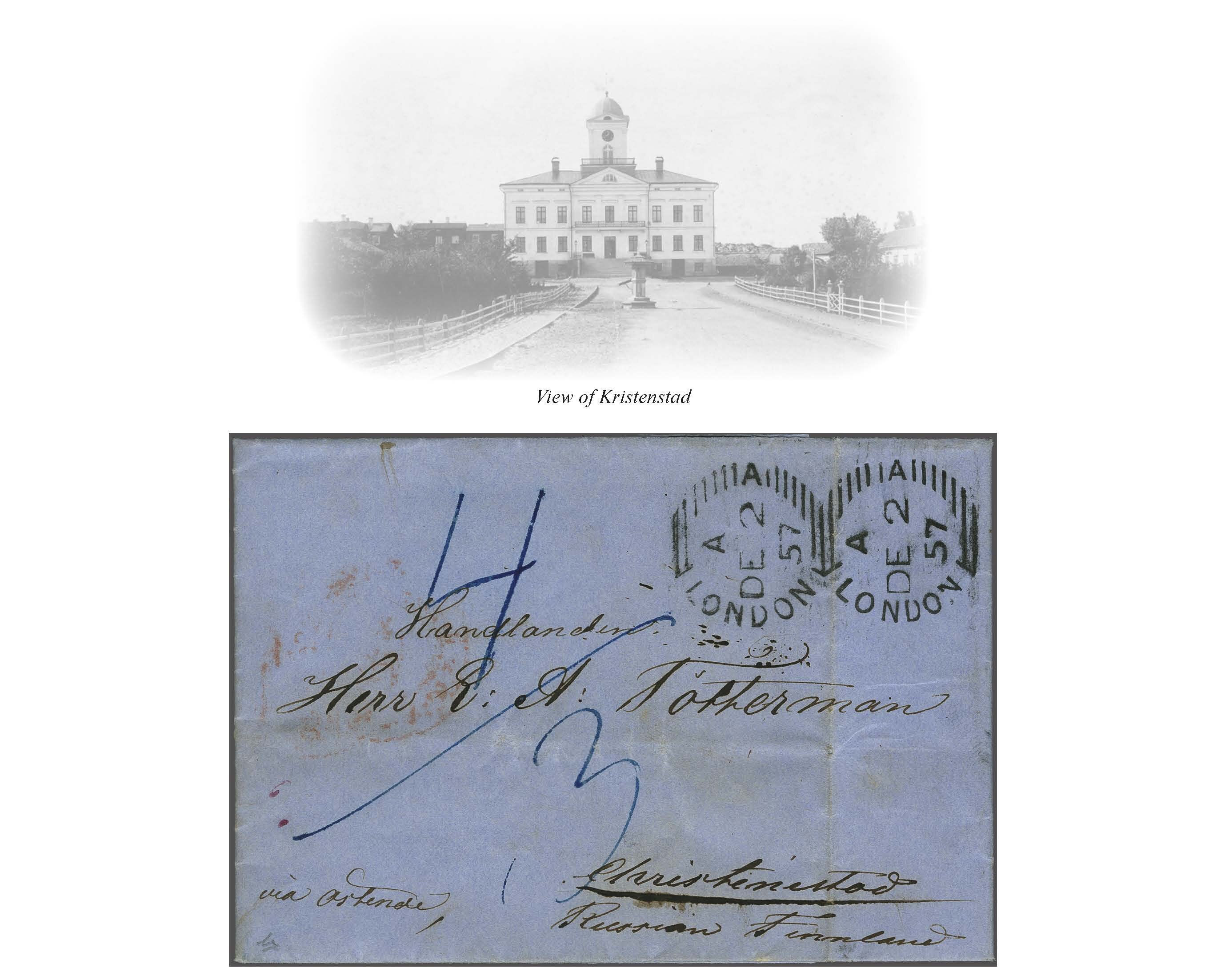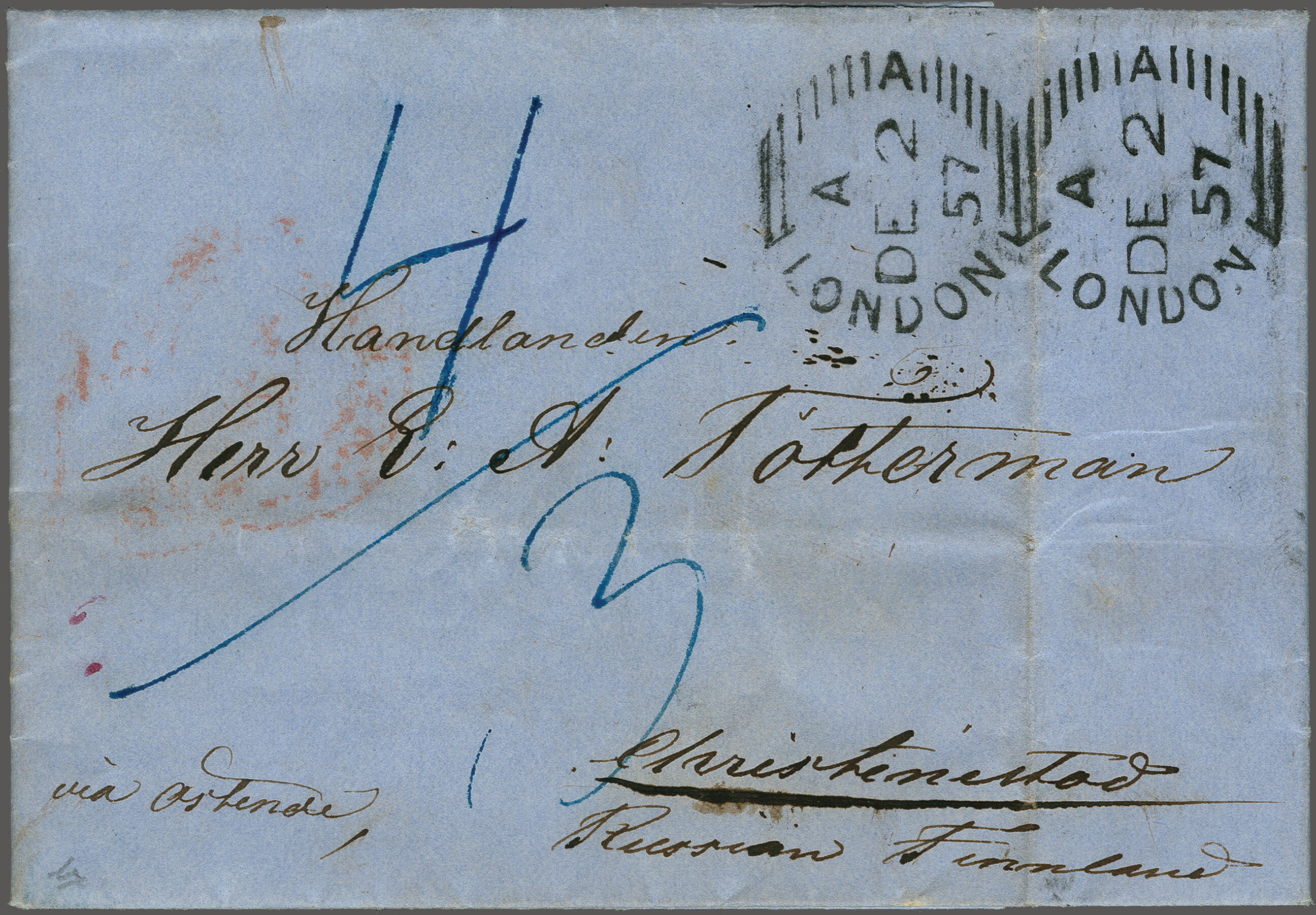 1857 (Dec 2): Unpaid entire letter from London to Christianestad, Russian Finland endorsed "via Ostende", struck with a superb impression of the London Pearson Hill Experimental second Trial machine datestamp, Machine 'A',