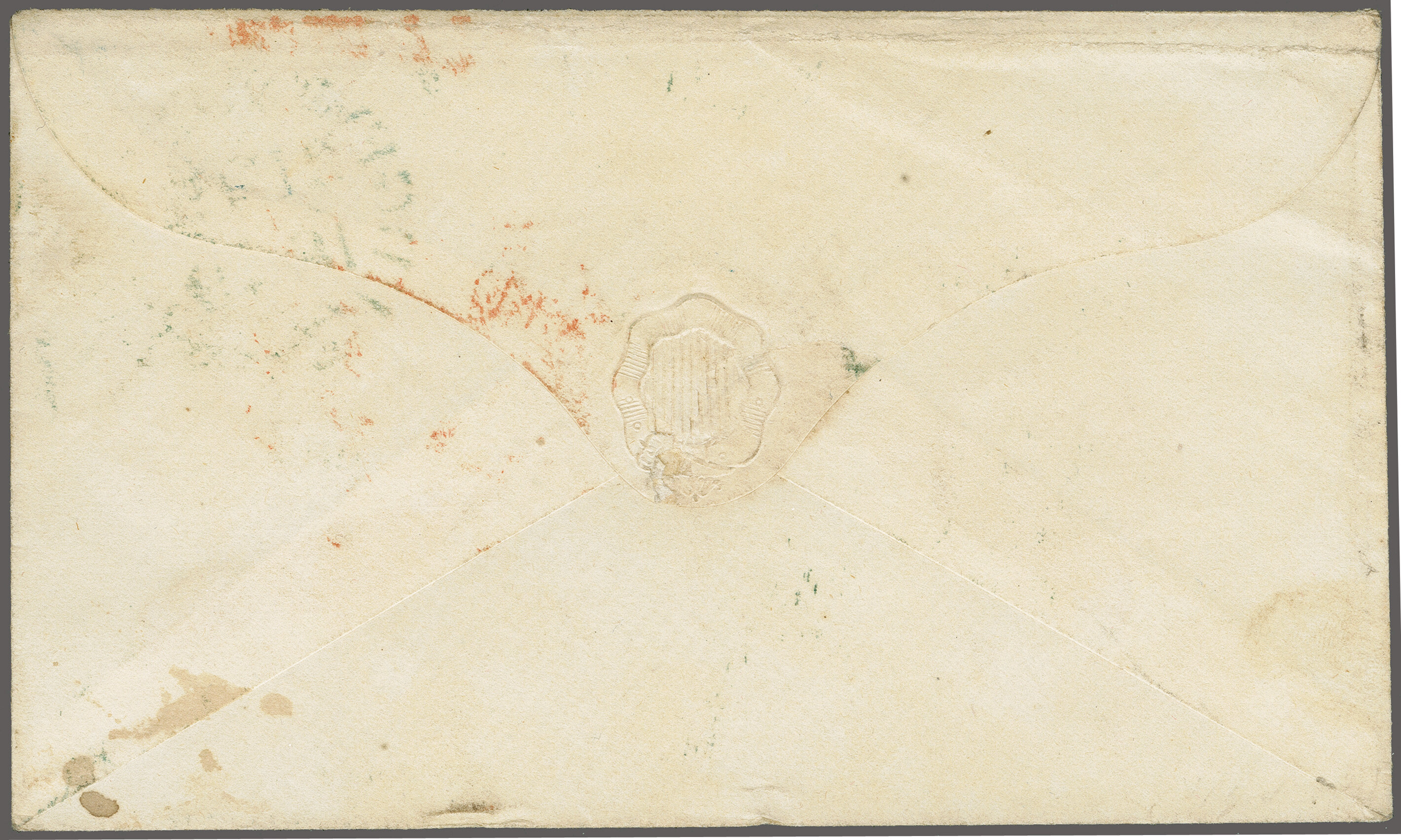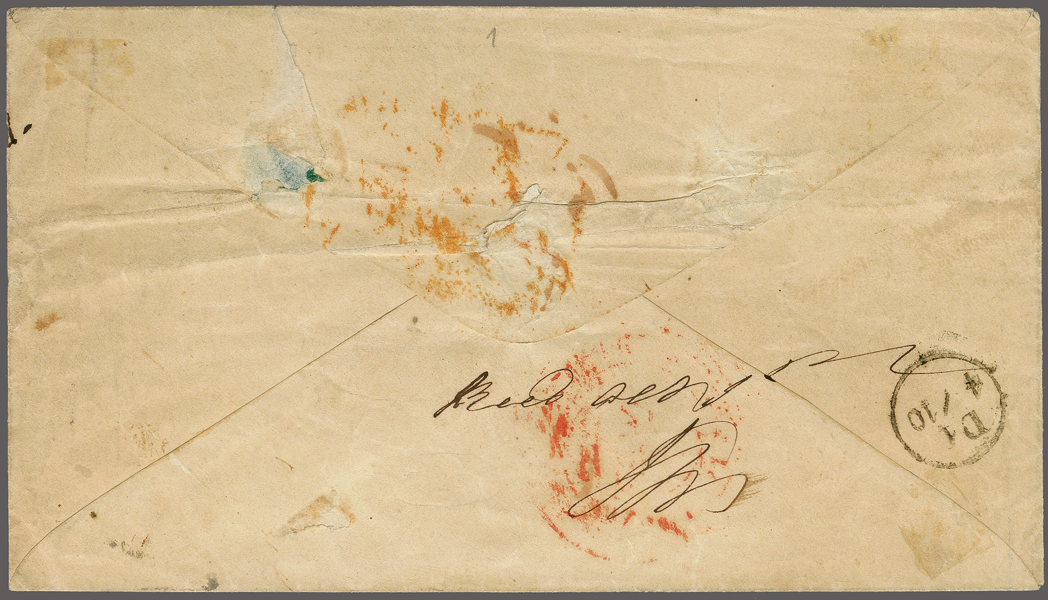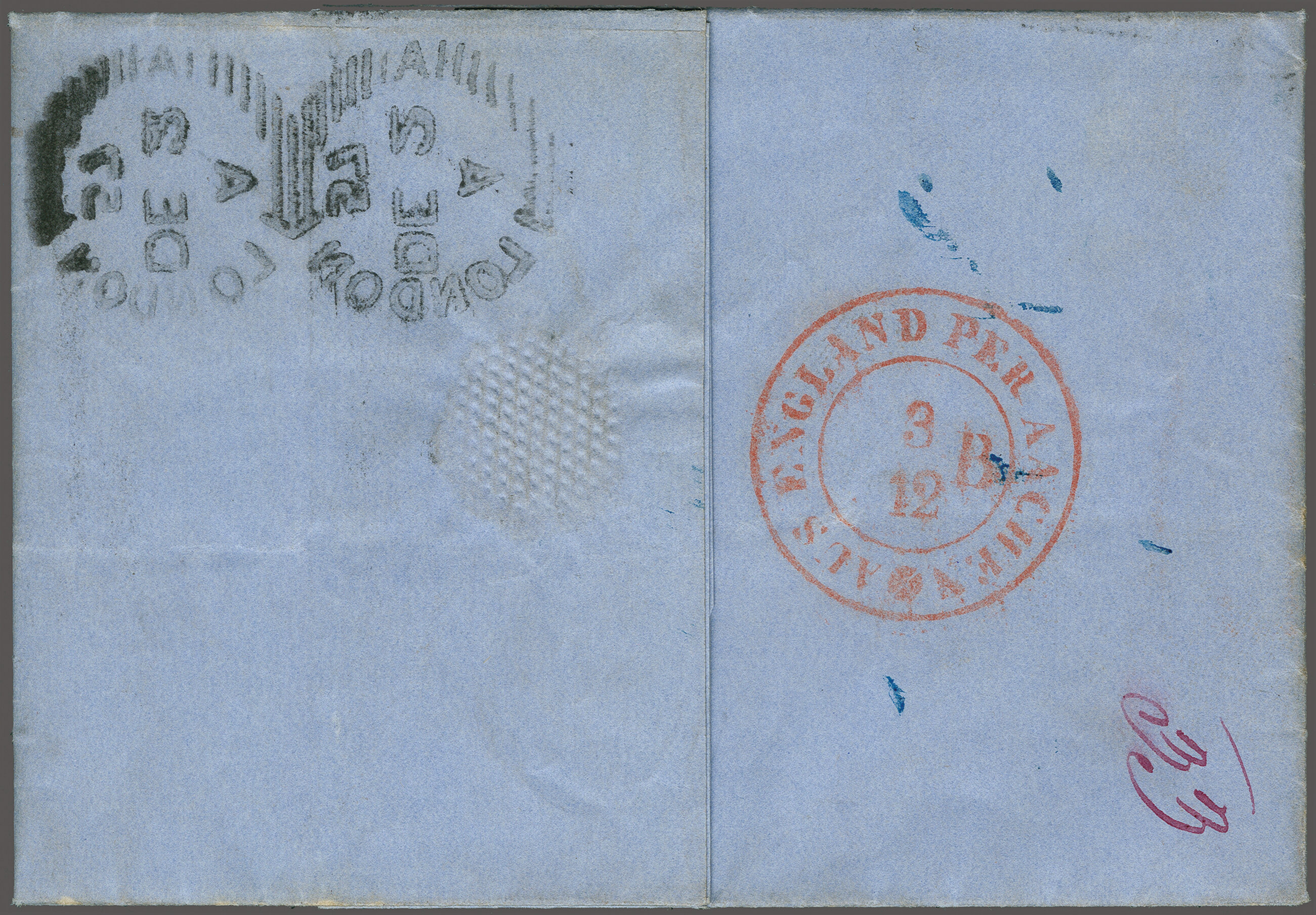 Time Code 'A', dated December 2, 1857 in black (Dubus 2). Reverse with offset impression and "AUS ENGLAND PER AACHEN" transit cds (Dec 3) in red and rated "4/3" in blue manuscript on obverse. An extraordinary and extremely rare overseeas usage.