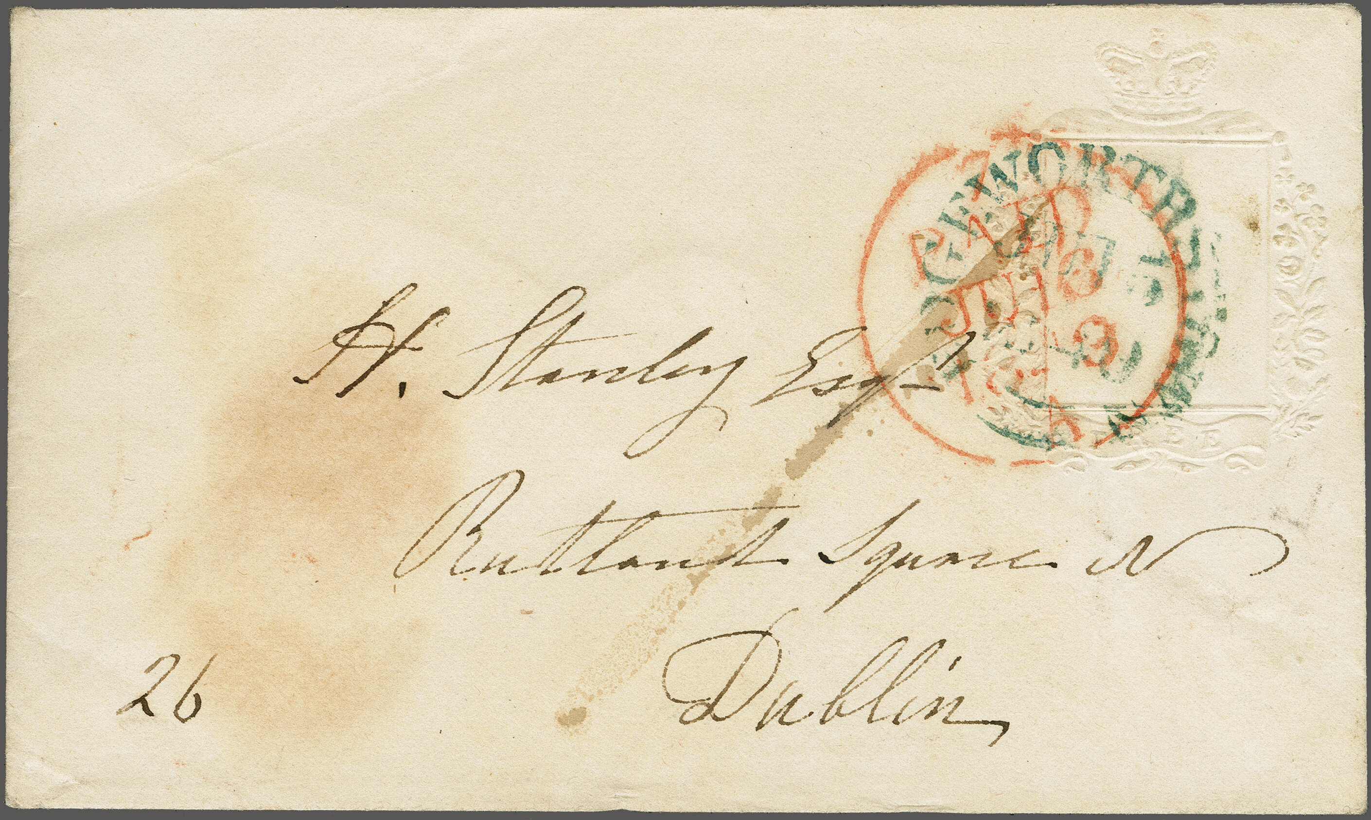 1846: Embossed "♚ / FREE" wreathed envelope sent prepaid to Dublin with "1" (penny) in manuscript, struck with fine EDGEWORTHSTOWN cds in green and Dublin arrival cds in red (June 16). A most attractive and unusual usage. (Image 1)