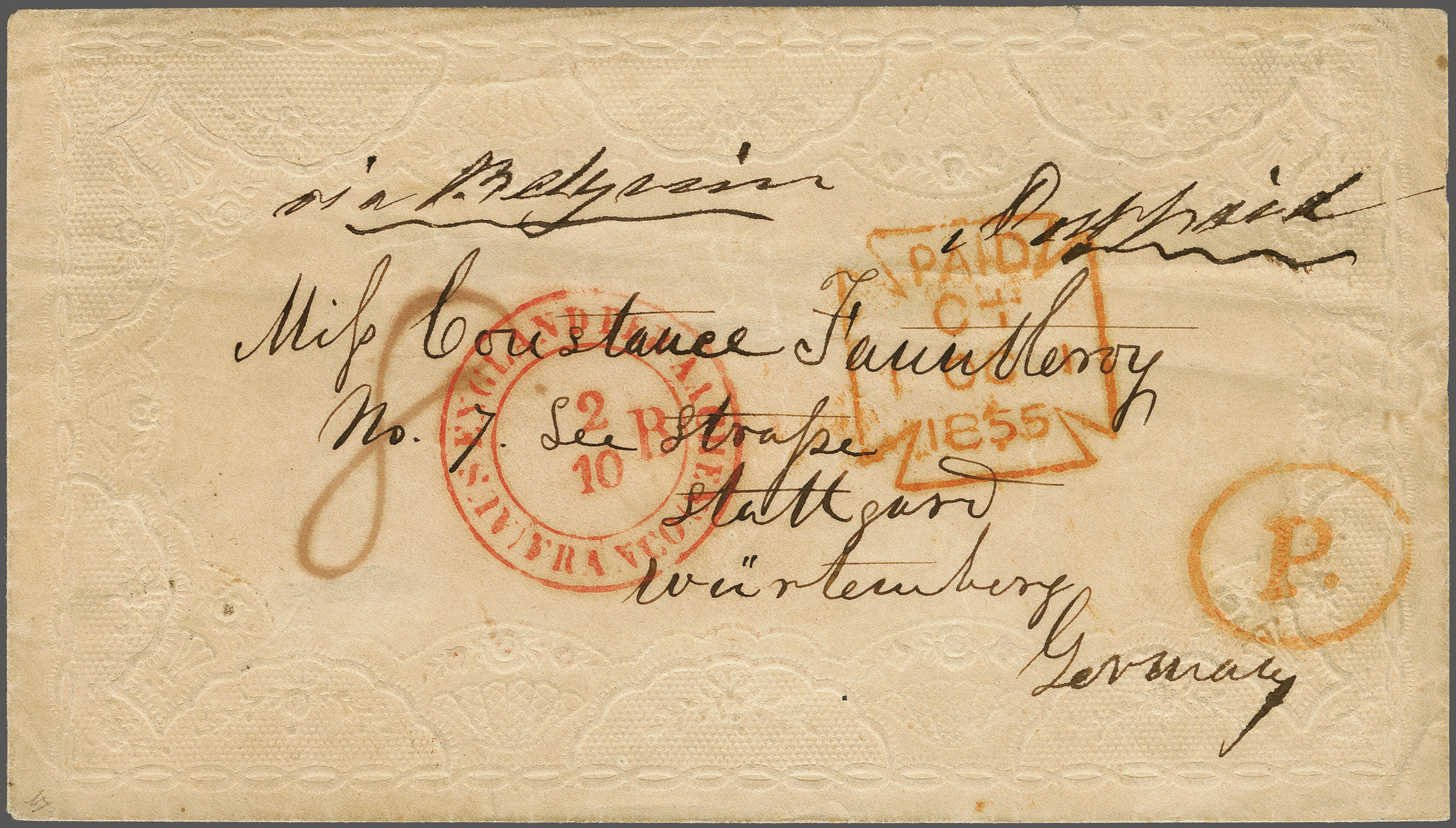 1855: Embossed envelope from London to Stuttgart, Württemberg endorsed "Post Paid" and "Via Belgium" at top, with manuscript "8" (pence) prepaid in cash and struck with London Maltese Cross "Paid" datestamp (Oct 1) in red with