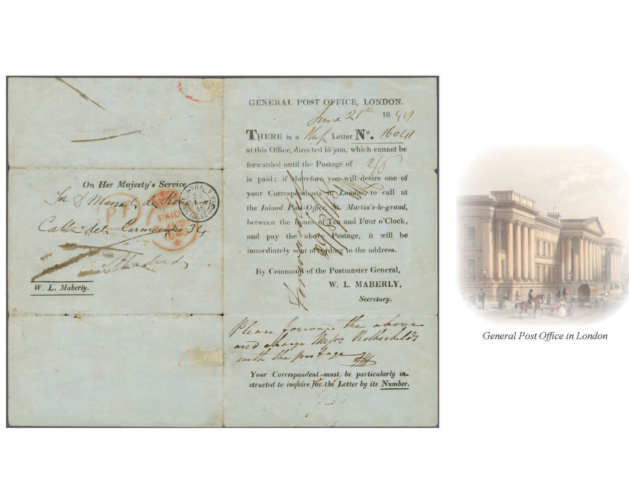 concerning the sum of 2 s. 6 d. outstanding with a request for the correspondent to call and pay this amount at the Inland Post Office at St. Martin's Le Grand, with reply at base that the sum is to be paid by Messrs. Rothschild's account, with
