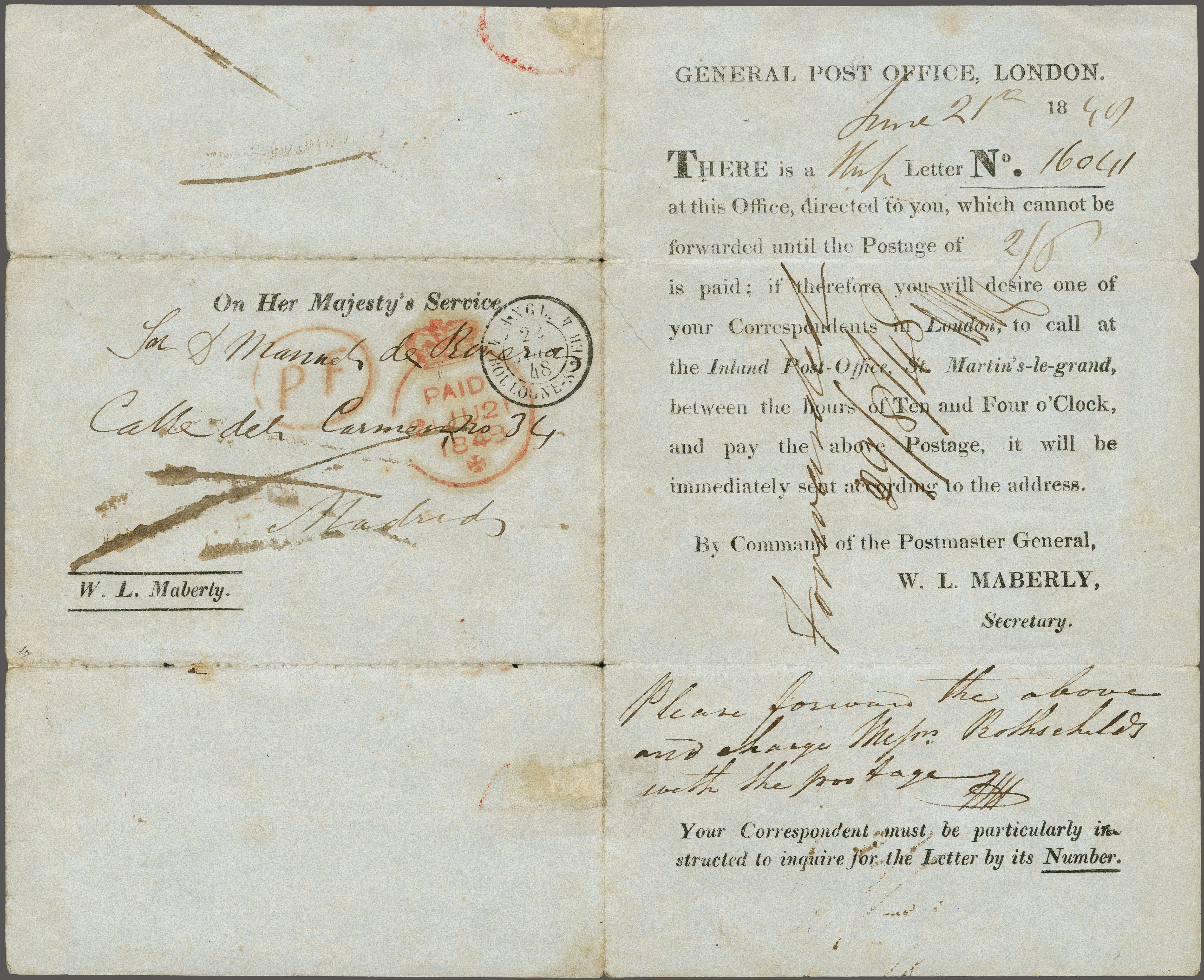 1848: OHMS printed entire endorsed from W.L. Maberley and sent from London to Madrid, Spain with "♚ / PAID" cds in red (June 21) and oval "PF", carried via Boulogne where treated as fully paid on arrival. Printed content