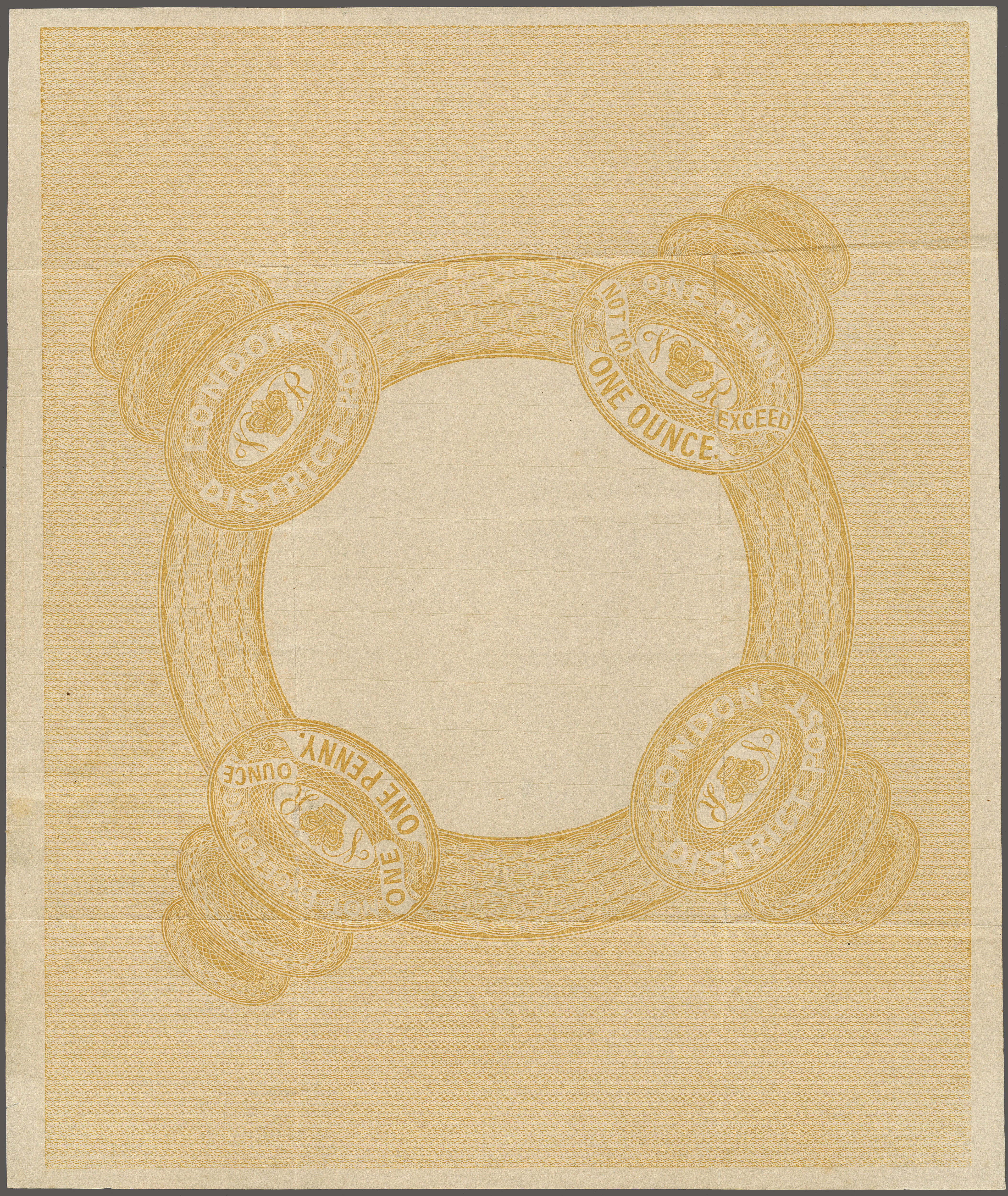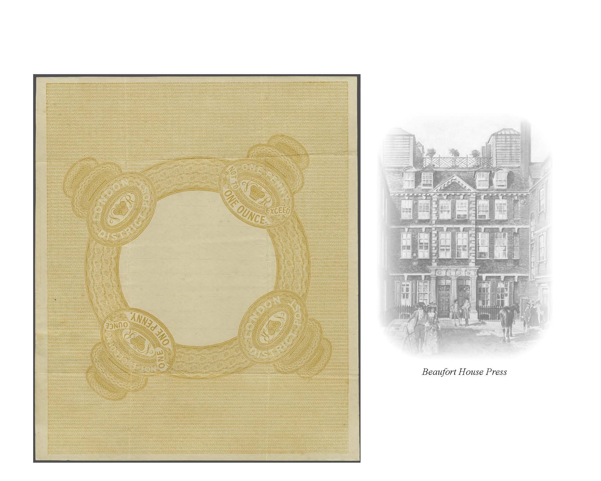 1837 (Feb-July): Essay by Charles Whiting included in Rowland Hill's pamphlet of February 1837 with proposed LONDON DISTRICT POST 1 d. for 1 ounce letter-sheet, printed on Dickinson silk thread paper (10 blue threads) in