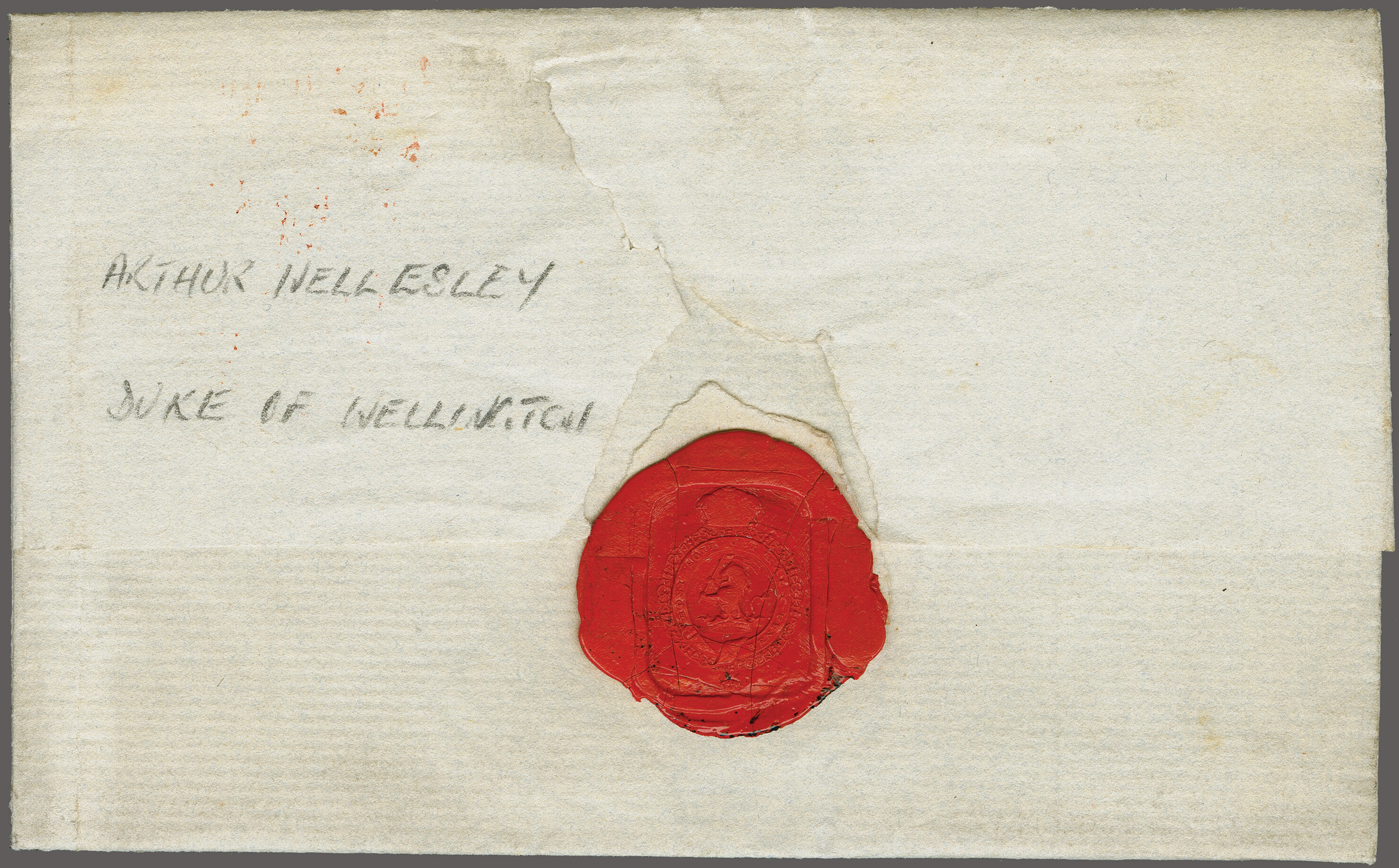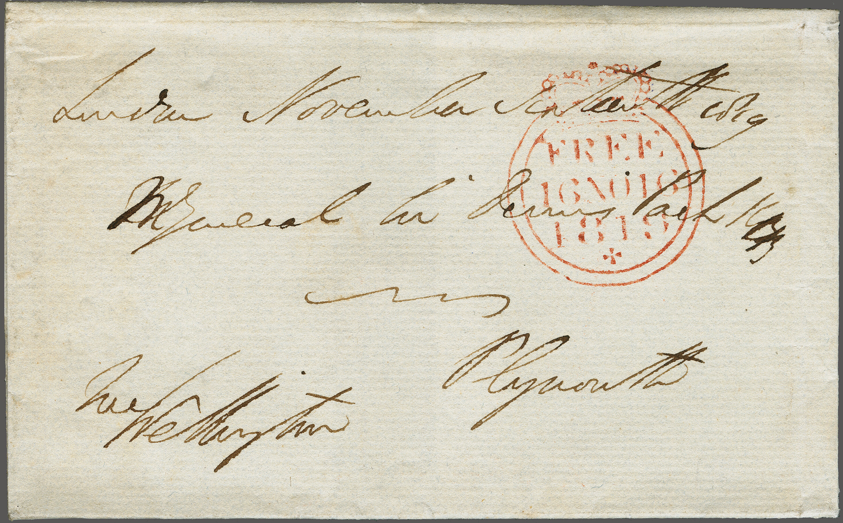 1819: Cover from London to Plymouth, Devon carried free of charges under franking privilege, both written and endorsed "Wellington" at lower left and struck with "♚ / FREE / 16 NO 16 / 1819" datestamp in red. Field Marshall
