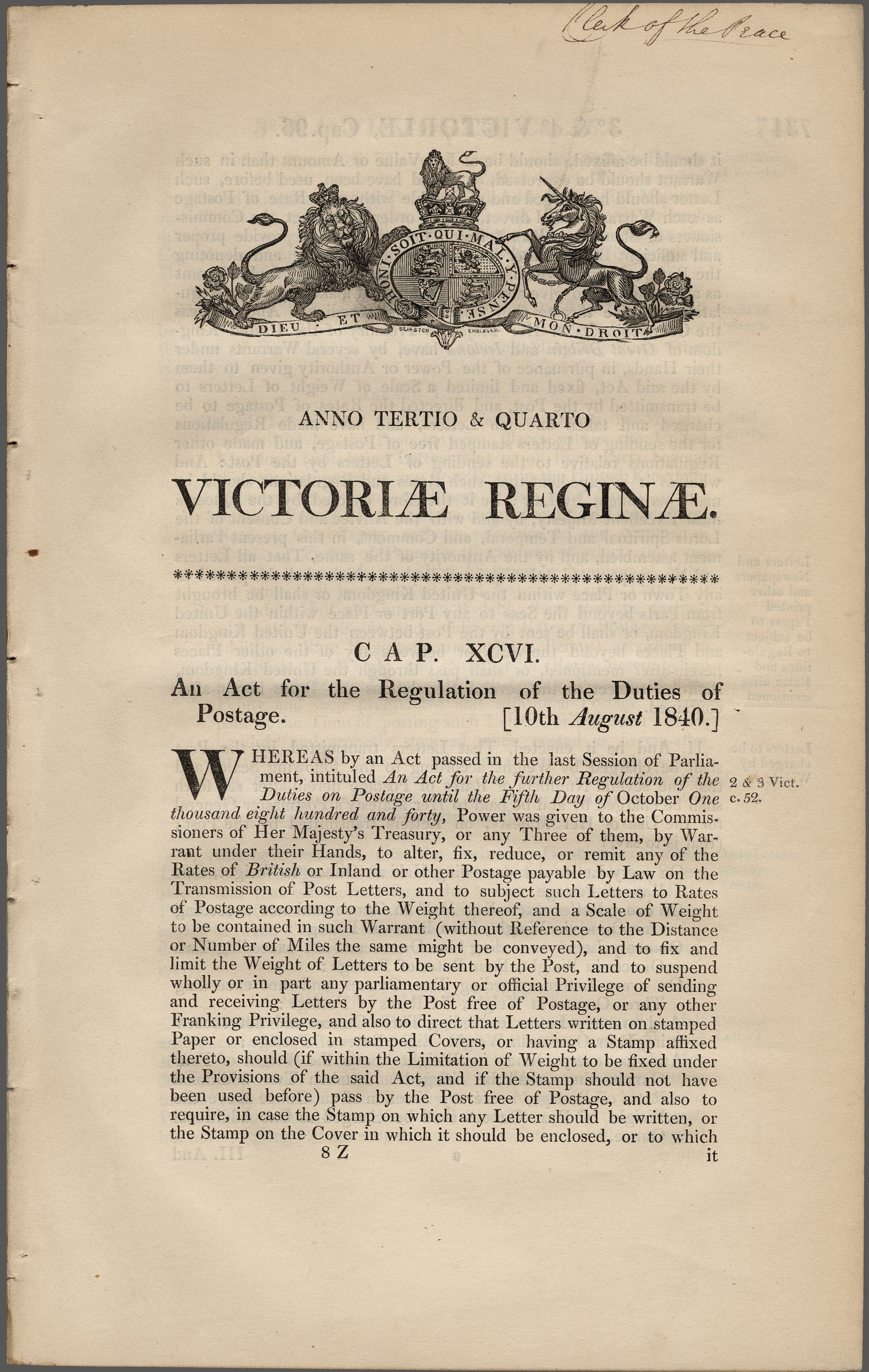 1840 (Aug 10): "An Act for the Regulation of the Duties of Postage", folio of 30 sides (192 x 302 mm.), with contemporary docketing at top "Clerk of the Peace", the Act replacing all earlier postal regulations and containing