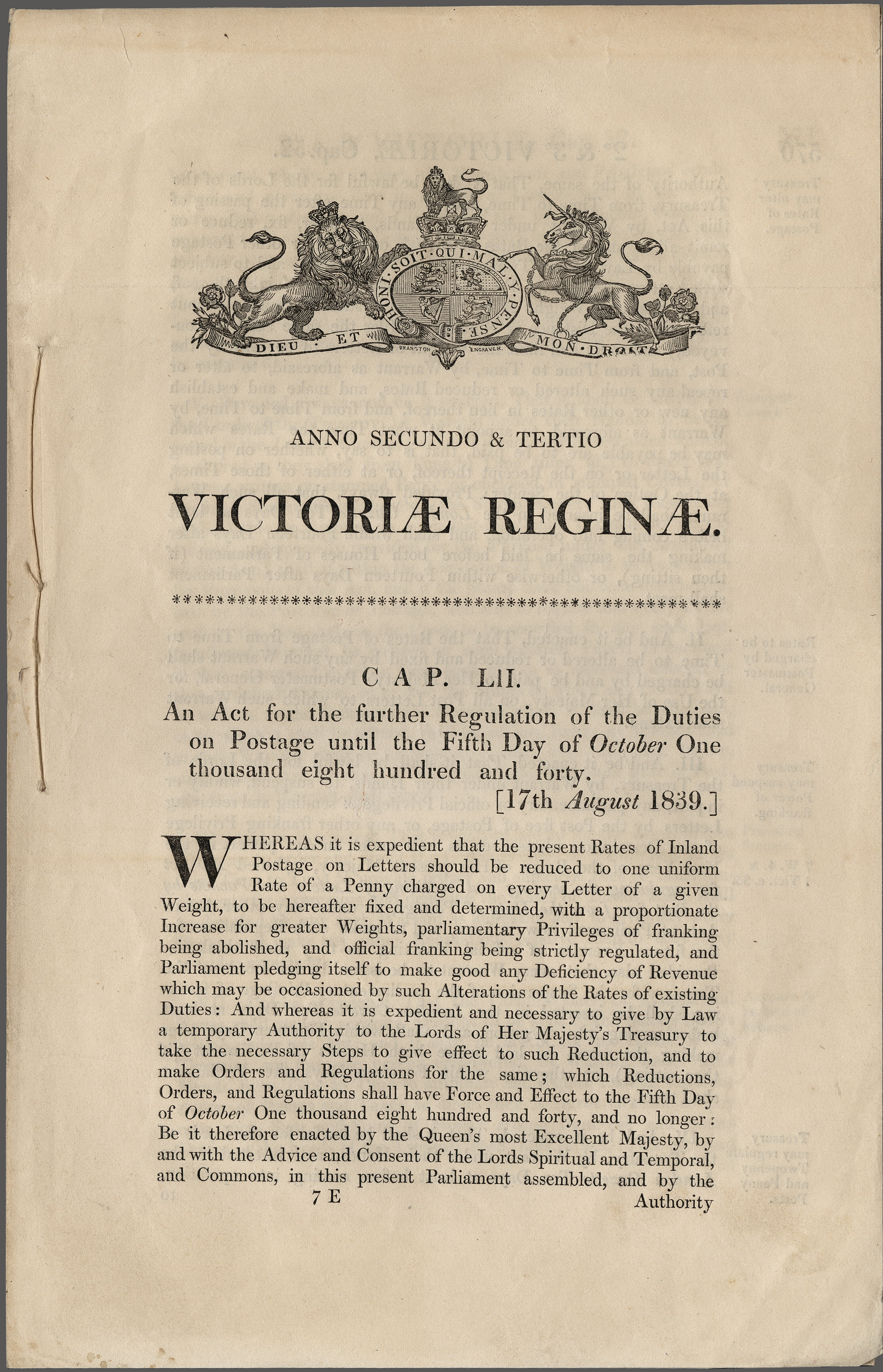 1839 (Aug 17): An Act for the Further Regulationof the Duties of Postage until the 5th day of October 1840 (192 x 302 mm.), announcing "Letters written on stamped paper or enclosed in stamped covers, or having a stamped