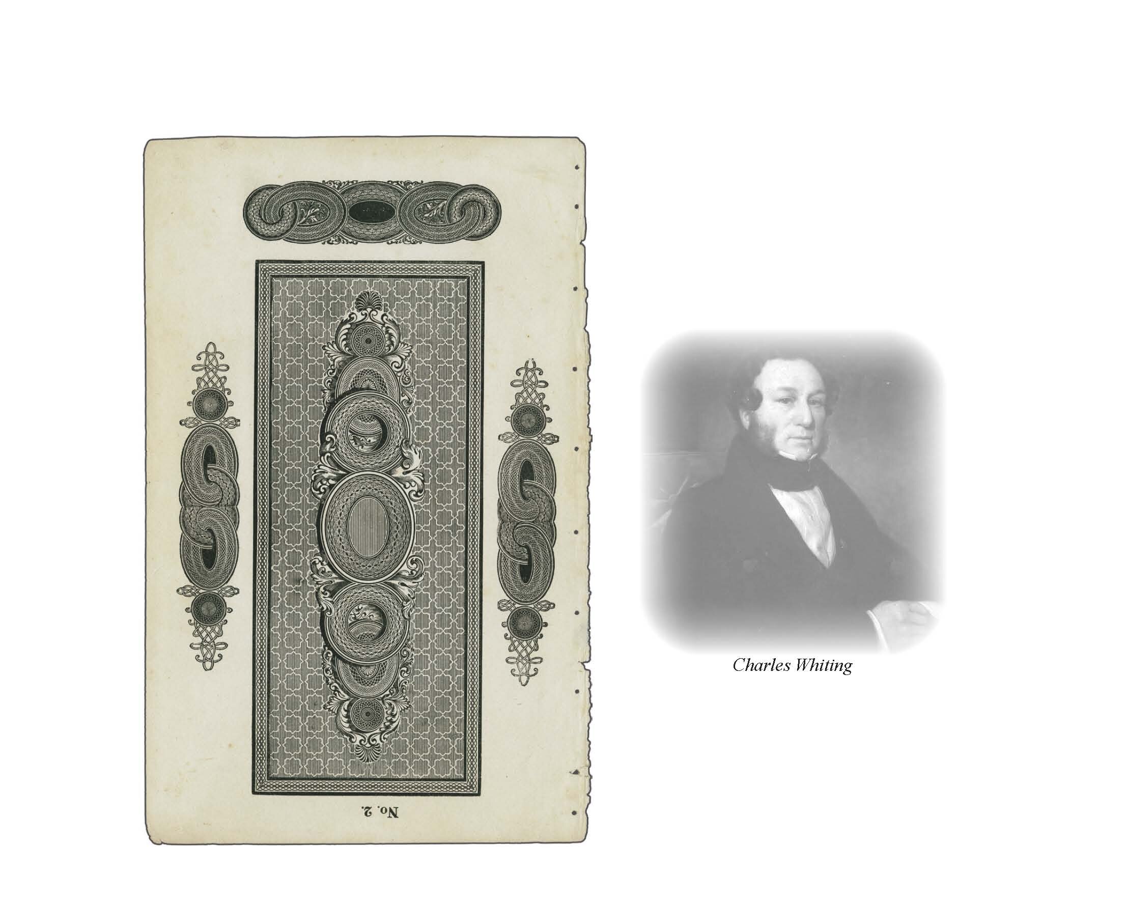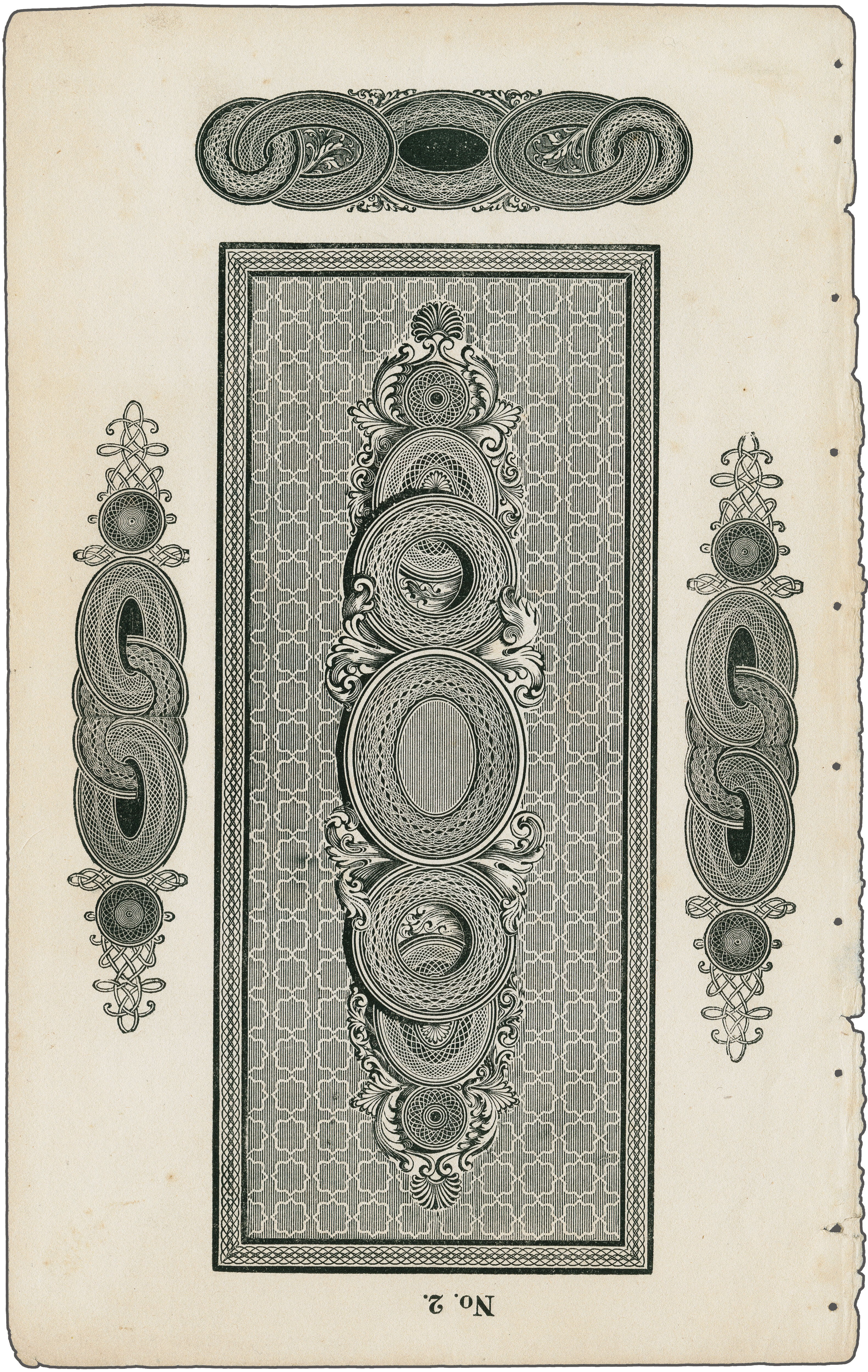 1838/40: Charles Whiting: Page headed "No. 2" demonstrating the prowers of Engine Turning Essay (132 x 22 mm.) in the prevention of forgery to be utilised in the "stamped covers" or "postage labels", beautifully printed in