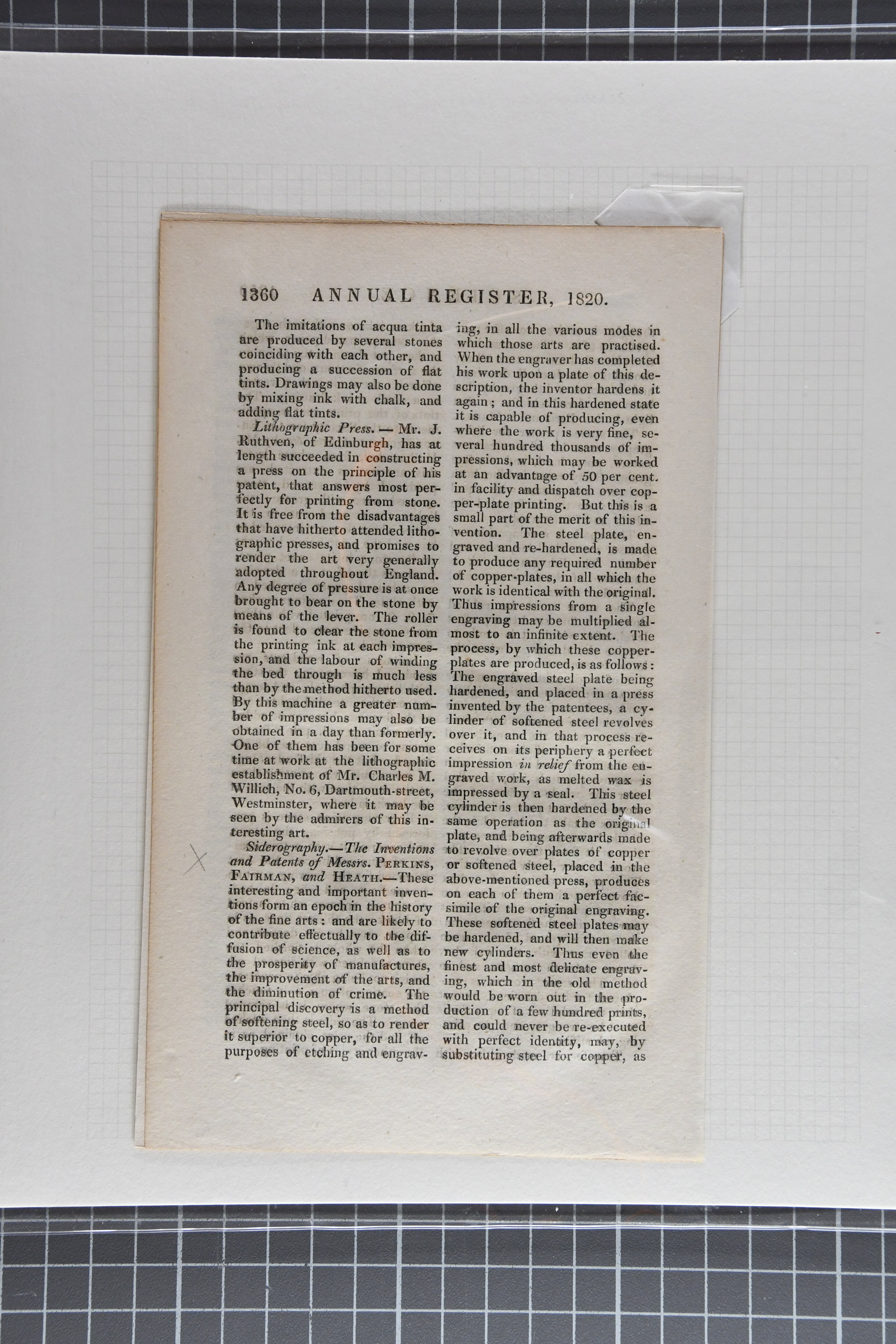 1820: Three double sided pages from "The Annual Register" on printing with listing under "Fine Arts" concerning Lithography (page 1353) and the Lithographic Press, and interesting notes on "Siderography - The